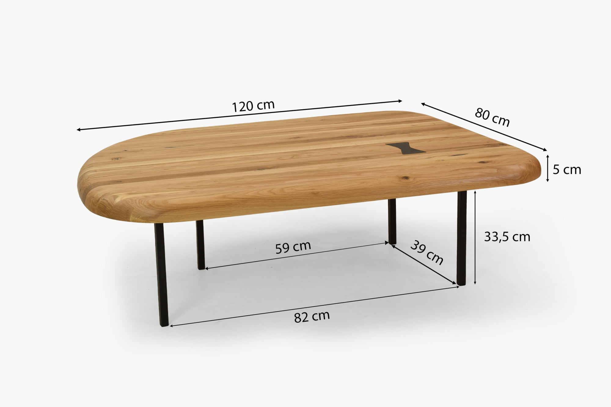 Holz-Couchtisch Lolek Eiche bringt ungezwungene Eleganz von echtem Massivholz ins Wohnzimmer. Die Tischplatte aus Eichenholz mit einer Stärke von bis zu 5 cm hat eine einzigartige, unregelmäßige Form, die von organischen Linien der Natur inspiriert ist; ihre abgerundeten Kanten bieten nicht nur visuelle Weichheit, sondern auch Sicherheit im täglichen Gebrauch. Die Oberfläche ist sorgfältig gebürstet und mit natürlichem Öl behandelt, um die charakteristischen Jahrringe der Eiche hervorzuheben und eine lange Lebensdauer zu gewährleisten. Das Holz trägt FSC-Zertifikat, sodass Sie sich der nachhaltigen Herkunft sicher sein können.