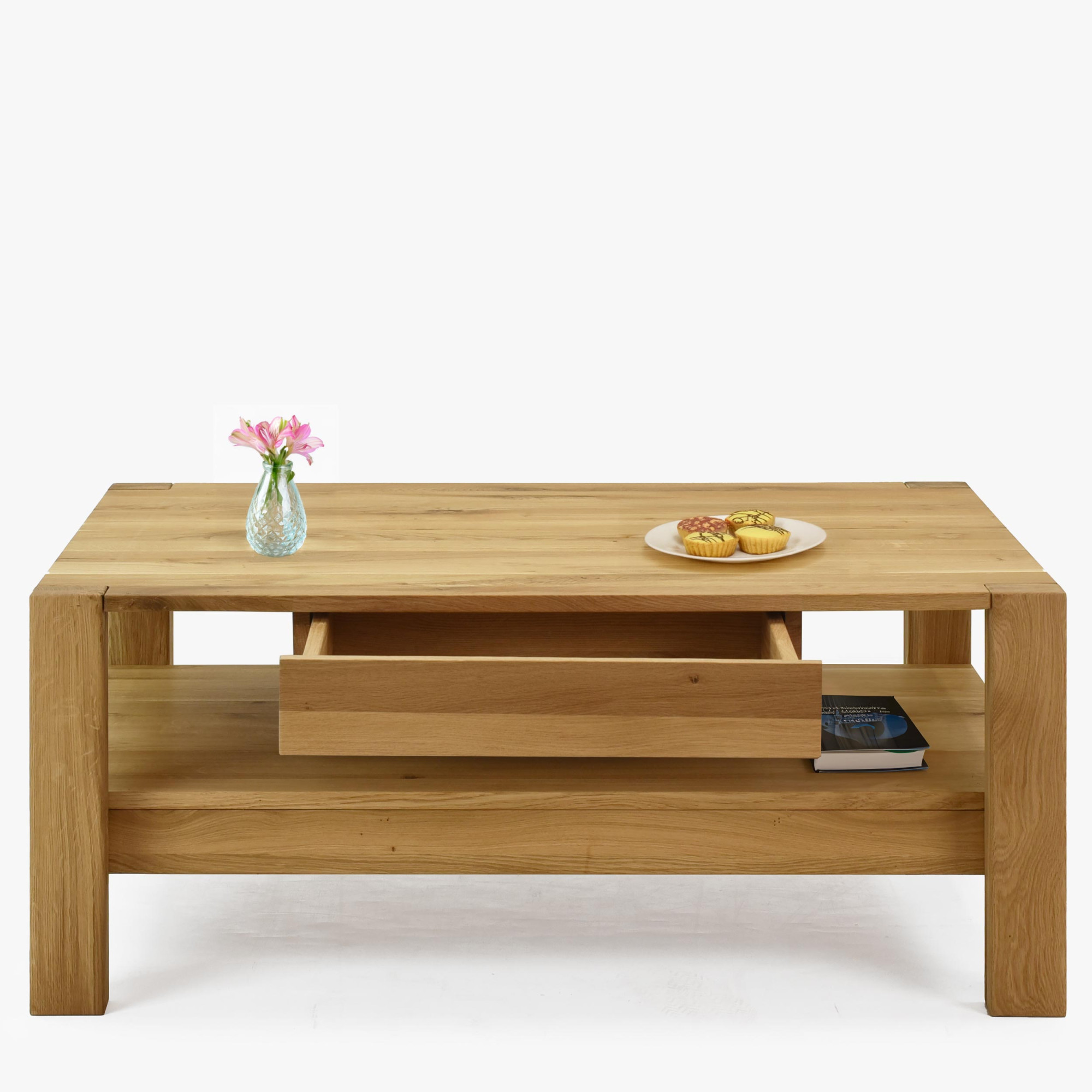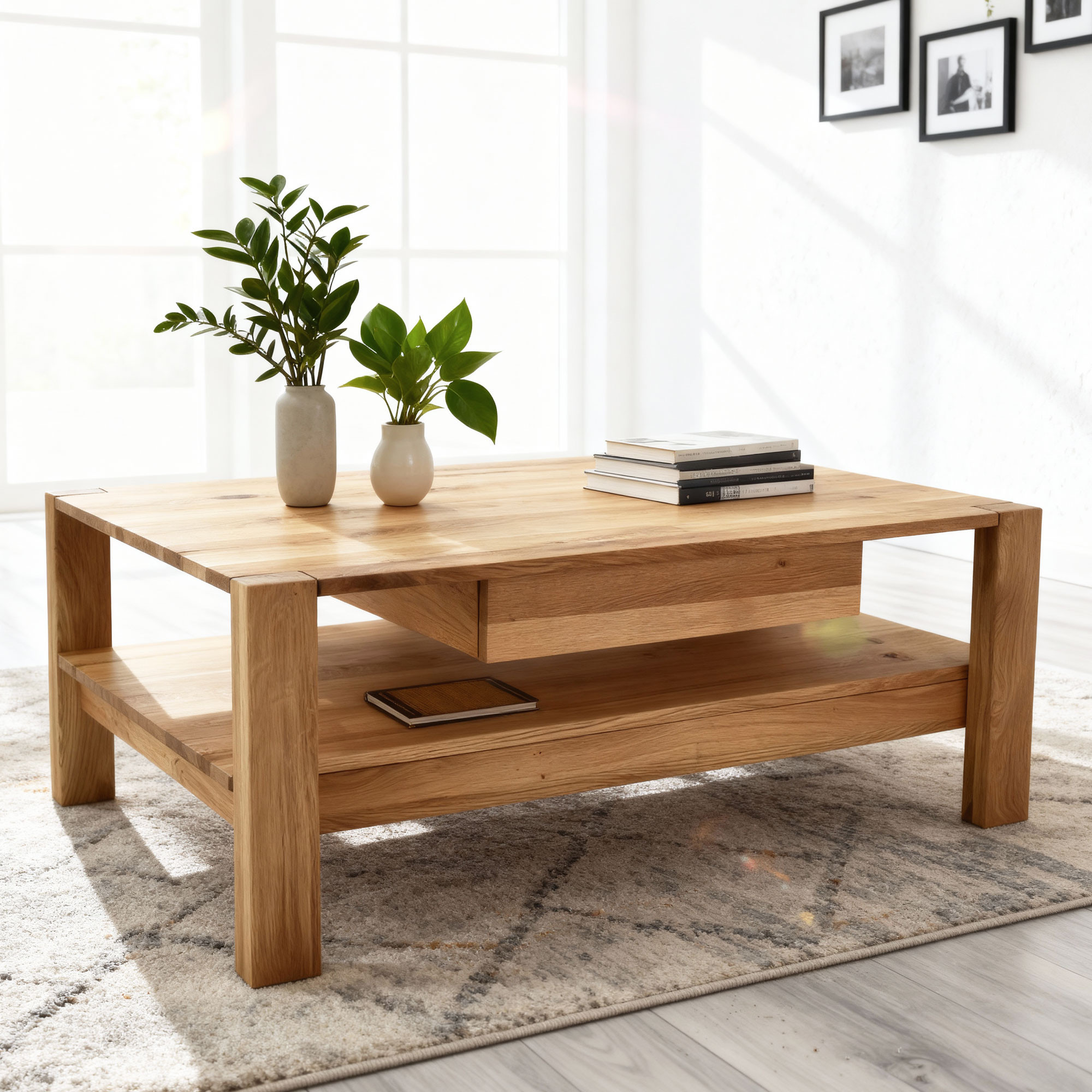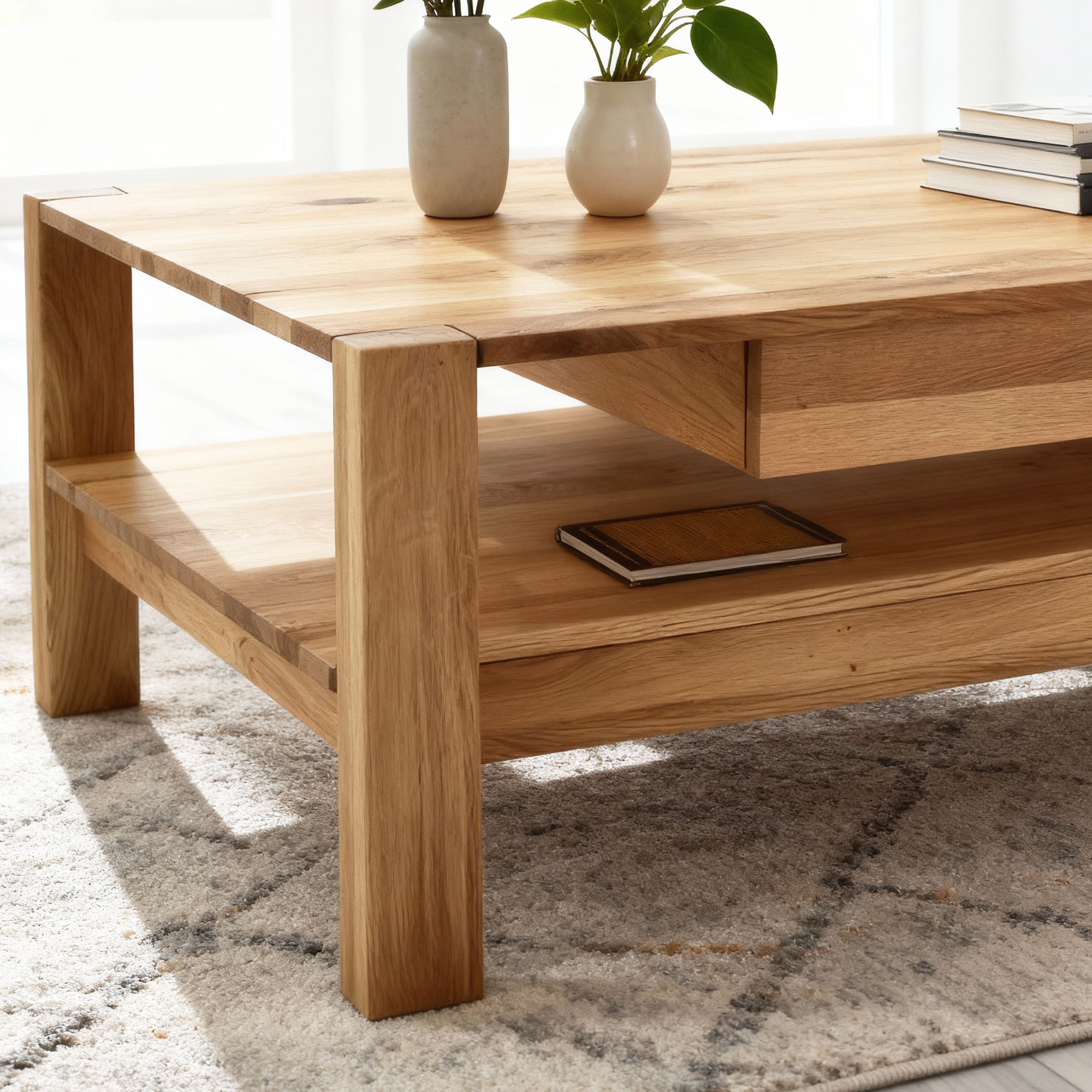 Massiver Eichenholz-Couchtisch 110x70 cm mit Ablage natur