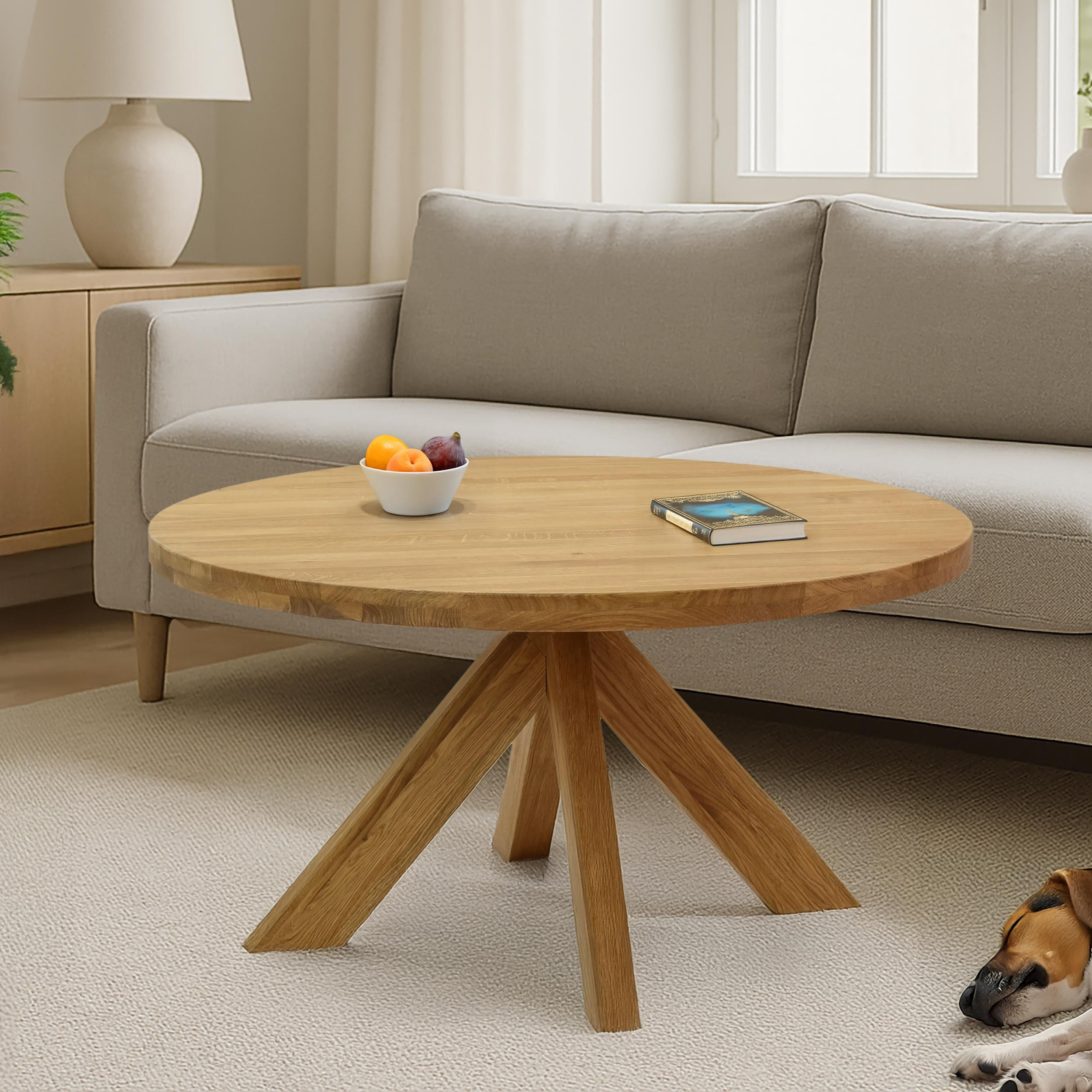 Ein runder Holztisch mit gekreuzten Beinen und einem Durchmesser von 90 cm ist die ideale Wahl für jeden Haushalt, der ein stilvolles und funktionales Möbelstück aus natürlichem Material sucht. Das Modell Holger ist aus Eichenholz gefertigt, das sich durch hohe Festigkeit und lange Lebensdauer auszeichnet. Die Oberflächenbehandlung mit talinischem Öl im Farbton Eiche Natural schützt die Oberfläche und verleiht einen zarten goldenen Schimmer, der sich mit der Zeit noch vertieft. Die massive Konstruktion sorgt für Stabilität, sodass Sie sich keine Sorgen über Wackeln oder Beschädigungen machen müssen. Der Tisch hat einen Durchmesser von 90 cm und eine Höhe von 47,5 cm. Die Plattendicke beträgt 2 cm (an den Rändern bis zu 4 cm), was zu einem robusten und markanten Erscheinungsbild beiträgt. Das Produkt wird zerlegt geliefert, der Zusammenbau ist jedoch dank der übersichtlichen Anleitung einfach.