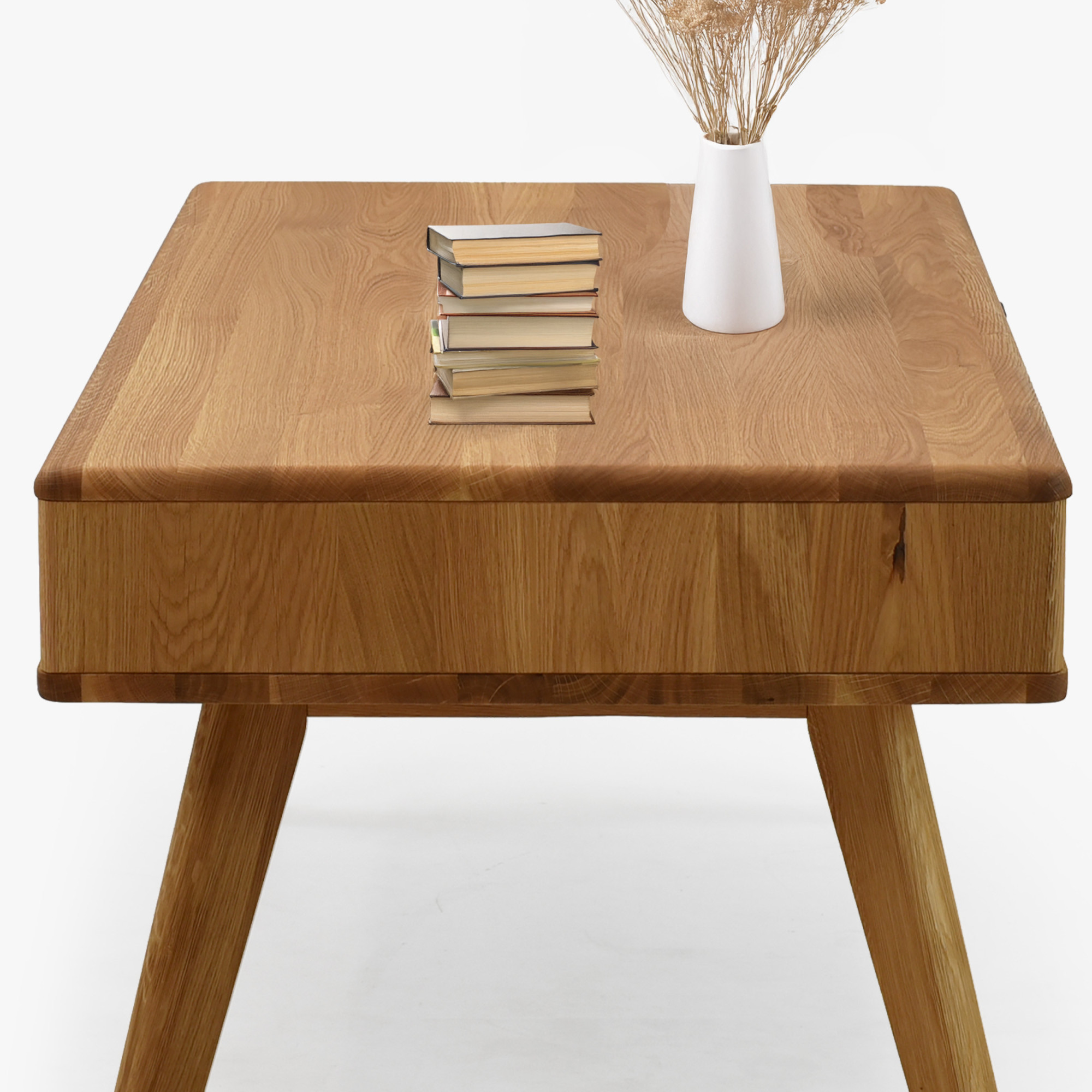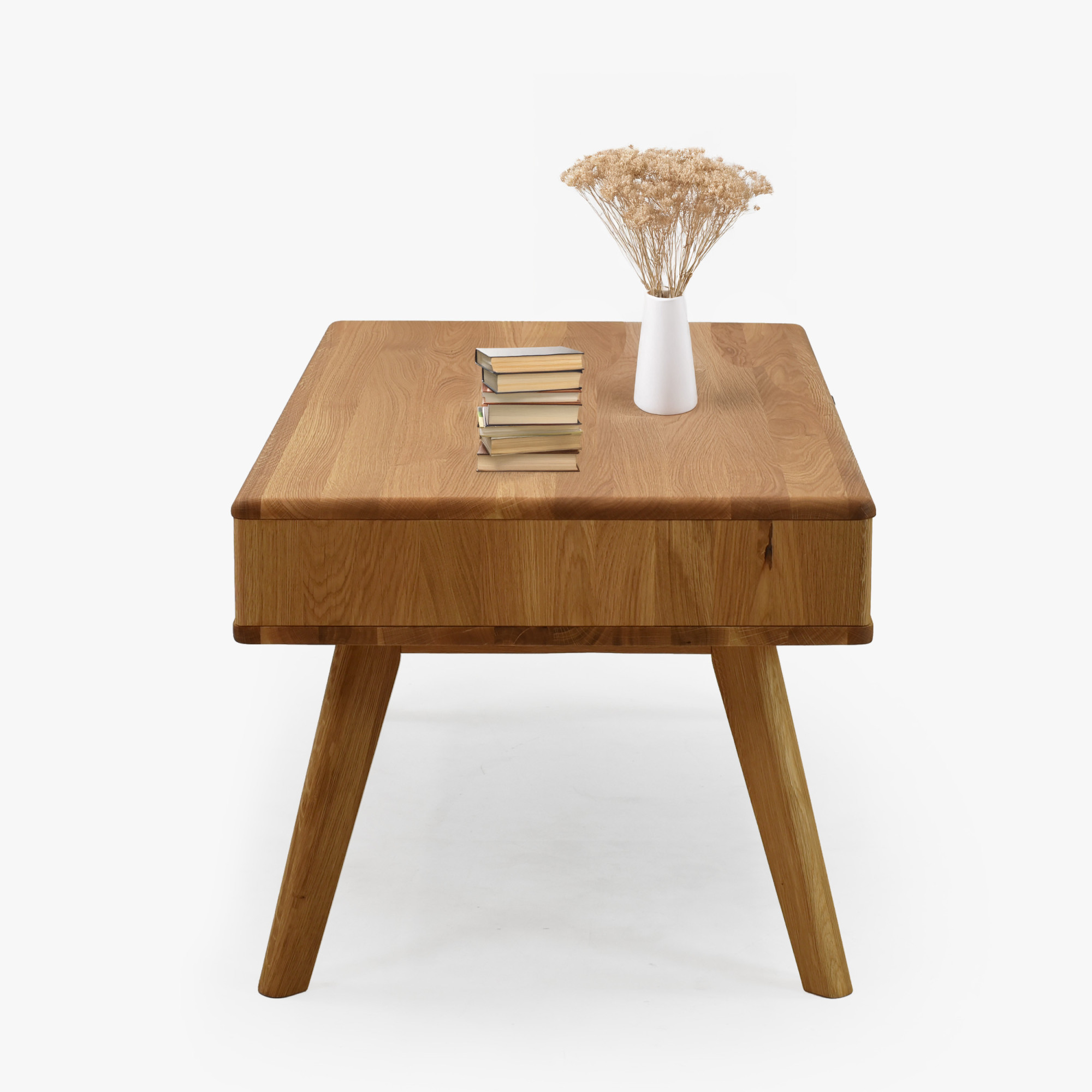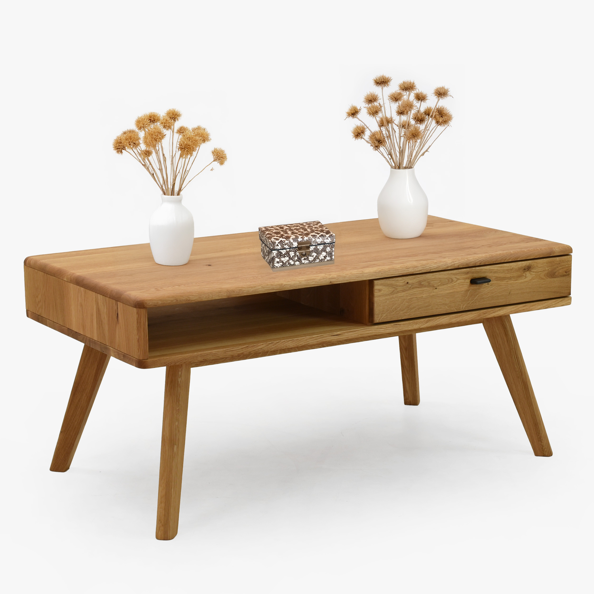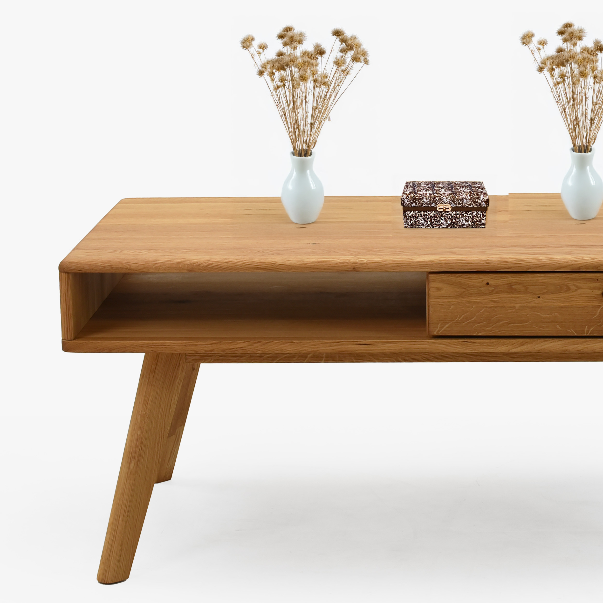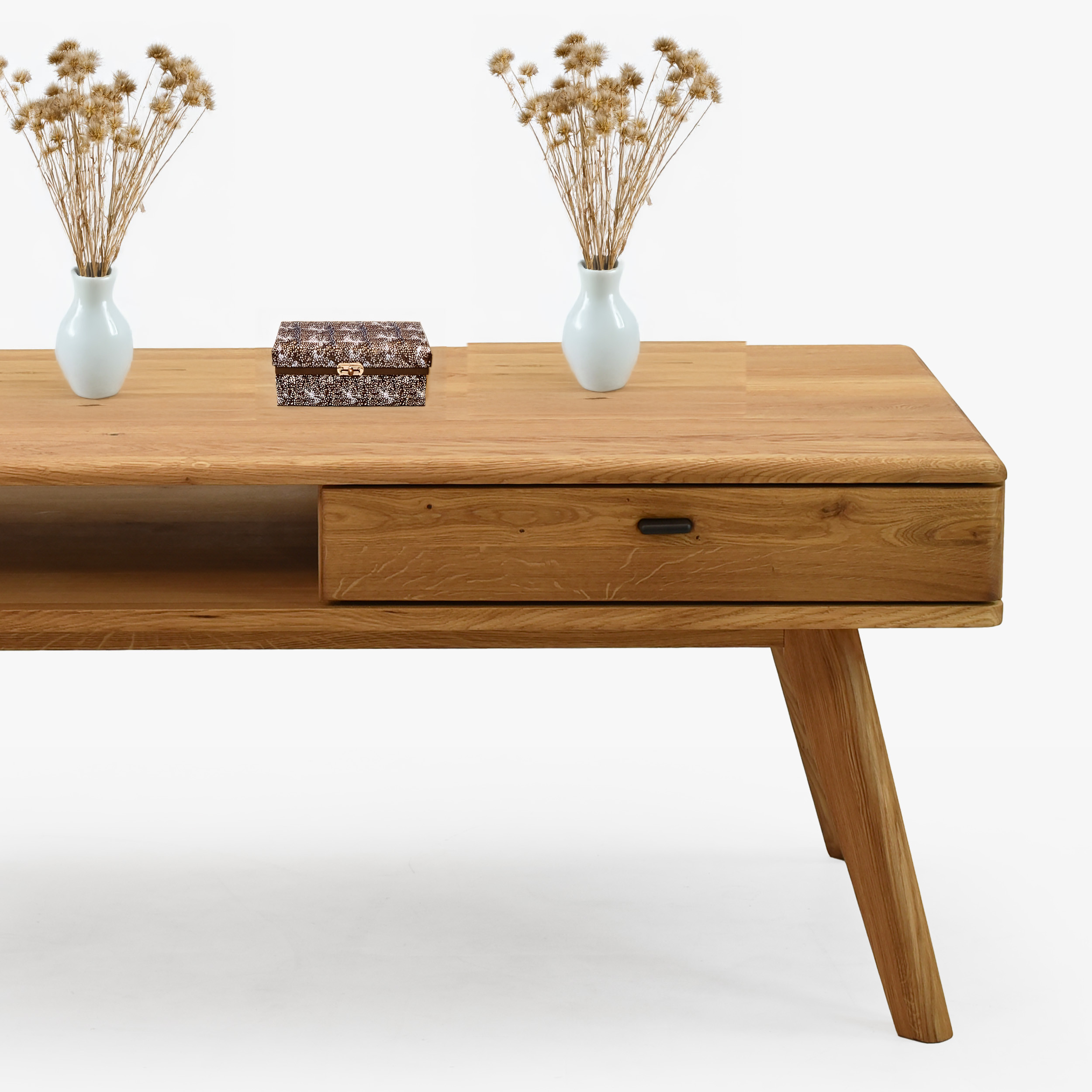 Kaffeetisch aus Eichenholz mit den Maßen 110 × 60 cm besticht durch elegantes und zeitloses Design, das jedes Interieur schön ergänzt. Er ist Teil der Serie Jánošík, die für ehrliches Handwerk, Qualität und natürlichen Stil steht. Der Tisch wird in einer Kombination aus massiver Eiche (Tischplatte, Fronten, Beine und tragende Teile) und Premium-Eichenfurnier (Seiten und Korpus) gefertigt, was Festigkeit, Stabilität und lange Lebensdauer garantiert. Auf einer Seite befindet sich eine praktische Schublade, ideal zum Verstauen von Kleinigkeiten, Fernbedienungen oder Notizbüchern.