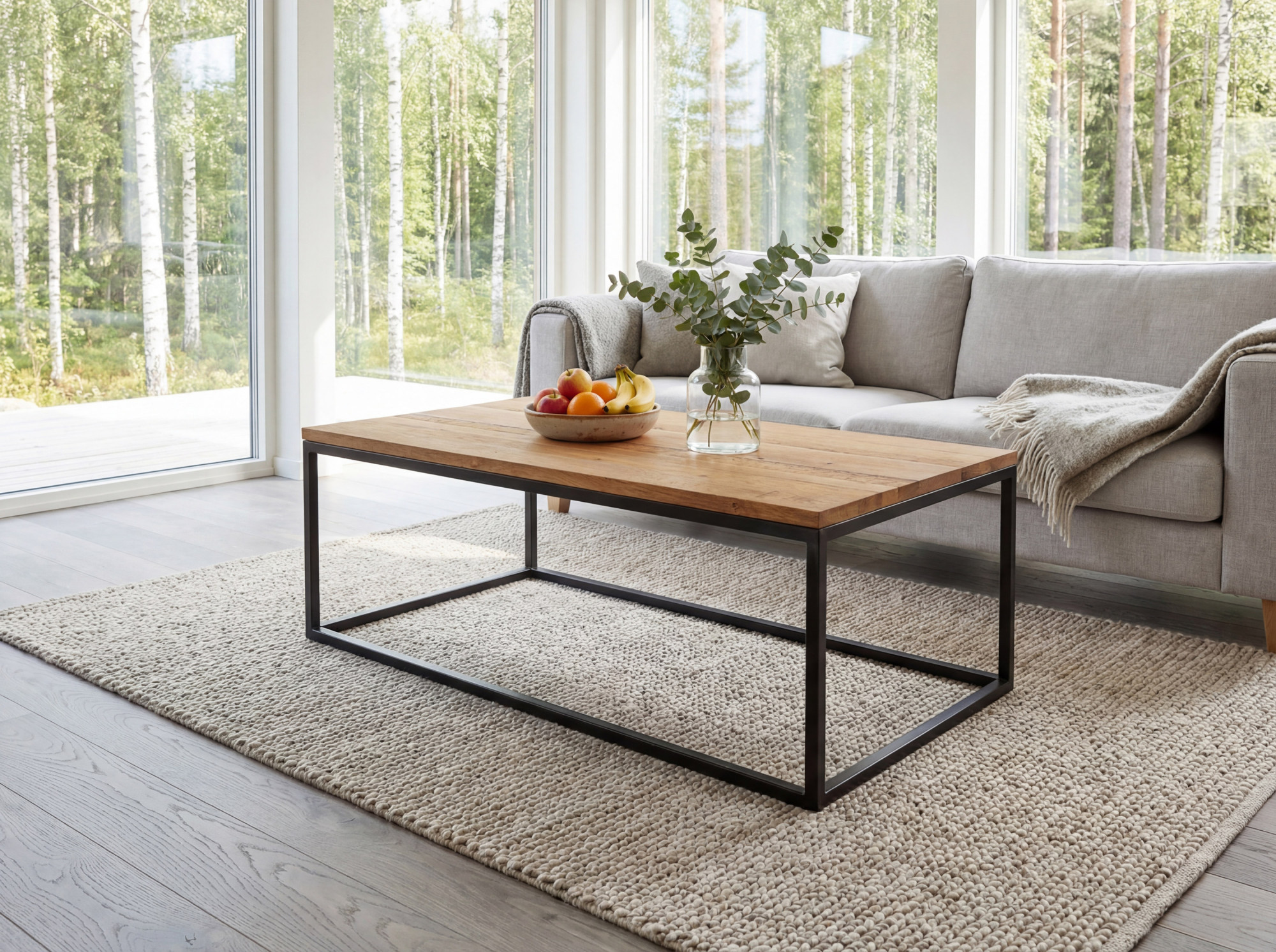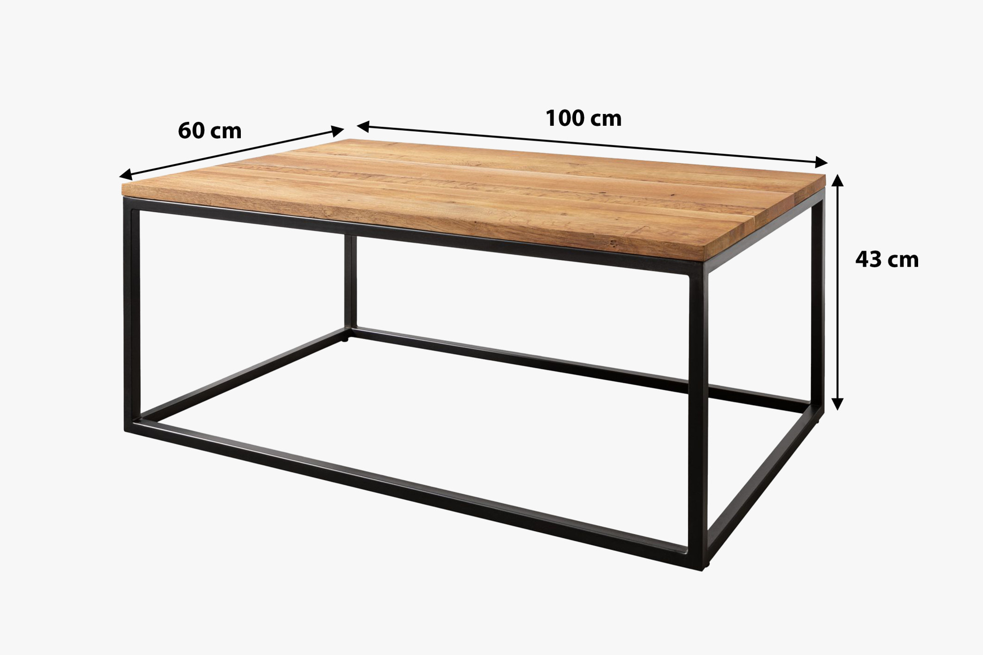 Dunkle Metallbeine aus lackiertem Stahl bilden eine luftige Konstruktion, die dem Tisch ein modernes Industrie-Aussehen verleiht und zugleich maximale Stabilität garantiert. Der elegante Kontrast zwischen massivem Holz und klaren Metalllinien ermöglicht eine einfache Integration dieses Couchtisches aus Eiche in eine breite Palette von Einrichtungsstilen – von modern über skandinavisch bis rustikal. Mit einer Höhe von 43 cm ist der Tisch ideal für die meisten Sitzgarnituren. Die auffällige Materialkombination geht mit der Zeit und bringt zeitloses Design in Ihr Zuhause.