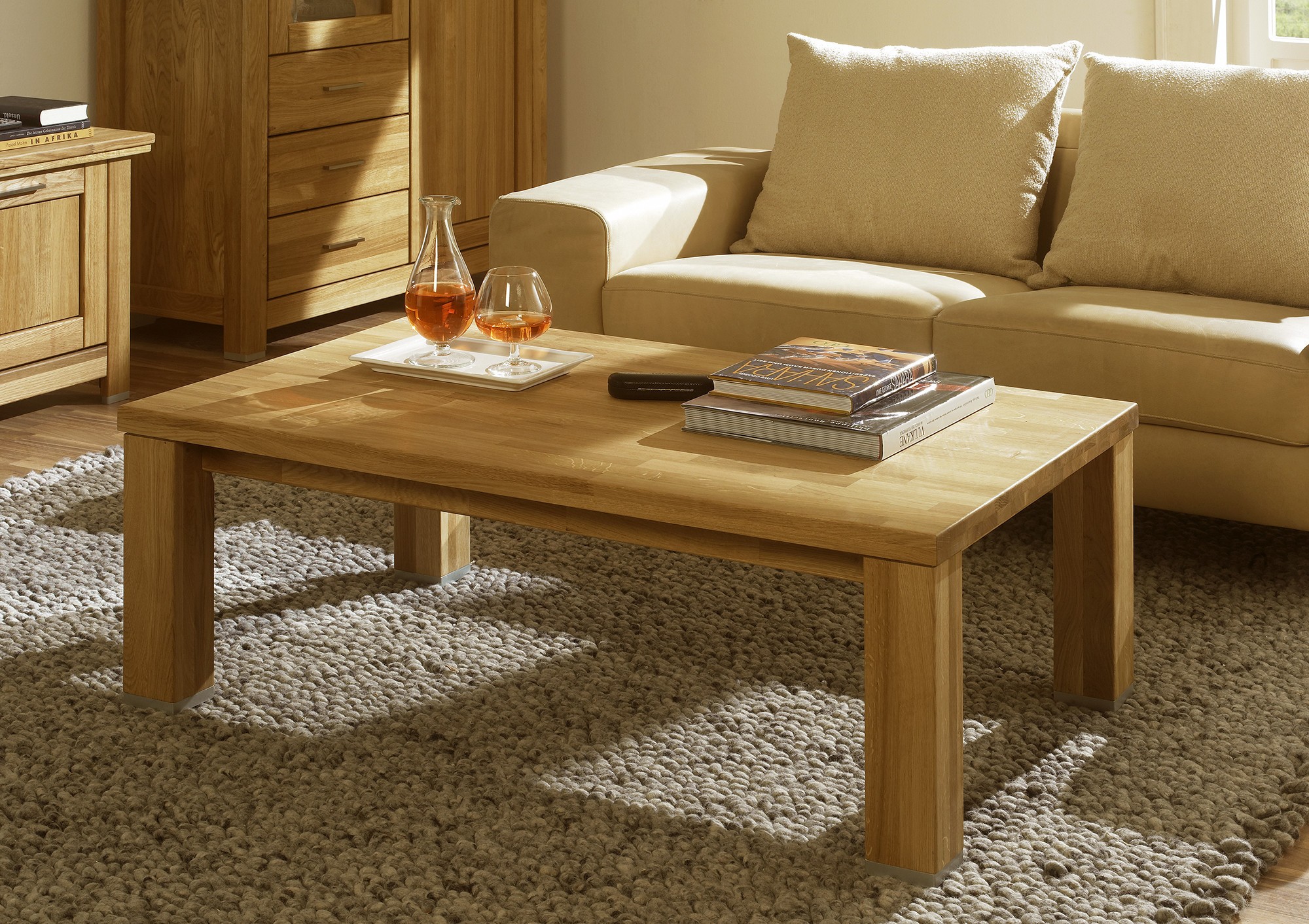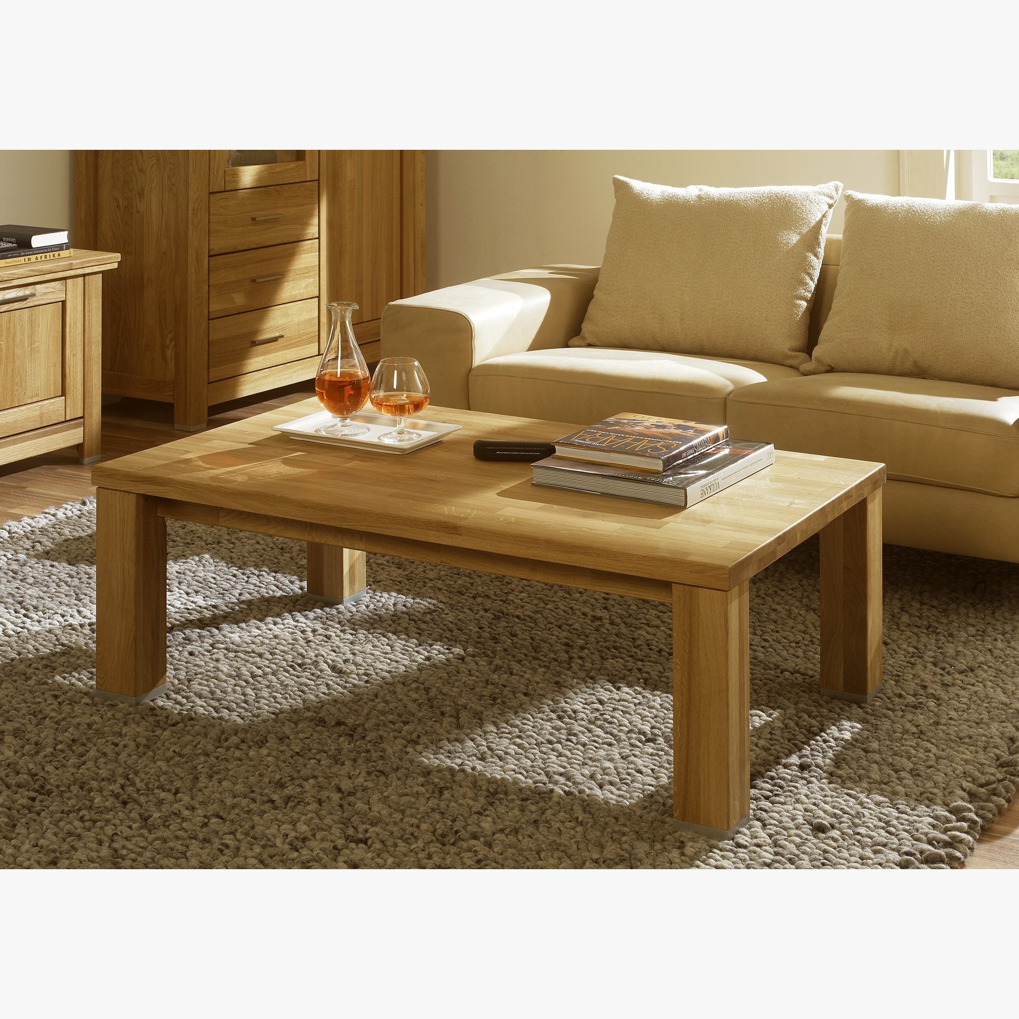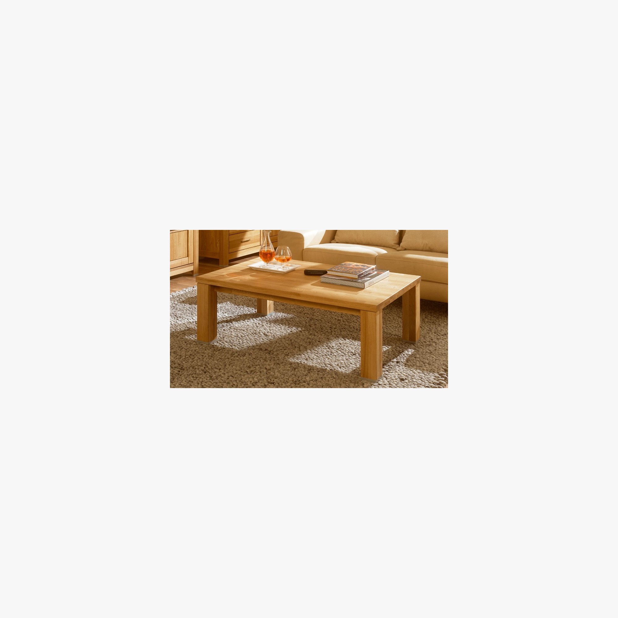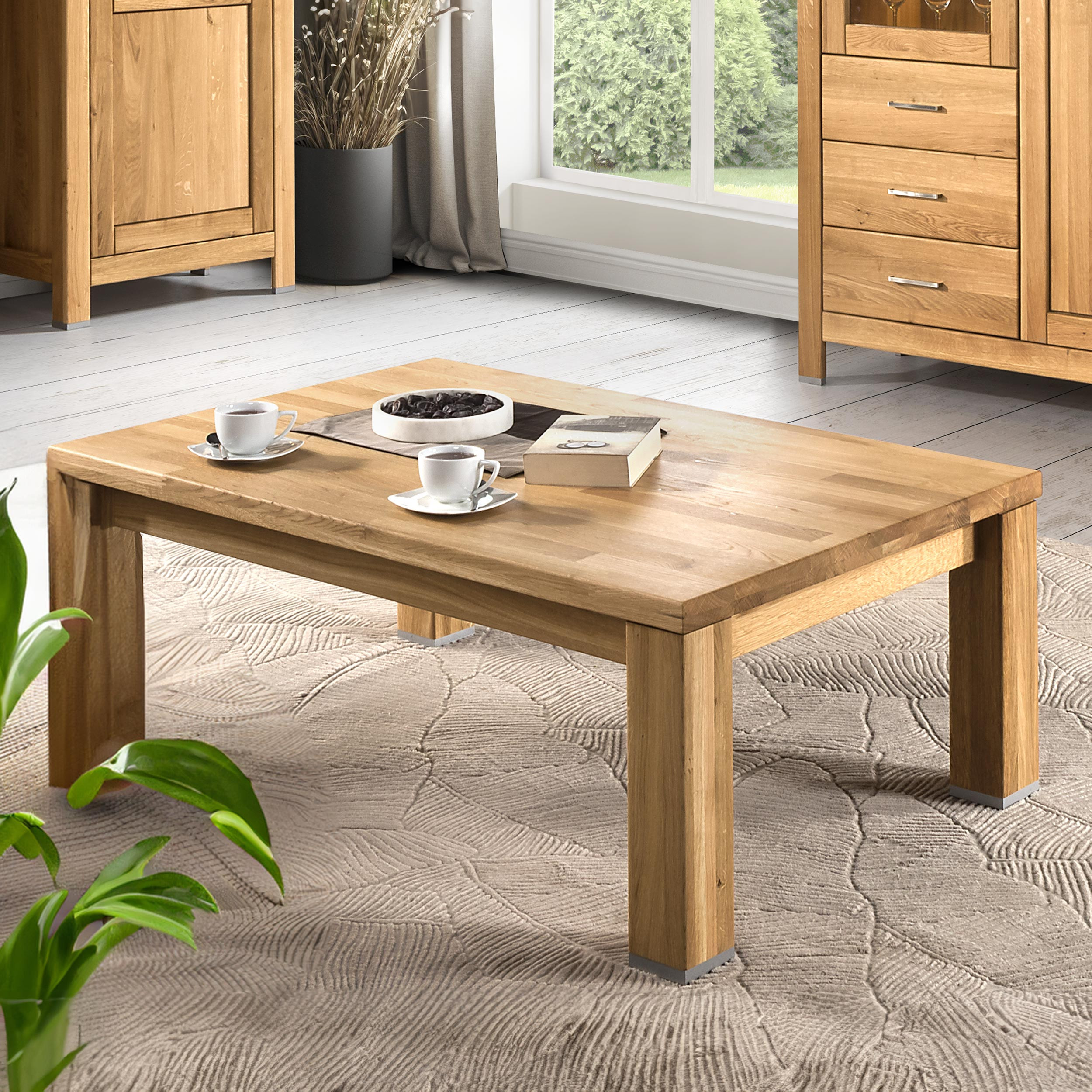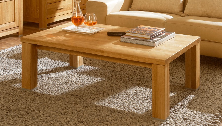 Dank ausgewähltem massivem Eichenholz verfügt der Couchtisch über hervorragende Festigkeit, besticht durch schöne Struktur und überrascht mit langer Lebensdauer. Diese wird zusätzlich durch eine Oberflächenbehandlung mit renommiertem Naturöl erhöht, das dem Möbelstück größere Widerstandsfähigkeit gegen übliche Kratzer und Abrieb verleiht.
