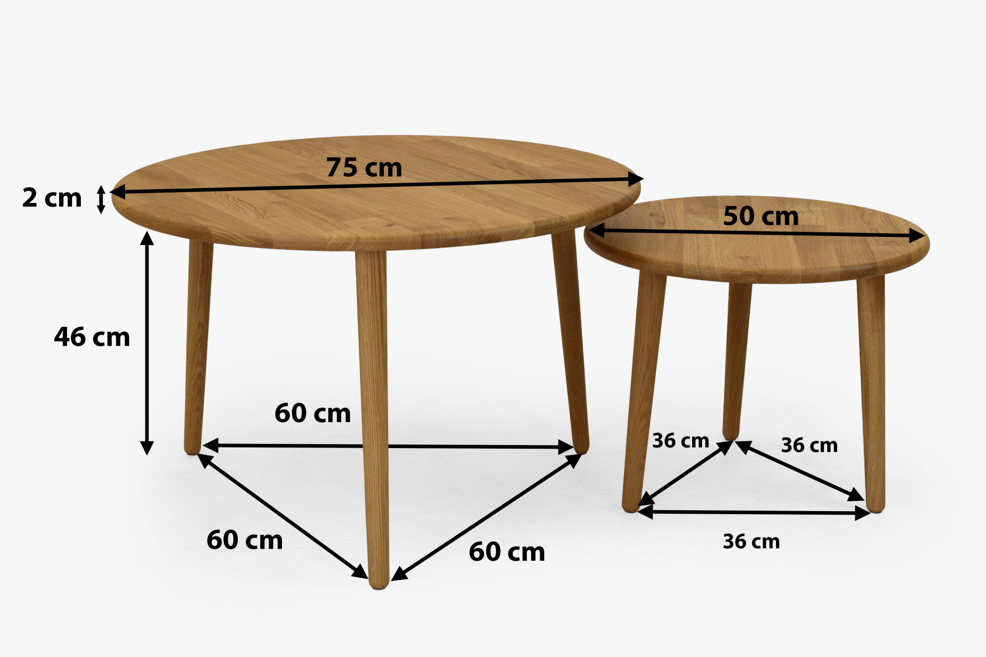 Der größere Tisch hat einen Durchmesser von 75 cm und eine Höhe von 46 cm. Der kleinere Tisch hat einen Durchmesser von 50 cm. Die Tischplatte ist 2 cm stark.