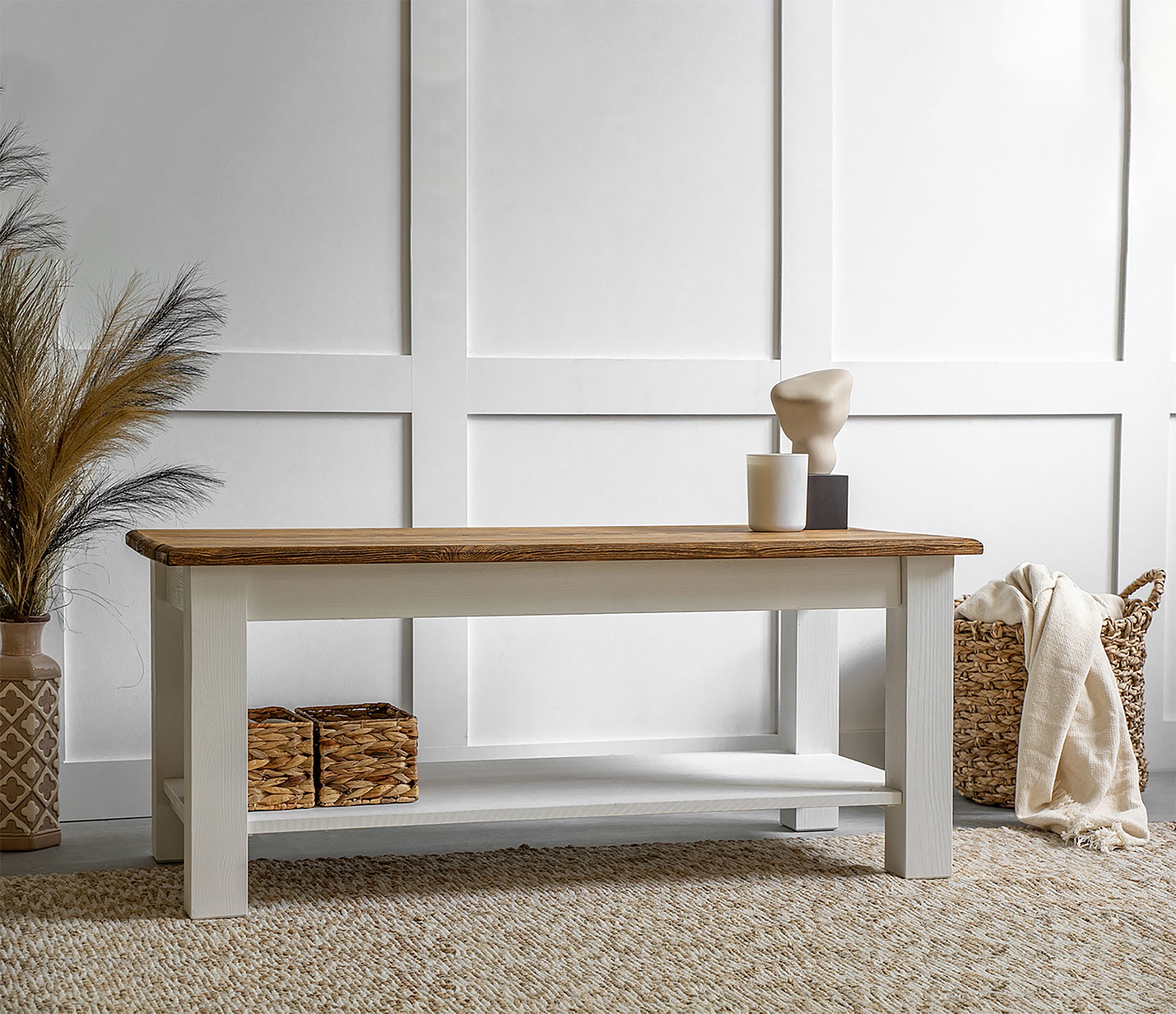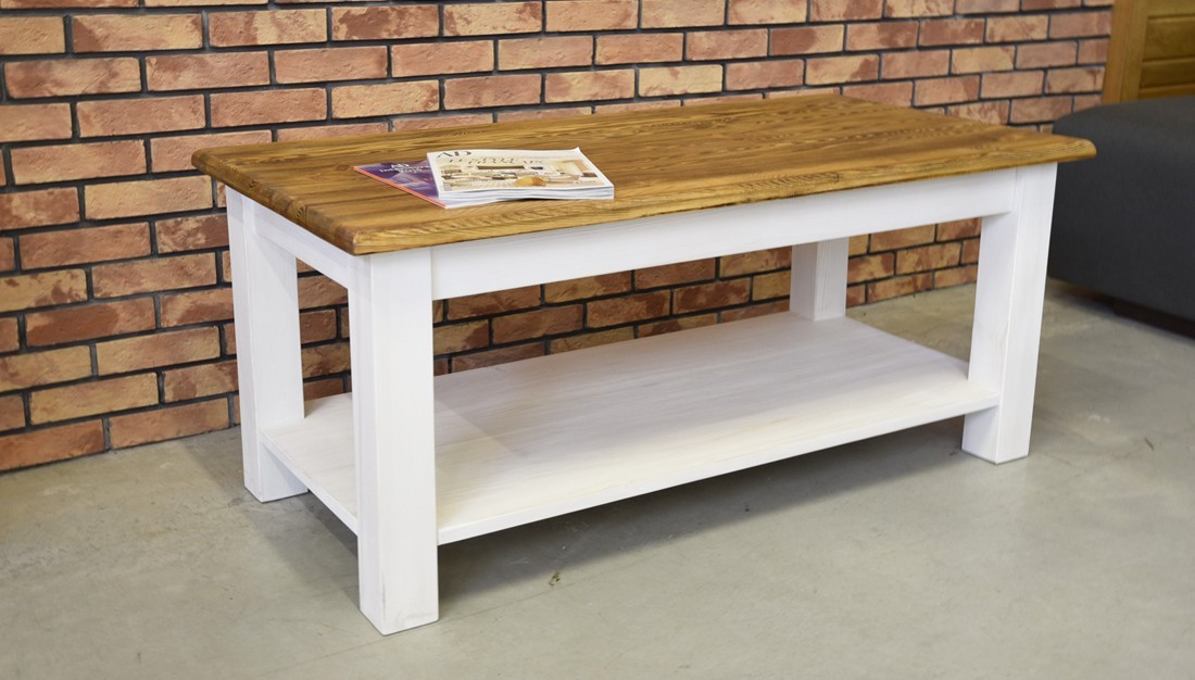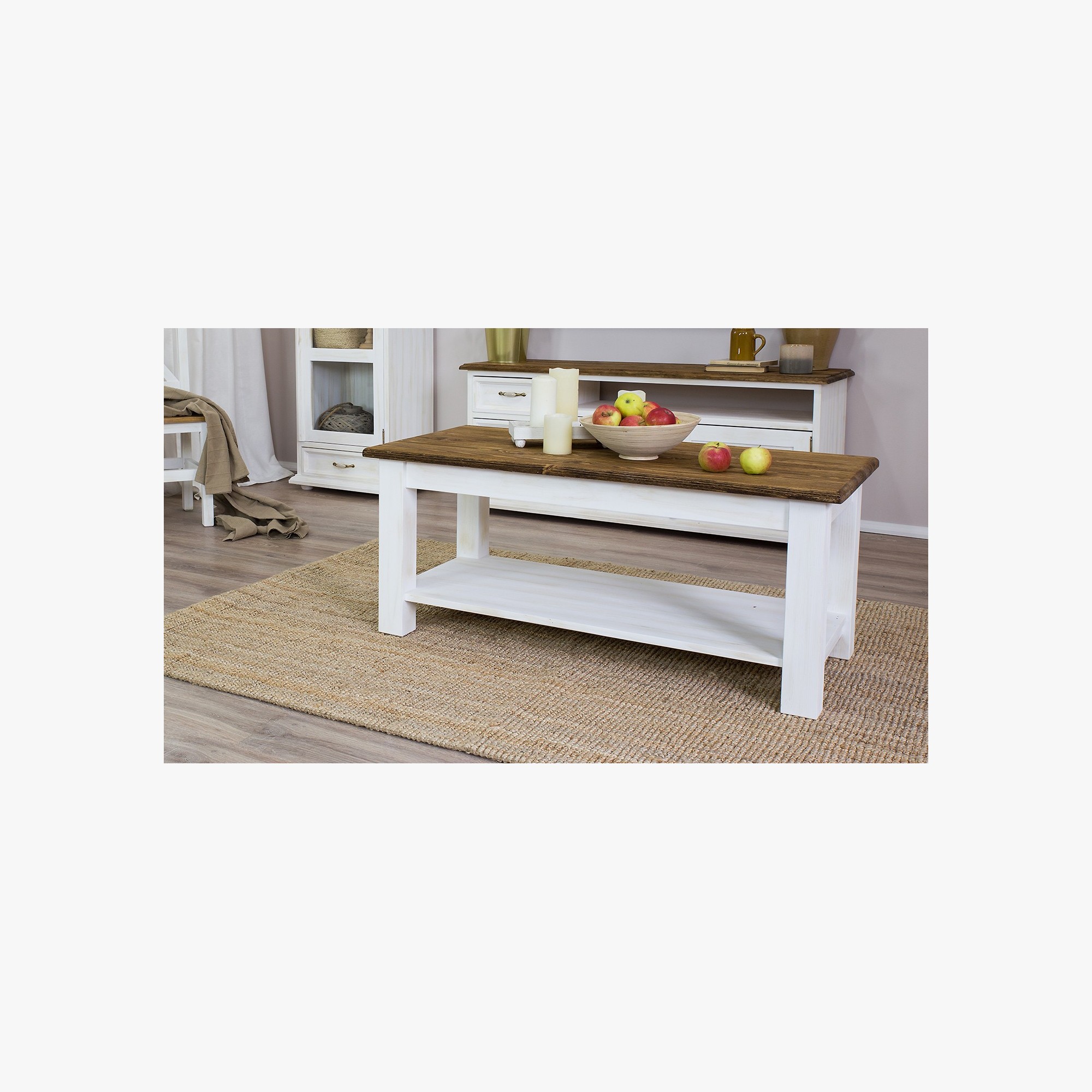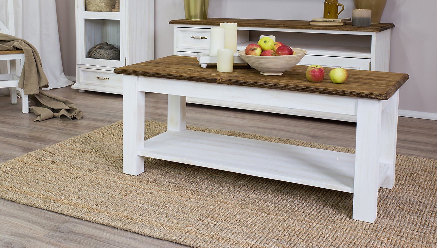 Er schmückt Ihr Wohnzimmer mit dem Sofa im Provence-Stil und Sie suchen dazu einen passenden Kaffeetisch, der optisch dazu passt und zugleich praktisch ist? Dann wird Ihnen der Kaffeetisch Provence sicher gefallen, der eine einfache, aber praktische Konstruktion mit zwei Ablageflächen hat.