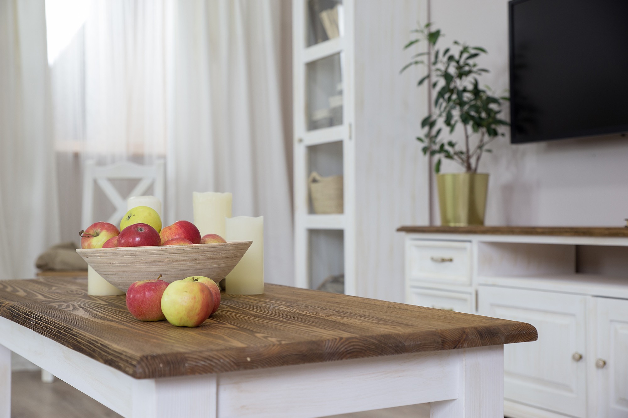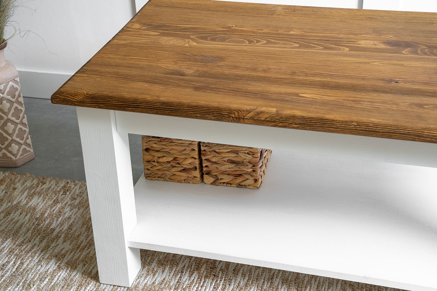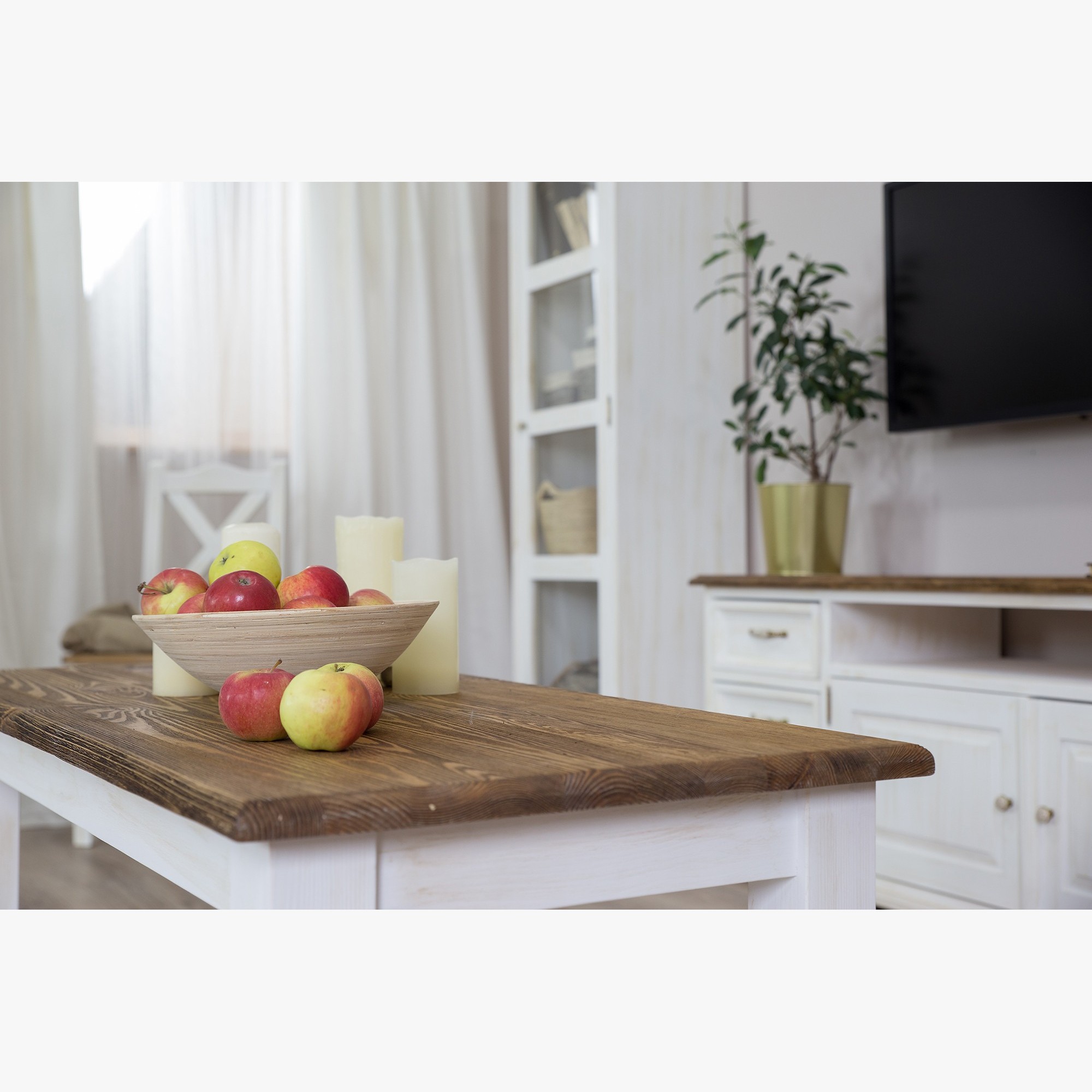 Kiefernholz, aus dem der Kaffeetisch gefertigt ist, hat eine schöne Maserung und wird sehr häufig zur Möbelherstellung verwendet. Den Kaffeetisch bieten wir entweder in weißem Design an, also mit ökologischer weißer Farbe gestrichen, oder in der Ausführung mit Patina, bei der eine spezielle Wachsschicht auf die weiße Farbe aufgetragen wird. Diese erzeugt einen Effekt von Alter und verwittertem Holz. Das Möbelstück wirkt, als hätte die Zeit ihre Spuren hinterlassen. Für die Patina-Ausführung ist ein Aufpreis von 10% zu zahlen.