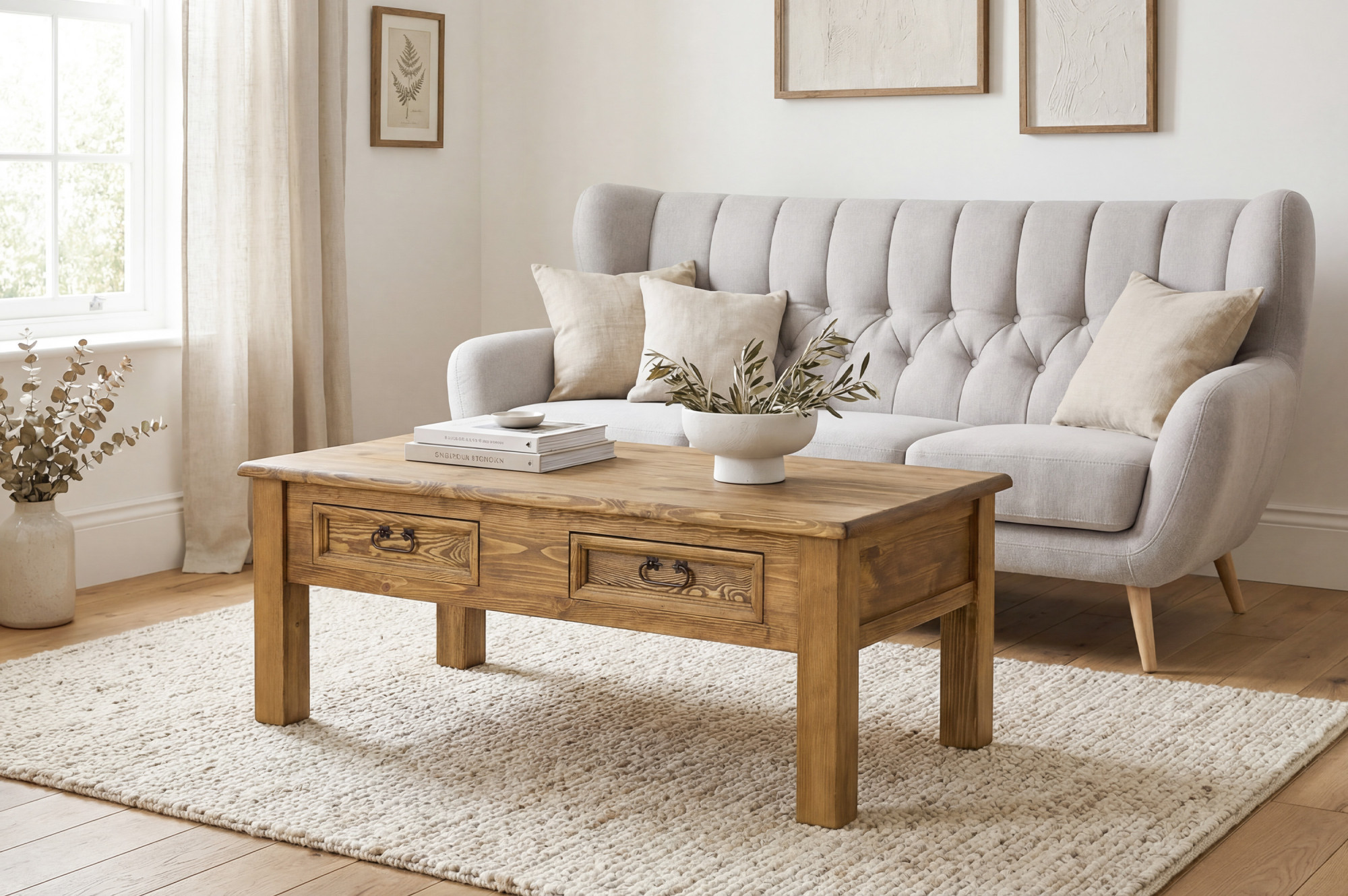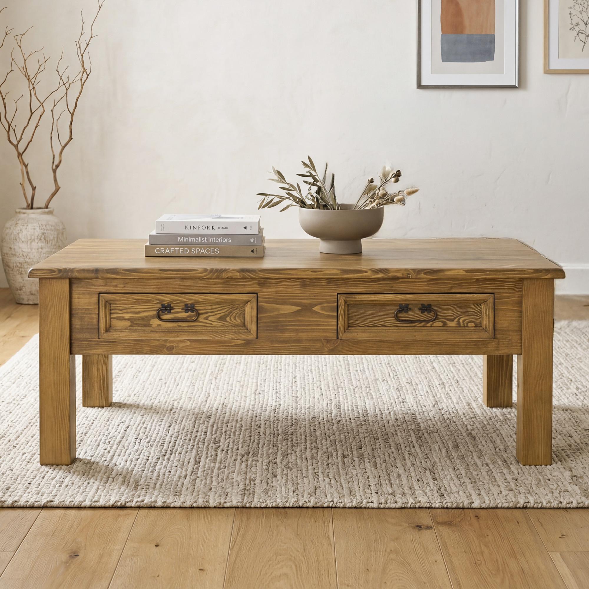 Ein großer Vorteil des Tisches sind die 4 praktischen Schubladen, die ausreichend Stauraum für Fernbedienungen, Zeitschriften, Kleinigkeiten und alles bieten, was Sie griffbereit, aber nicht sichtbar haben möchten. Dieser Kaffeetisch aus Kiefer wird bereits montiert geliefert, sodass Sie ihn nach der Lieferung nur noch an den gewünschten Platz stellen und sofort benutzen können. Wenn Sie ein harmonisch abgestimmtes Interieur suchen, wird es Sie freuen, dass es auch eine kleinere Variante im Angebot gibt.