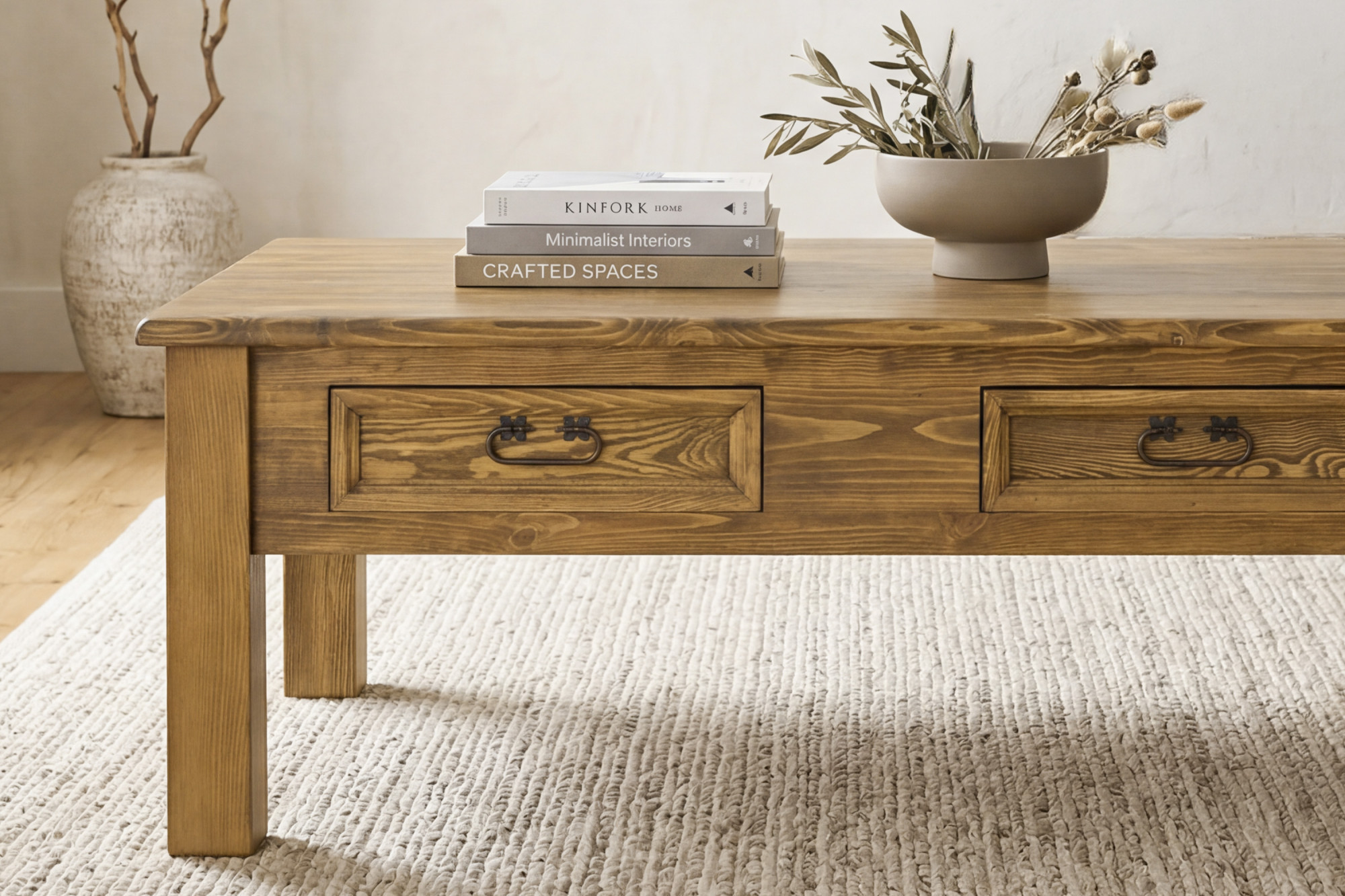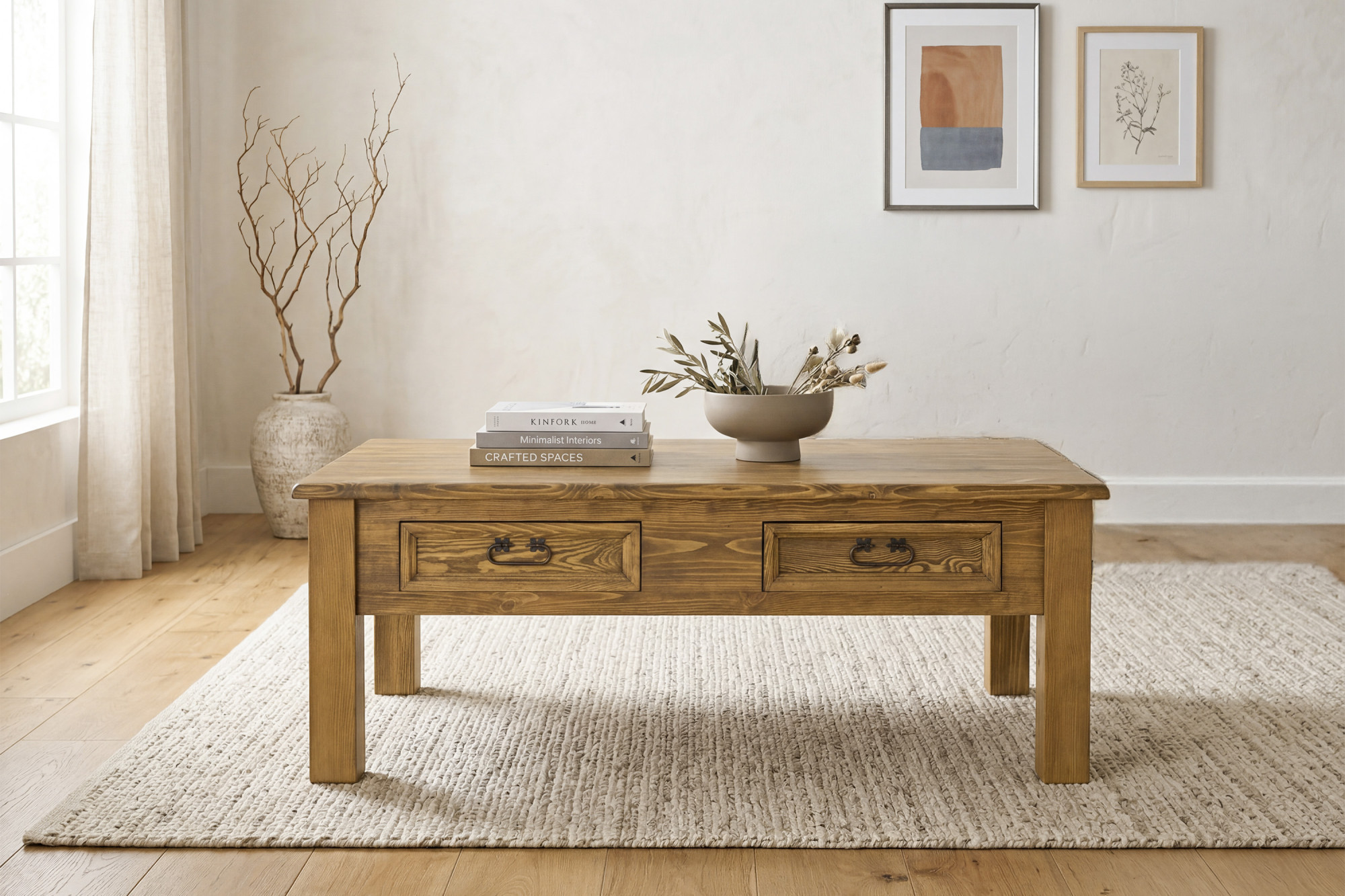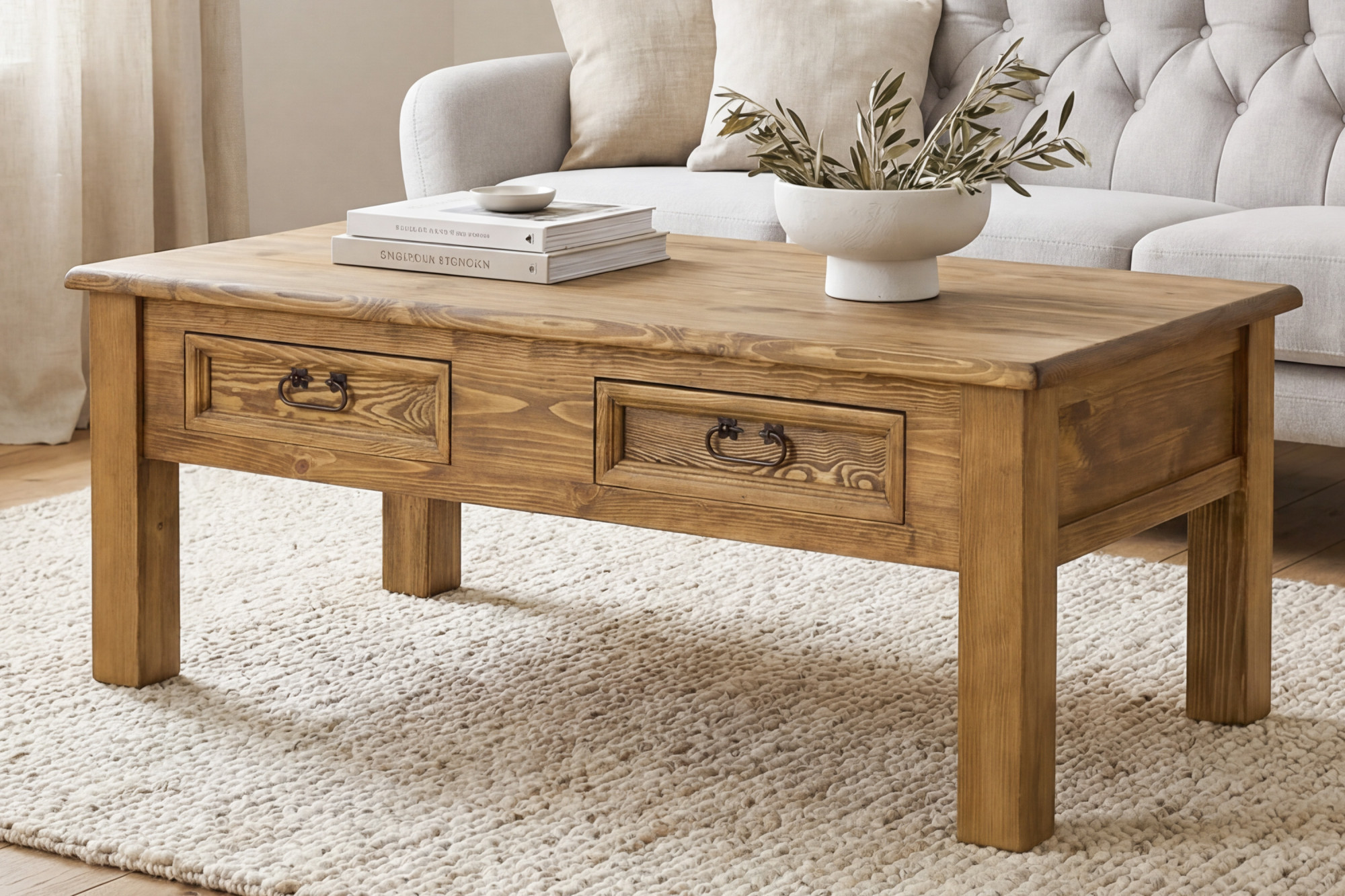 Suchen Sie einen rustikalen Couchtisch aus Massivholz, der Wärme, natürliche Schönheit und zeitlose Eleganz in Ihr Zuhause bringt? Dieser Couchtisch im französischen Landhausstil ist aus massivem Kiefernholz gefertigt und besticht durch seine authentische Holzmaserung, sorgfältige Verarbeitung und praktische Nutzbarkeit. Durch sein Aussehen ergänzt er hervorragend das Wohnzimmer, das Ferienhaus, eine stilvolle Wohnung oder ein rustikal gestaltetes Interieur.
