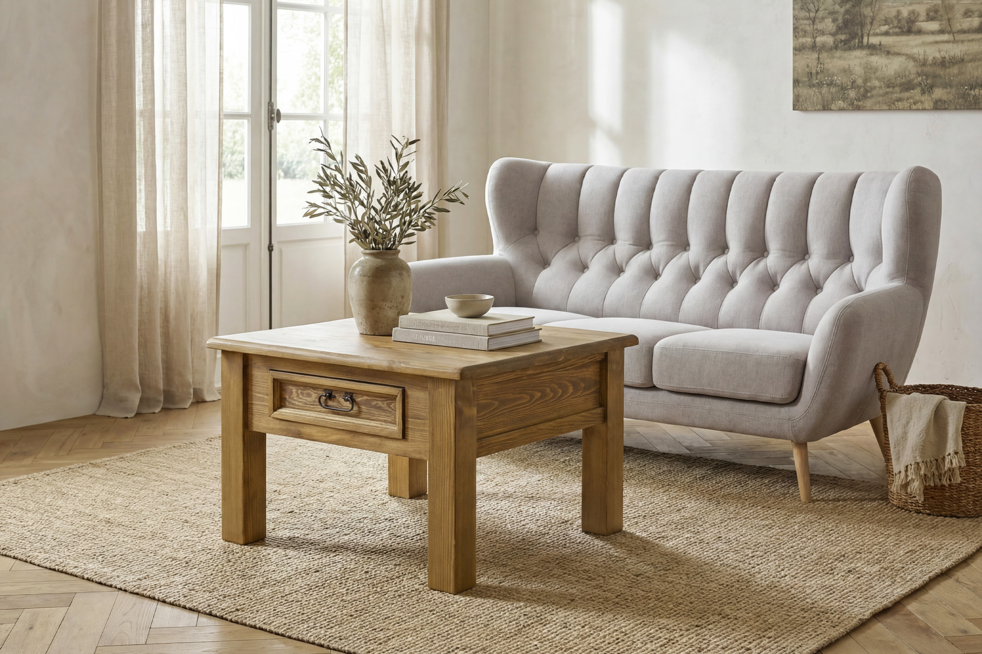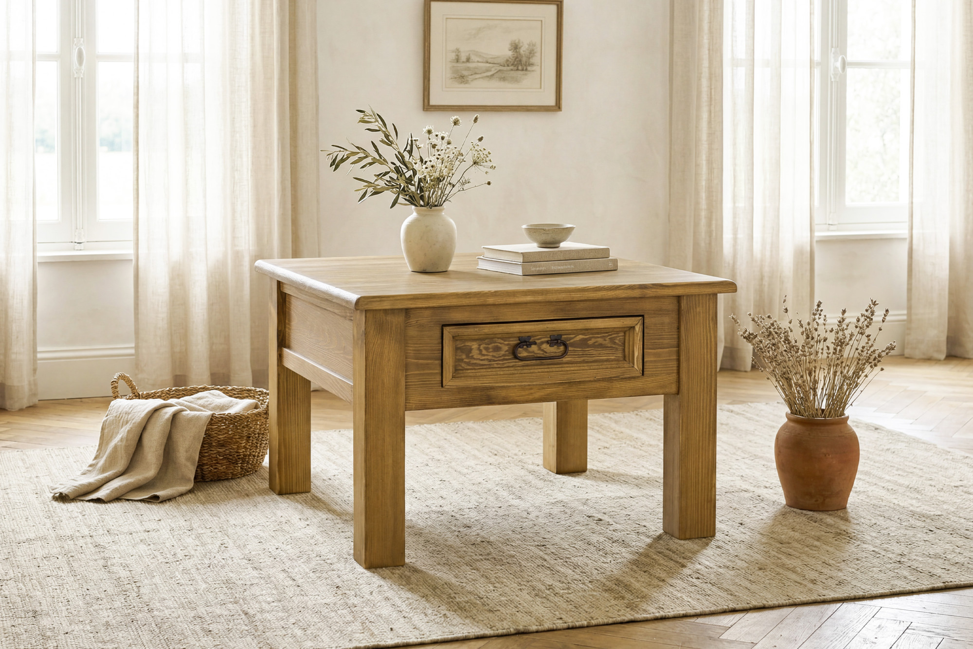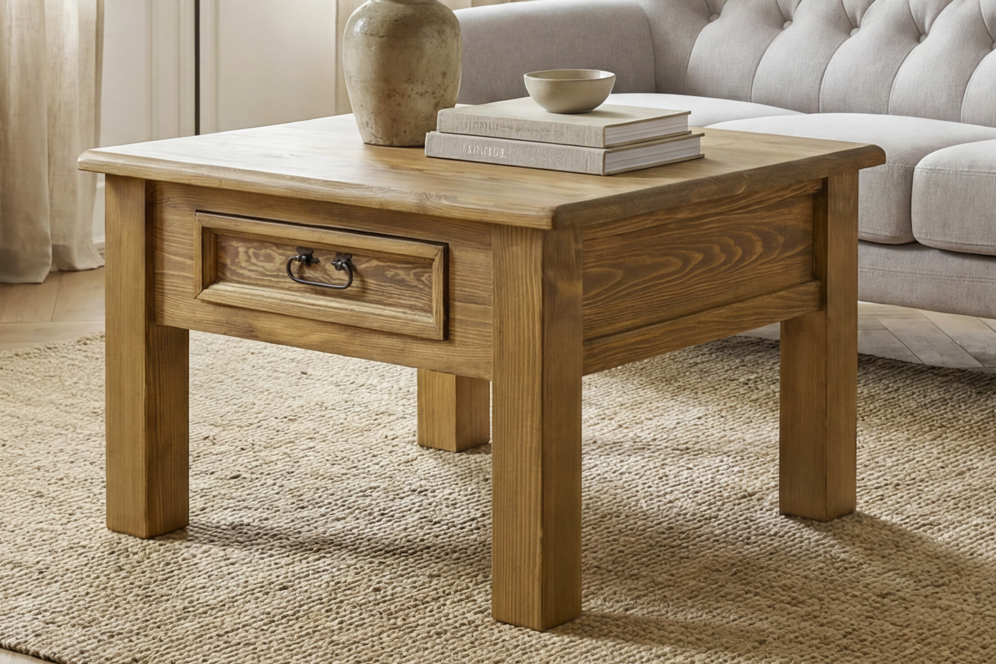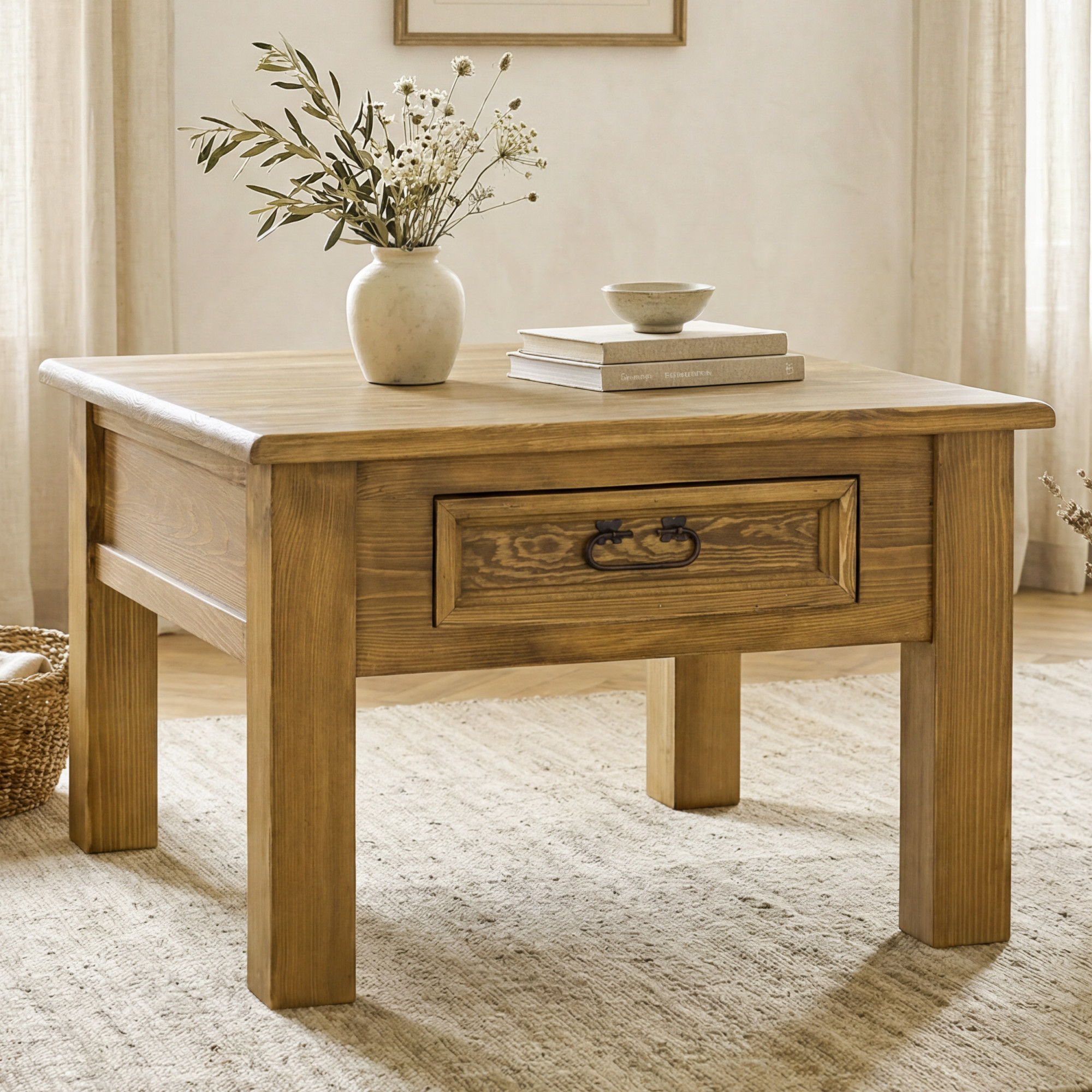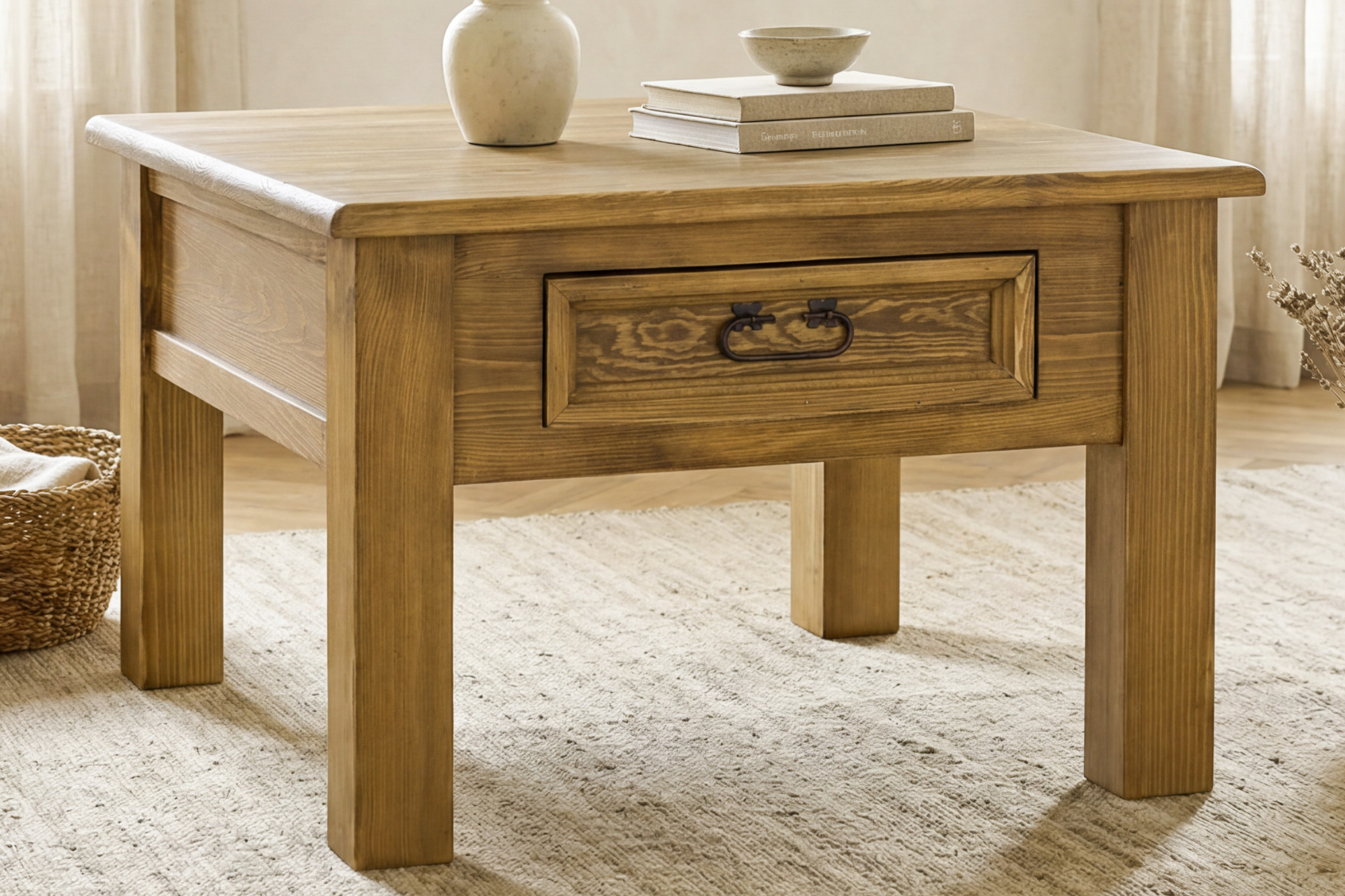 Suchen Sie einen stilvollen Couchtisch aus Massivholz, der Wärme, Eleganz und handwerkliche Qualität in Ihr Interieur bringt? Dieser rustikale Couchtisch aus massivem Kiefernholz ist die ideale Wahl für Liebhaber eines gemütlichen Zuhauses und zeitlosen Designs. Dank seines französischen Landhausstils passt er hervorragend in klassische, rustikale und romantisch gestaltete Räume.