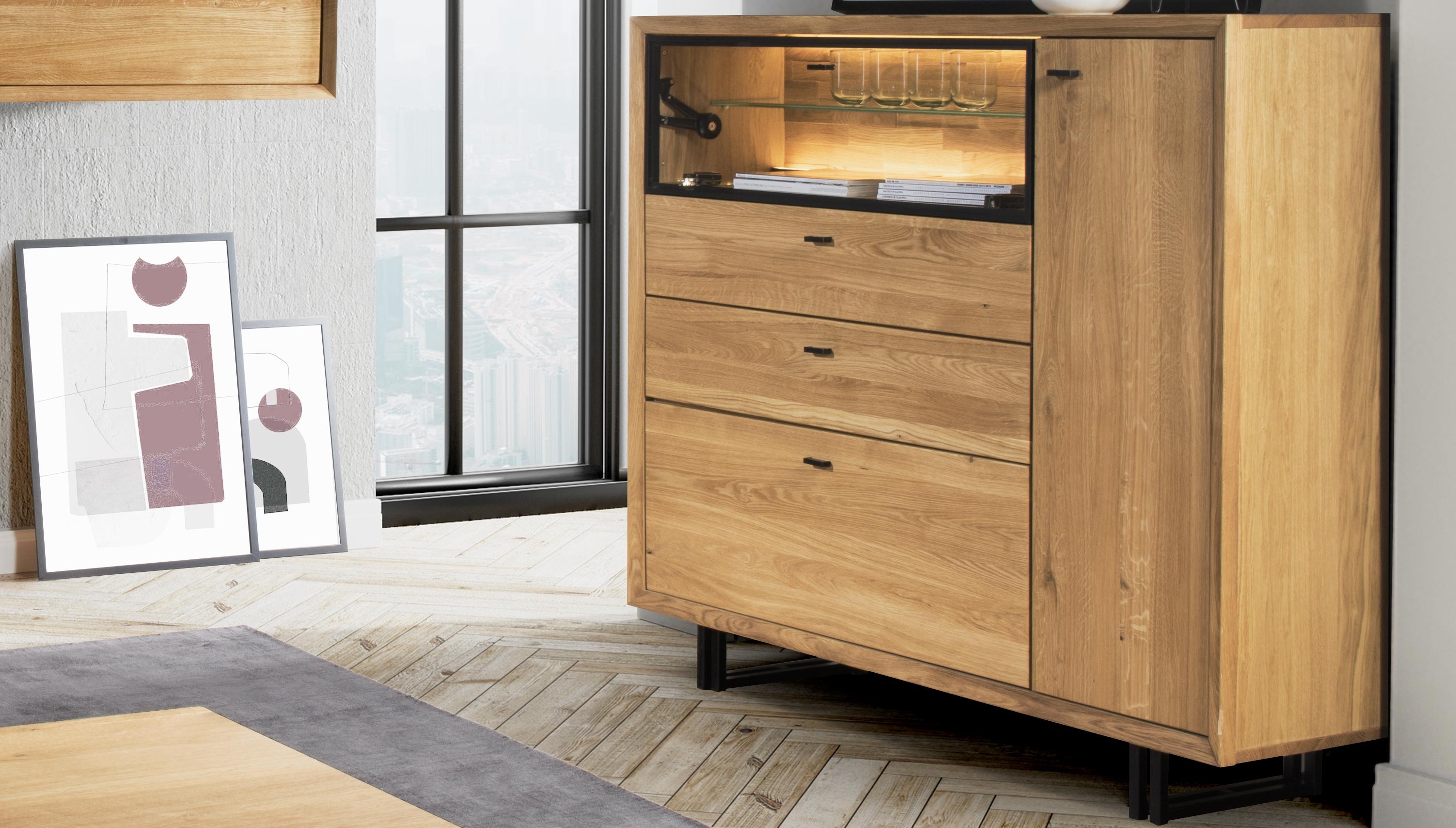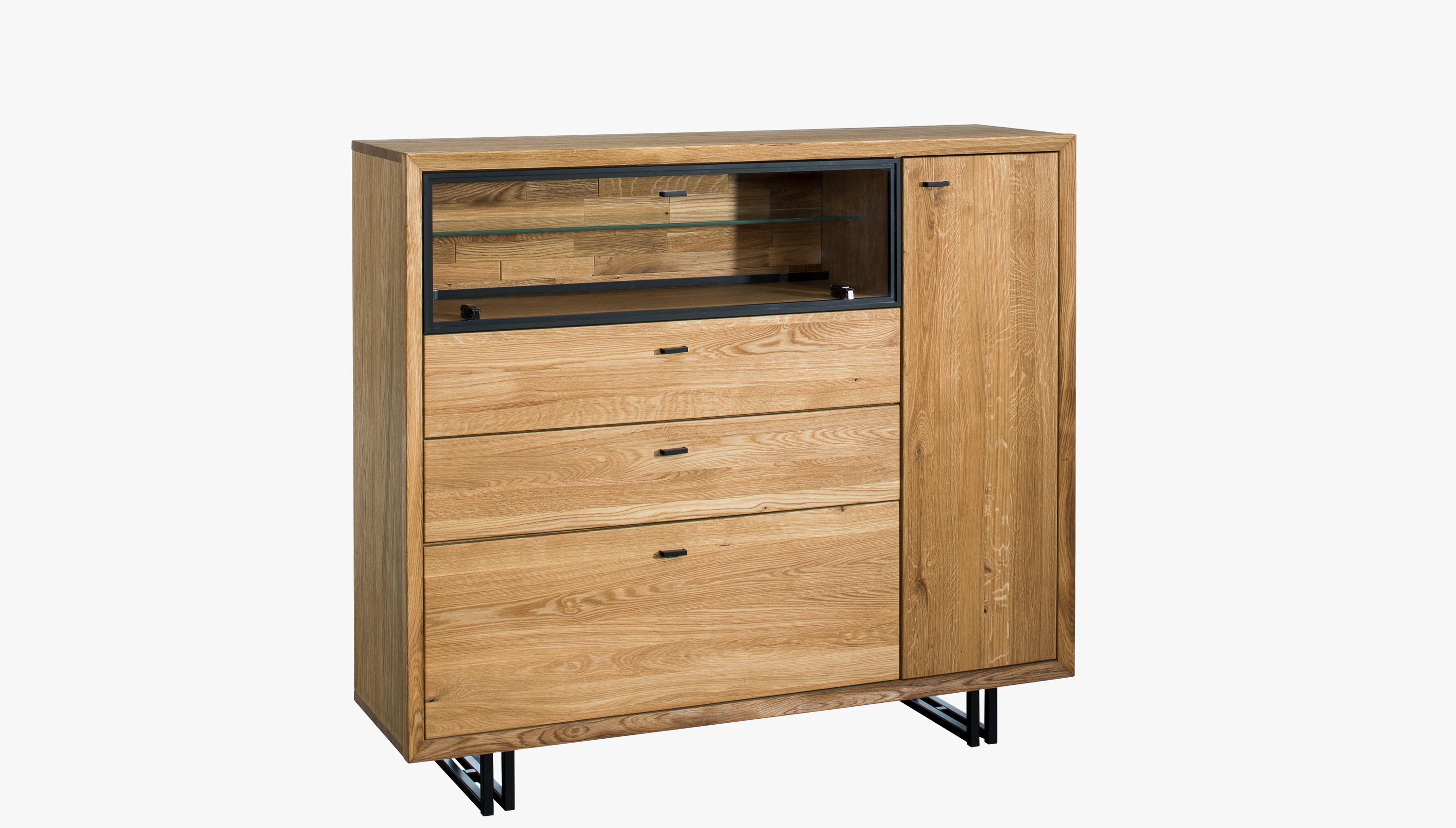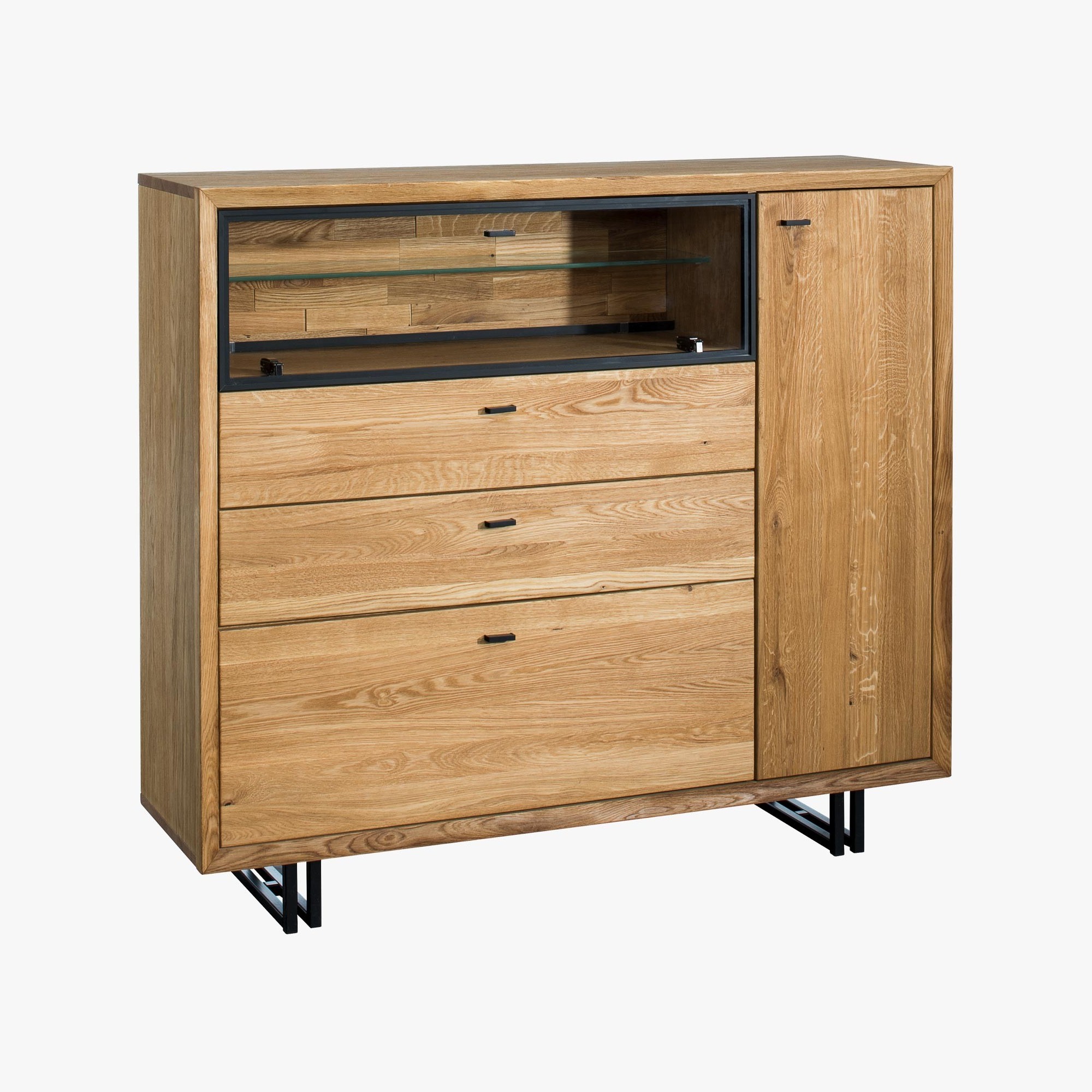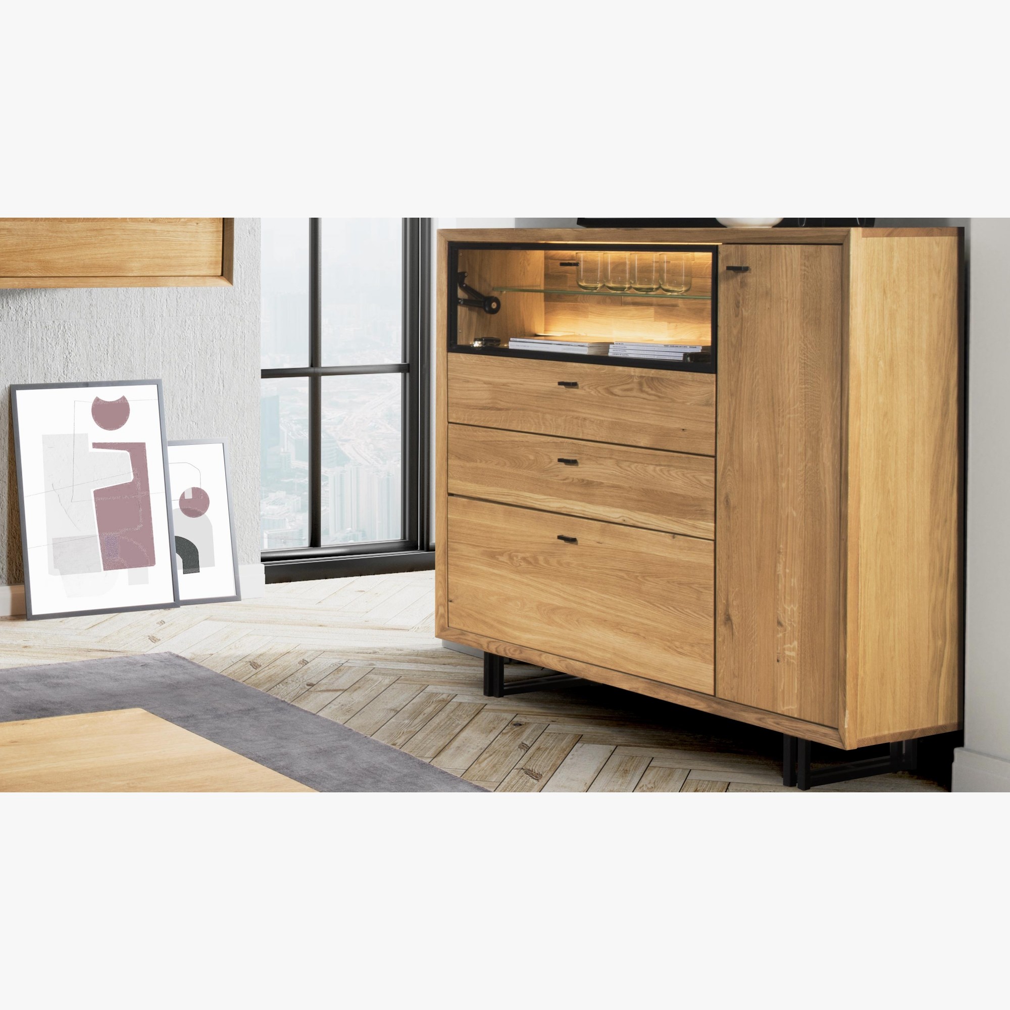 Die VILO-Reihe wird aus einer Kombination von massivem Eichenholz und natürlicher Eichenfurnier hergestellt. Die Fronten der Schubladen und Türen sind aus massiver Eiche, während die oberen und seitlichen Teile aus natürlichem Eichenfurnier für Langlebigkeit und schönes Aussehen sorgen. Jedes Stück ist mit einem außergewöhnlichen deutschen Öl Livos behandelt, das das Holz schützt und seine natürliche Struktur hervorhebt.