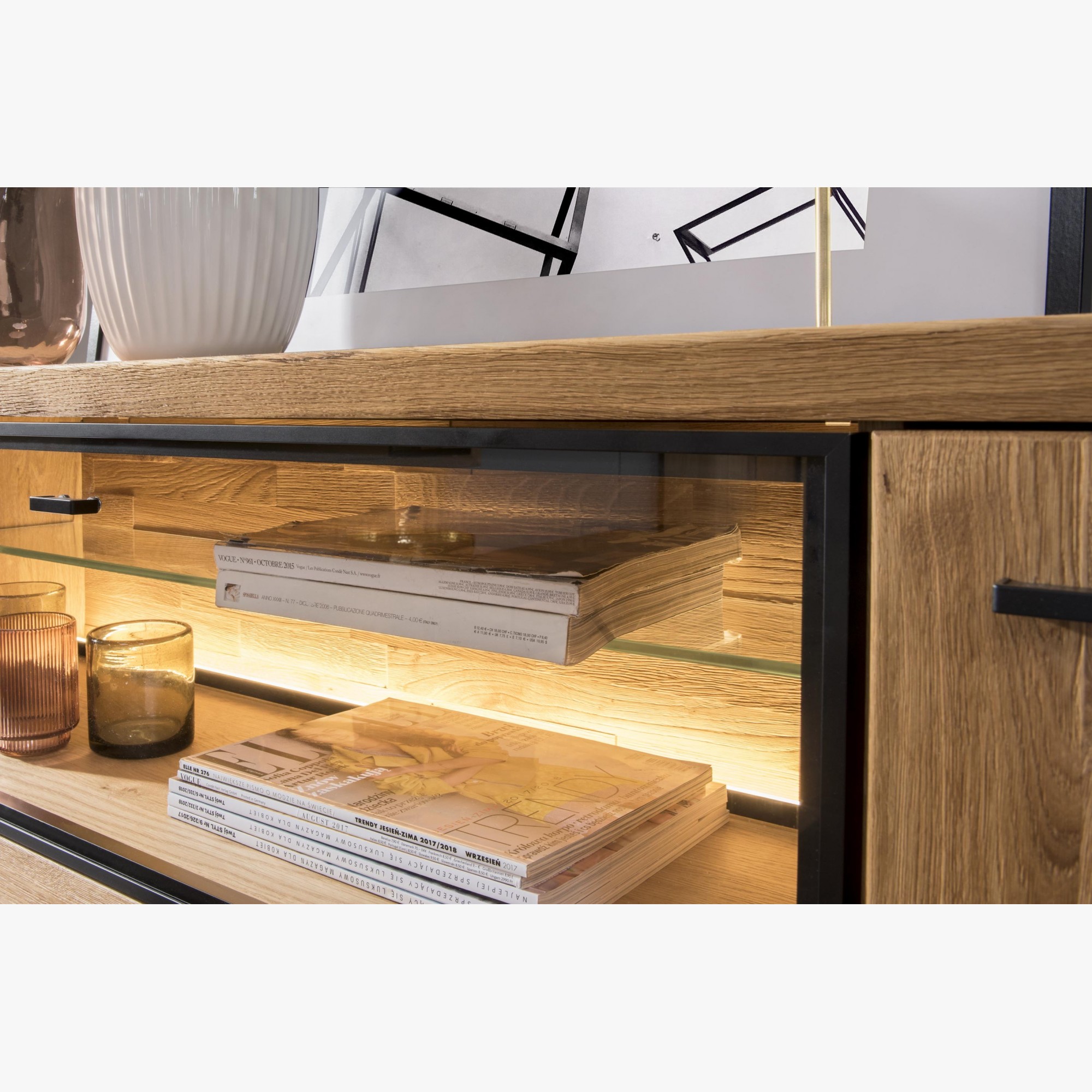 Der Besteckkasten Vilo 47 verfügt über zwei mittlere Schubladen und einzigartige obere Türen, die sich mit einem stilvollen „Fall“-Mechanismus von oben nach unten öffnen. Die verglaste Partie mit integrierter Beleuchtung schafft einen wunderschönen visuellen Effekt, während die luxuriöse Rückwand aus verschiedenen Holzblöcken Tiefe und Charakter zum Raum hinzufügt. Auf der rechten Seite des Besteckkastens befinden sich Türen mit zwei Regalen, die Sie je nach Bedarf in verschiedenen Höhen einstellen können.