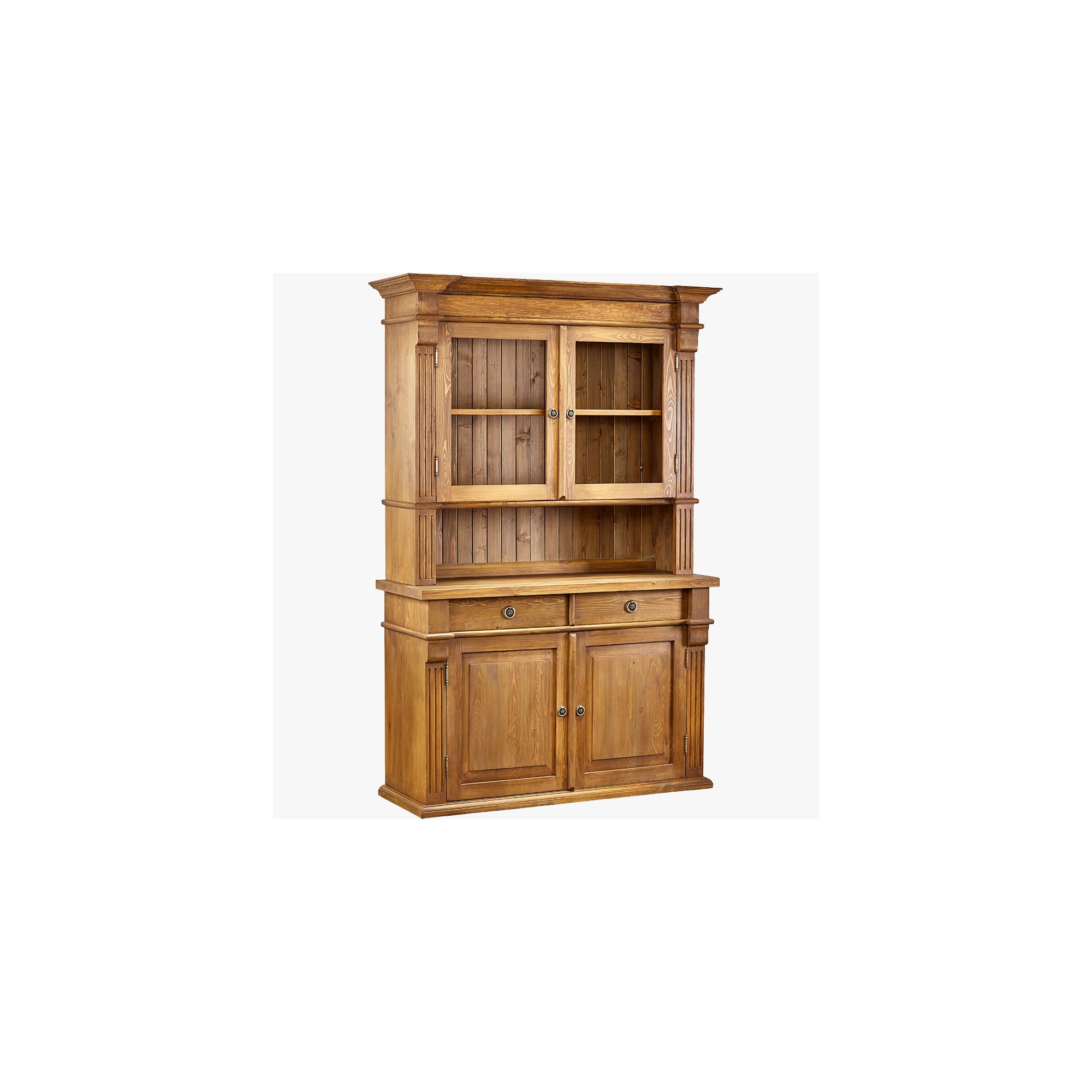 Geschirrschrank Prestige (D-KRI-64) aus massivem Kiefernholz – brauner Lack mit Patina, 132 × 195 × 45 cm