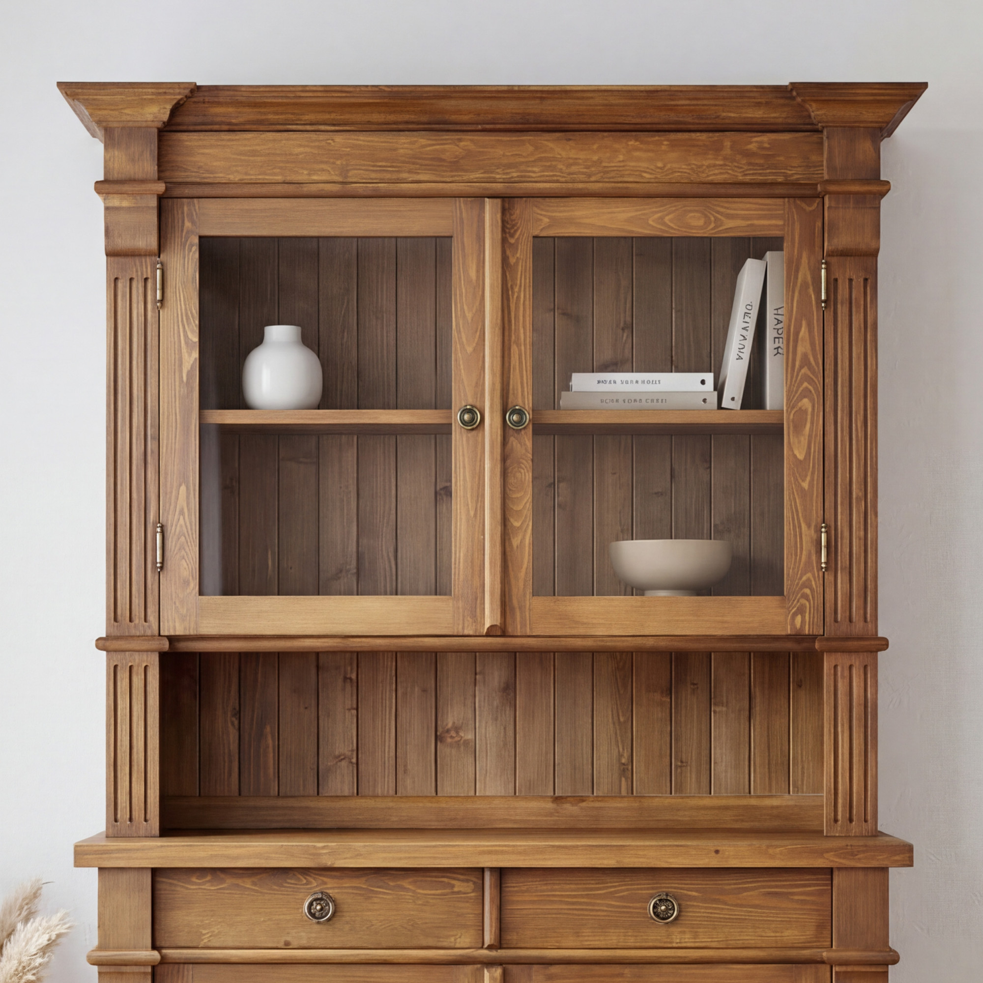 Die massive Konstruktion aus Kiefernholz gewährleistet hohe Festigkeit, Stabilität und Widerstandsfähigkeit im täglichen Gebrauch. Der braune Lack mit Patina betont die natürliche Holzmaserung und erzeugt einen gemütlichen, eleganten Eindruck. Das Gesamtbild wird durch originelle Griffe der italienischen Marke Bosetti Marella und eingelassene Scharniere in altem Messing ergänzt, die perfekt zum traditionellen Stil der Prestige-Kollektion passen. Der Geschirrschrank vereint somit erstklassige Handwerkskunst, Funktionalität und repräsentatives Design.