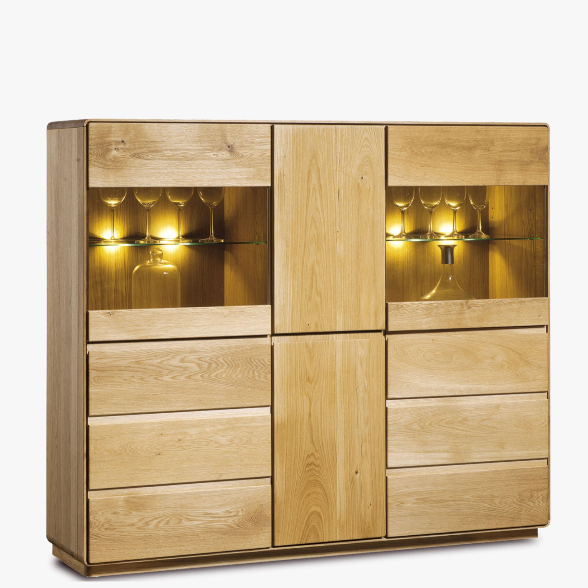 Die Vitrine ist ausreichend breit und ihr Innenraum ist durchdacht symmetrisch unterteilt, sodass Sie wirklich viel Stauraum gewinnen. Seitlich befinden sich Türen, hinter denen ein Holzboden und ein Glaseinlegeboden aus speziellem gehärtetem Glas sind. In der mittleren Sektion sind volle, holzfarbene Eichentüren, hinter denen Ihnen zwei Inneneinlegeböden zur Verfügung stehen.
