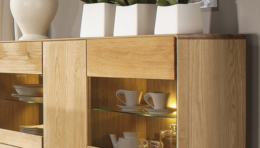 Die Eichenvitrine Typ 47 ist ein Element der Helsinki Kollektion. Die Eichenmöbel dieser Serie zeichnen sich durch ein geschmackvolles Design und eine moderne Note aus. Die Möbelkanten sind leicht abgerundet. Die massive Eiche wird sorgfältig mit der Bürsttechnik bearbeitet, durch die das Möbel ein originelles Aussehen mit unverwechselbarer Maserung und Duft erhält. Beim Berühren spüren Sie die erhabene Struktur des Massivholzes.