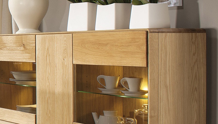 Die Vitrine gewinnt Sie sofort durch die unverwechselbare Schönheit der wilden gebürsteten Eiche, die erstklassige handwerkliche Verarbeitung und den charakteristischen Duft, mit dem Eichenmöbel glänzen. Lassen Sie den Duft im ganzen Raum wirken!