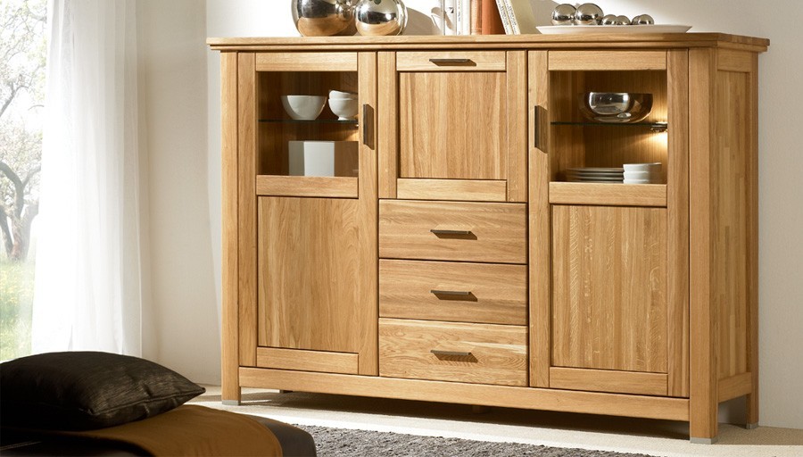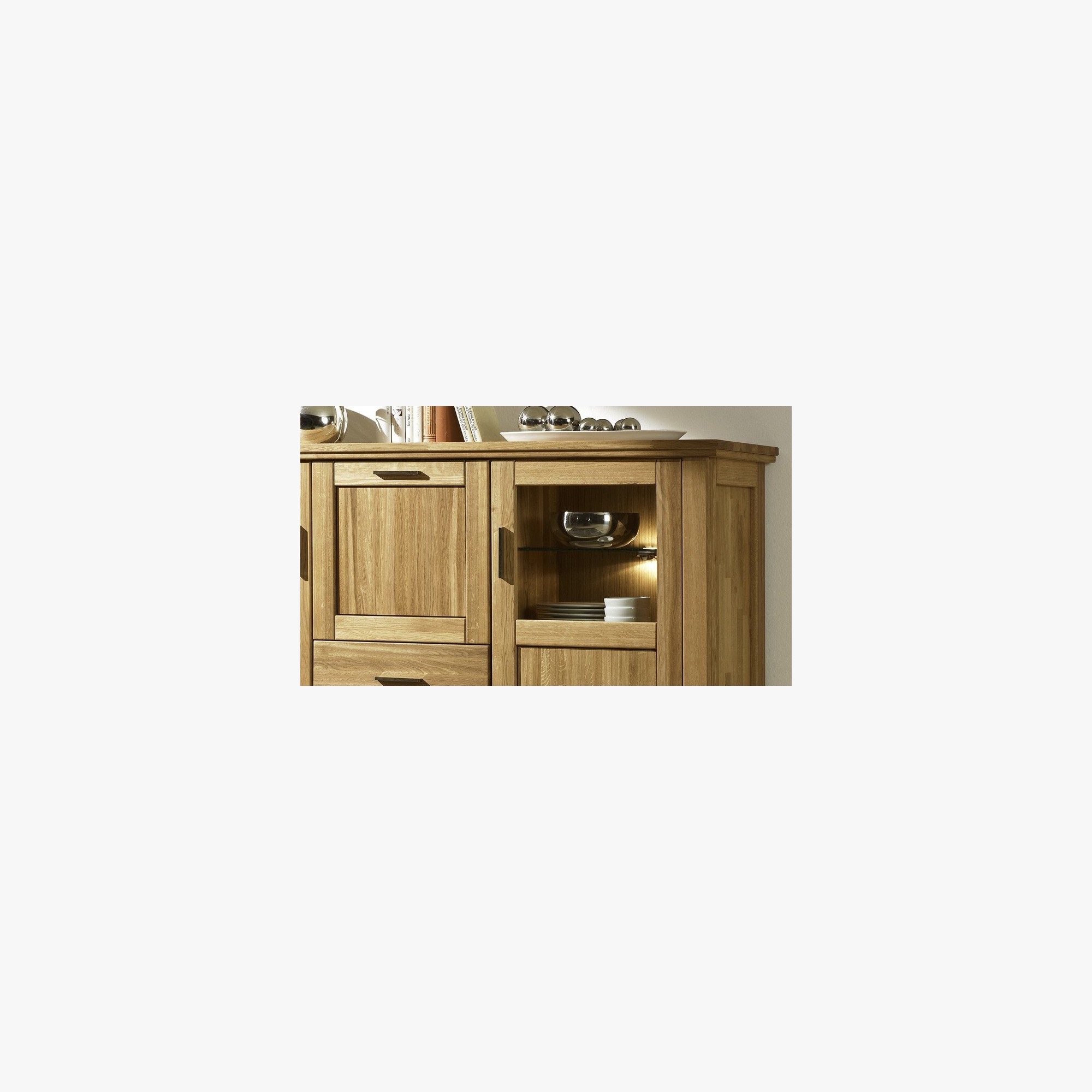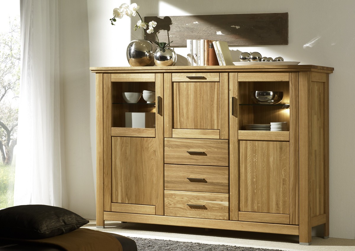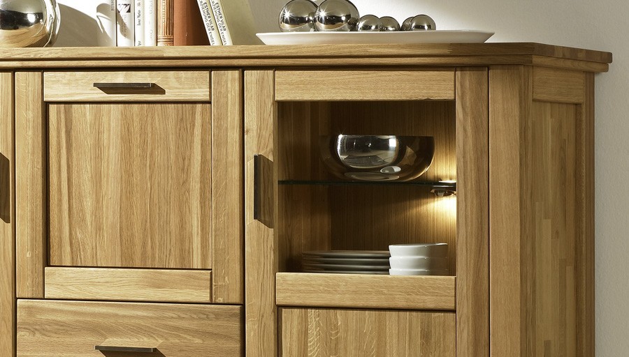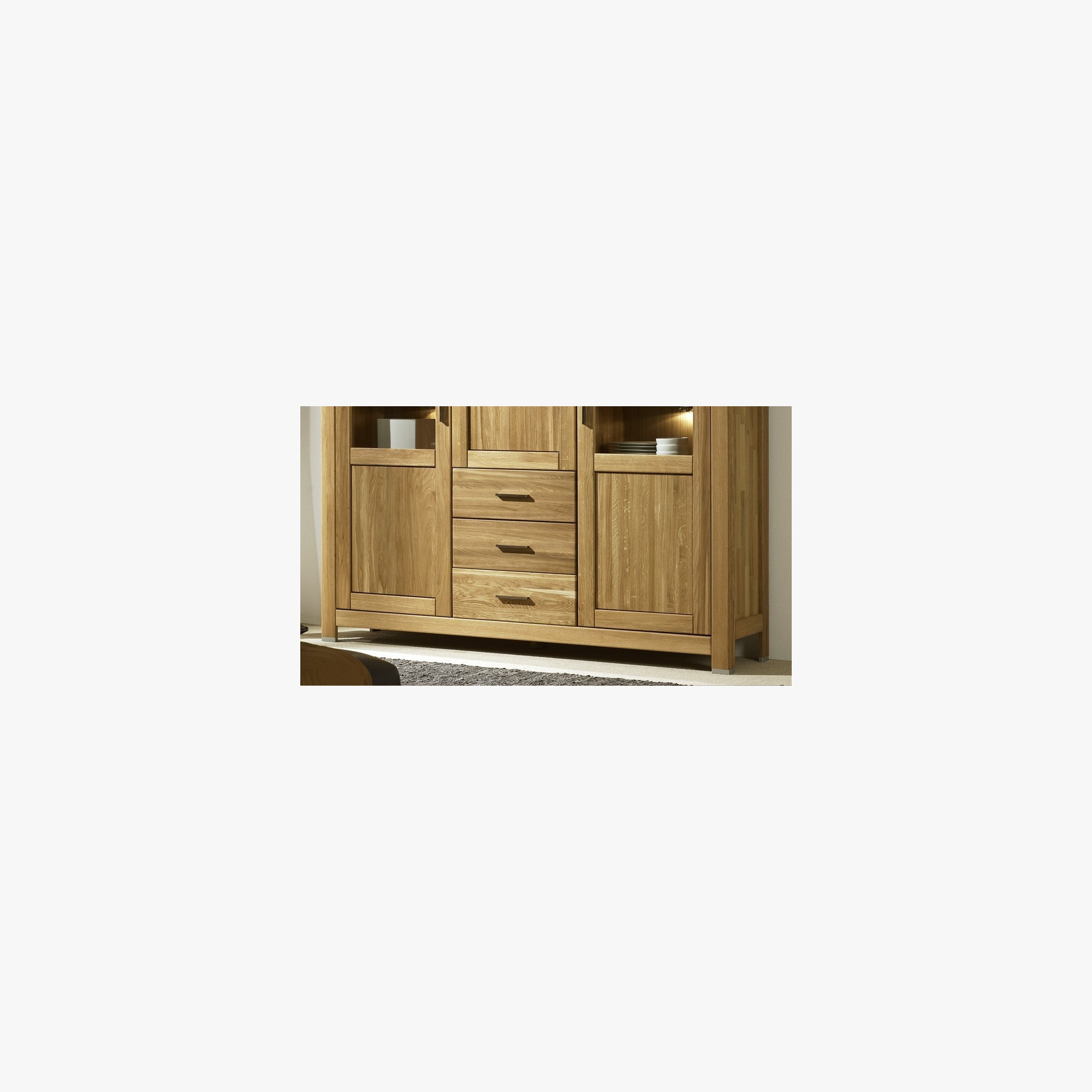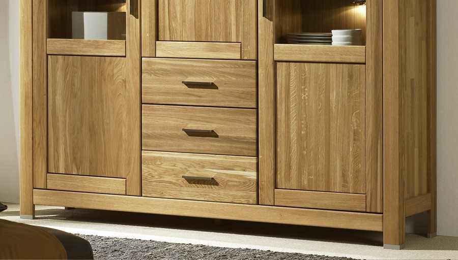 Der Eichen-Sekretär eignet sich hervorragend für das Esszimmer oder das Wohnzimmer. Zwei seitliche Schränke sind mit teilweise verglasten Türen ausgestattet. Hinter dem verglasten Teil befindet sich jeweils ein Glasregal, hinter dem geschlossenen Teil ein Holzregal. Im mittleren Bereich des Sekretärs befinden sich ein oberer Schrank und darunter drei Schubladen mit Selbstzugmechanismus. Selbstverständlich besitzt er auch ein sanftes Türenschließen mit Soft-Stop. Die länglichen Metallgriffe harmonieren schön mit dem Gesamtdesign des Sekretärs. Für die Herstellung des Eichen-Sekretärs wurde ausgewähltes Holz verwendet, das einem strengen Kontrollprozess unterliegt. Die Produktion erfolgt unter Einsatz modernster Technologien. Die Oberfläche des Sekretärs ist nur mit natürlichem Öl einer renommierten deutschen Marke behandelt. Dessen Aufgabe ist es, die Maserung des Massivholzes hervorzuheben, dessen Schönheit zu bewahren und ihm höhere Widerstandsfähigkeit gegen mechanische Beschädigungen zu verleihen. Die Farbgestaltung Eiche Öl wirkt natürlich und lässt sich mit weiteren Elementen dieser Ausführung aus allen Kollektionen des Eichenmöbels kombinieren.