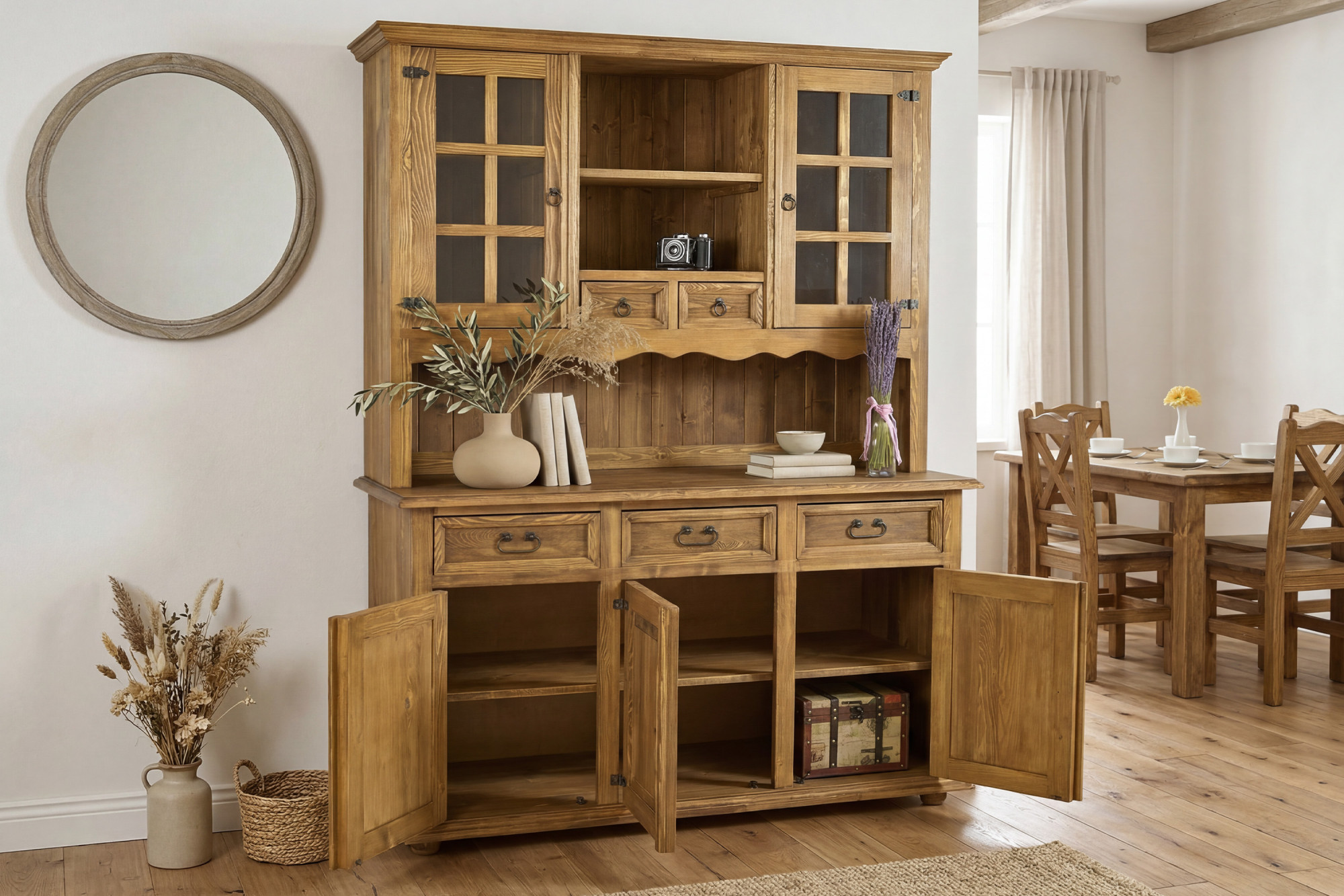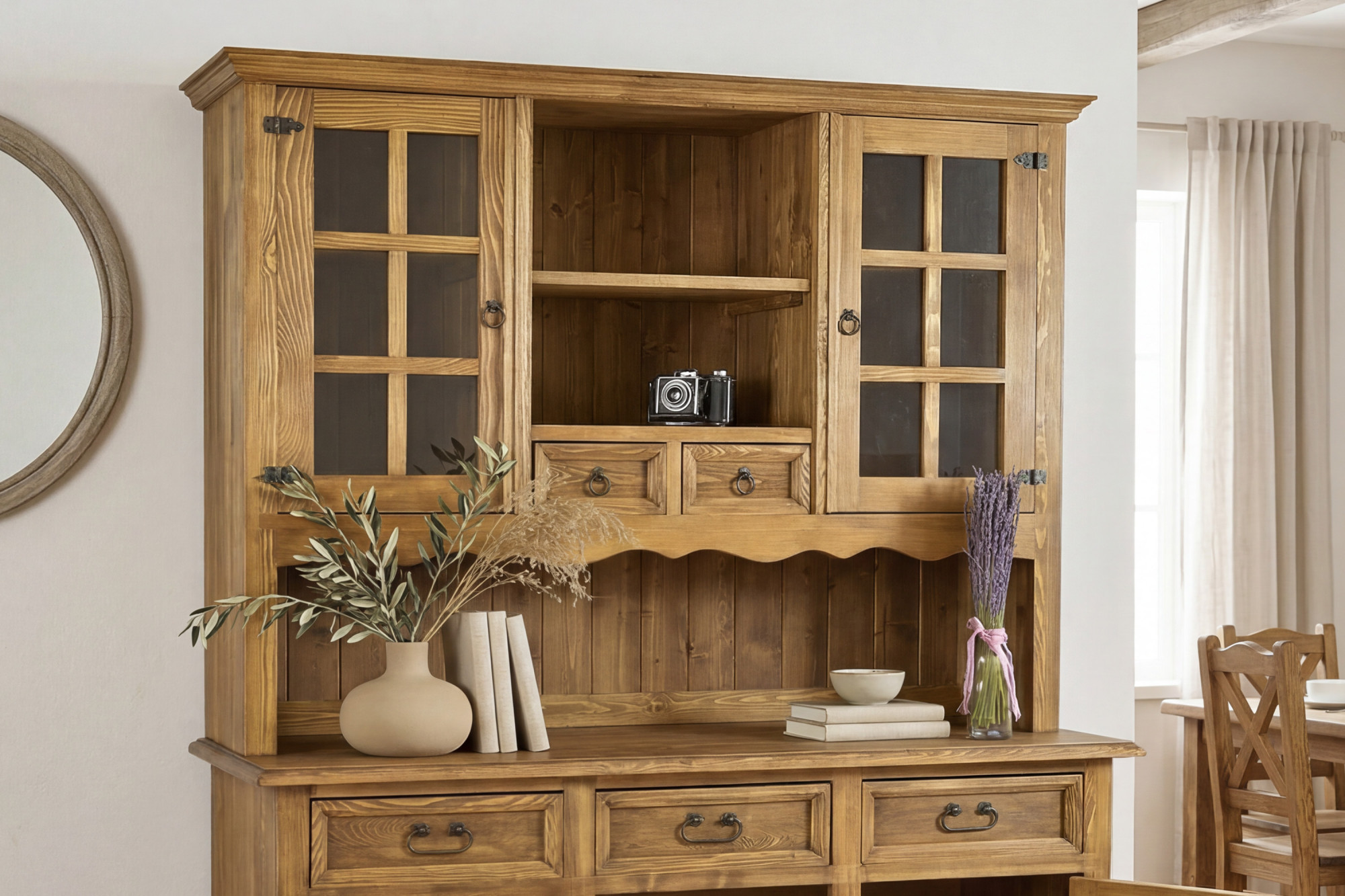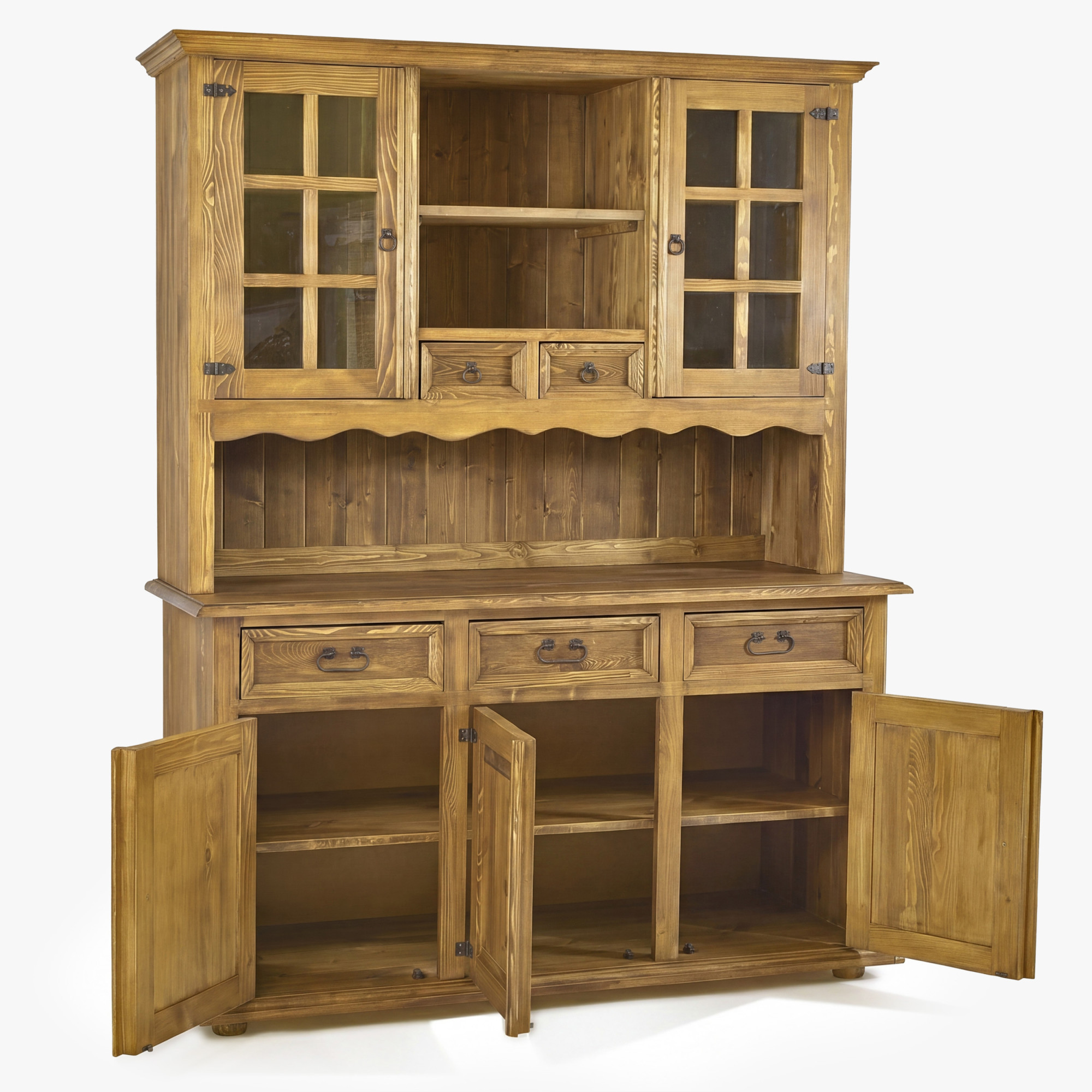 Suchen Sie einen großen rustikalen Geschirrschrank für das Esszimmer, der auf den ersten Blick beeindruckt und gleichzeitig ausreichend Stauraum bietet? Dieser Geschirrschrank im französischen Landhausstil ist aus hochwertigem Kiefernholz gefertigt und vermittelt mit seinem Aussehen perfekt die Atmosphäre eines traditionellen, gemütlichen und eleganten Zuhauses. Dank durchdachter Details, sorgfältiger handwerklicher Verarbeitung und ausgeprägtem rustikalem Charakter wird er zum dominanten Möbelstück in jedem Esszimmer, in der Küche und stilvoll eingerichteten Wohnräumen.