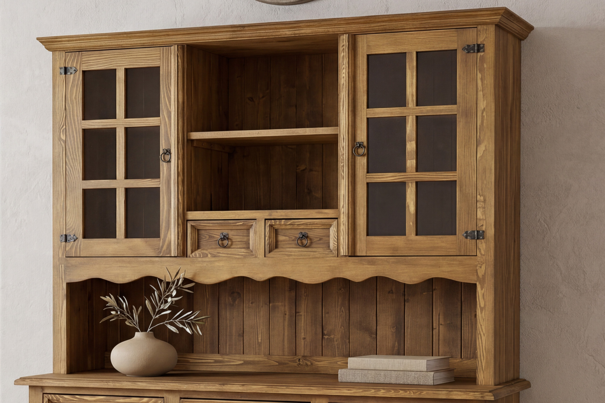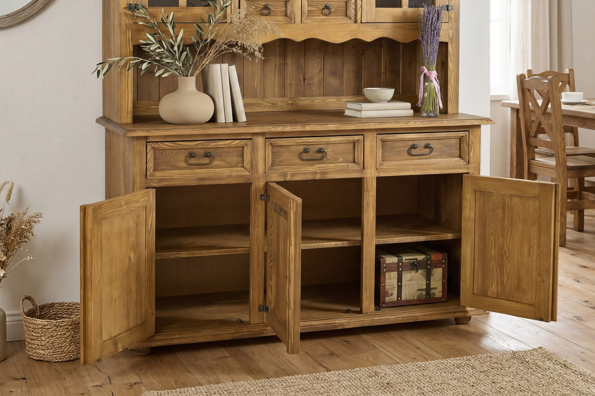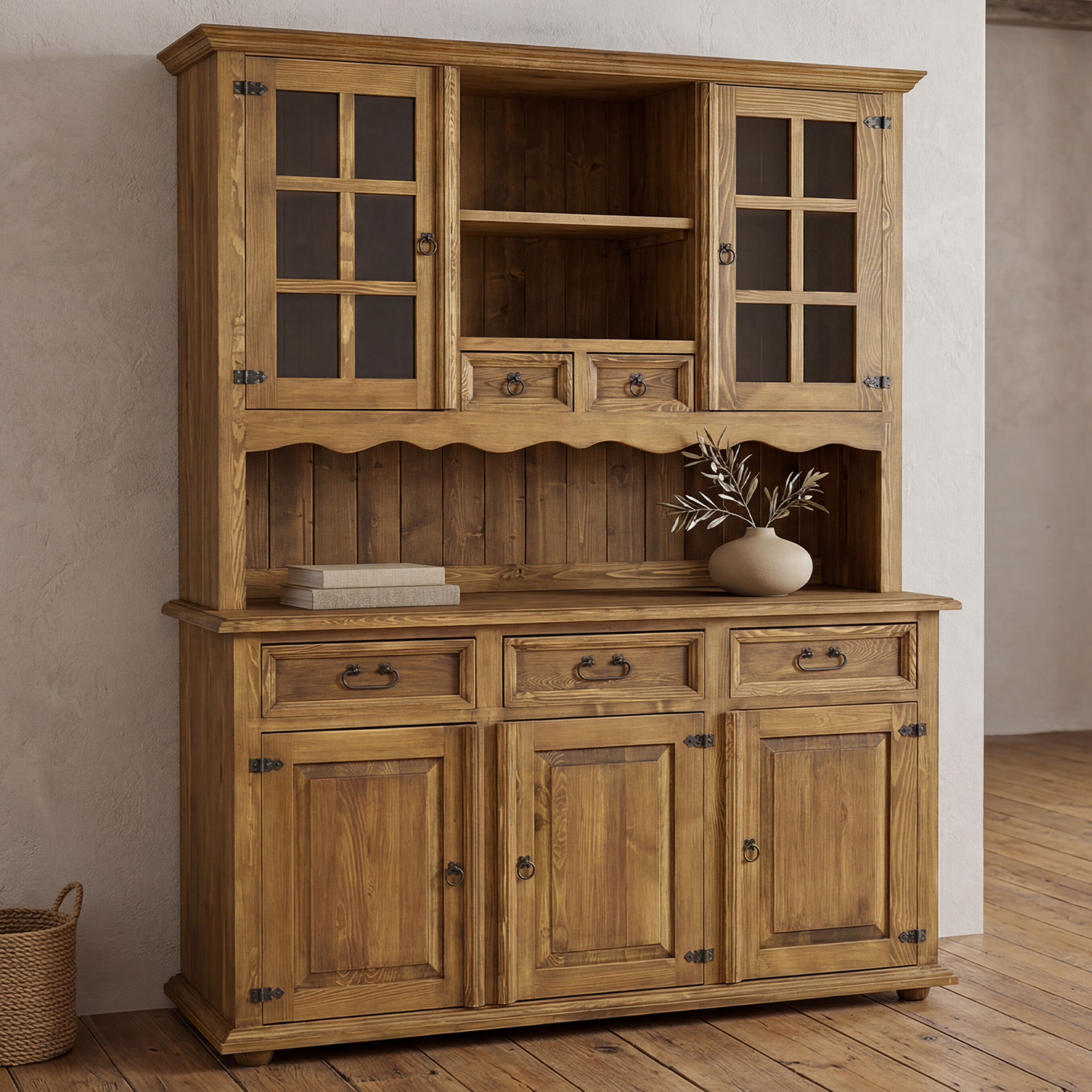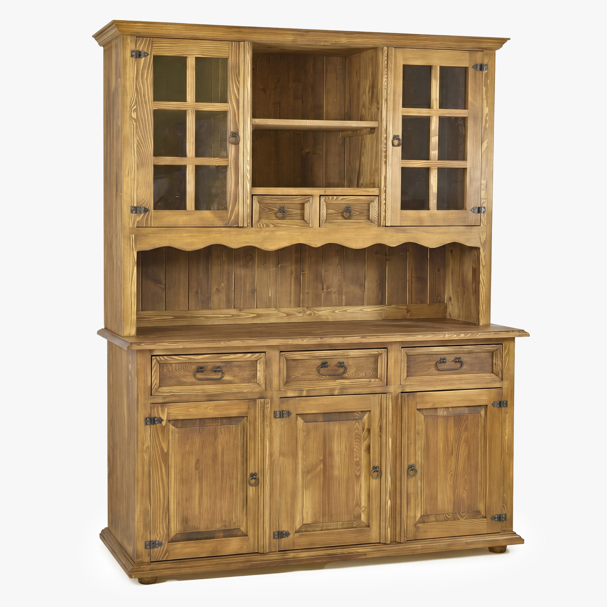 Suchen Sie einen großen rustikalen Geschirrschrank für das Esszimmer, der auf den ersten Blick beeindruckt und gleichzeitig ausreichend Stauraum bietet? Dieser Geschirrschrank im französischen Landhausstil ist aus hochwertigem Kiefernholz gefertigt und vermittelt mit seinem Aussehen perfekt die Atmosphäre eines traditionellen, gemütlichen und eleganten Zuhauses. Dank durchdachter Details, sorgfältiger handwerklicher Verarbeitung und ausgeprägtem rustikalem Charakter wird er zum dominanten Möbelstück in jedem Esszimmer, in der Küche und stilvoll eingerichteten Wohnräumen.