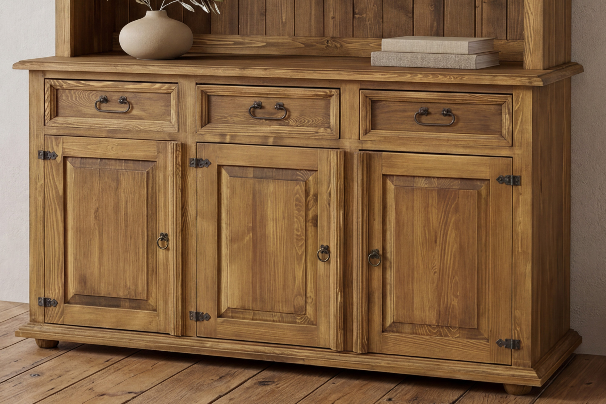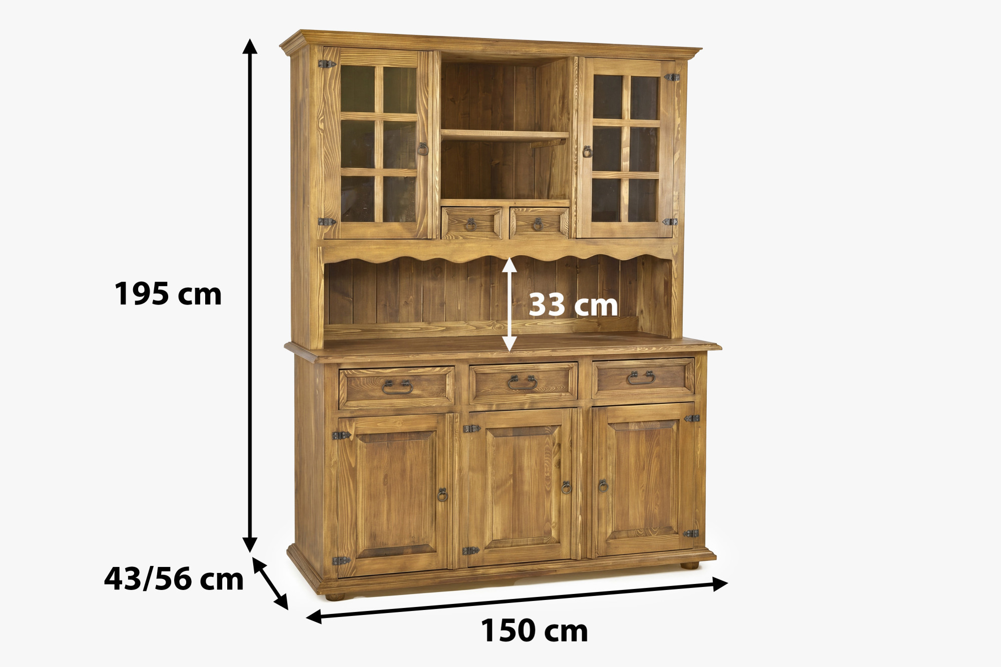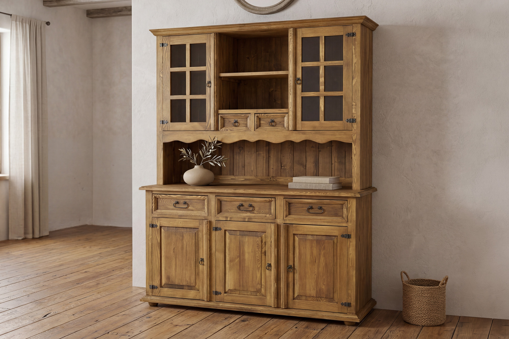 Dank der Kombination aus praktischem Stauraum und repräsentativem Aussehen eignet sich der Geschirrschrank nicht nur zur Aufbewahrung von Geschirr, Glas, Textilien oder Dekorationen, sondern auch als stilvolles Element, das das Gesamtbild des Raumes unterstreicht. Der rustikale Kiefernholz-Geschirrschrank wird jeden begeistern, der nach hochwertigen Holzmöbeln mit langer Lebensdauer und sorgfältiger Verarbeitung sucht.