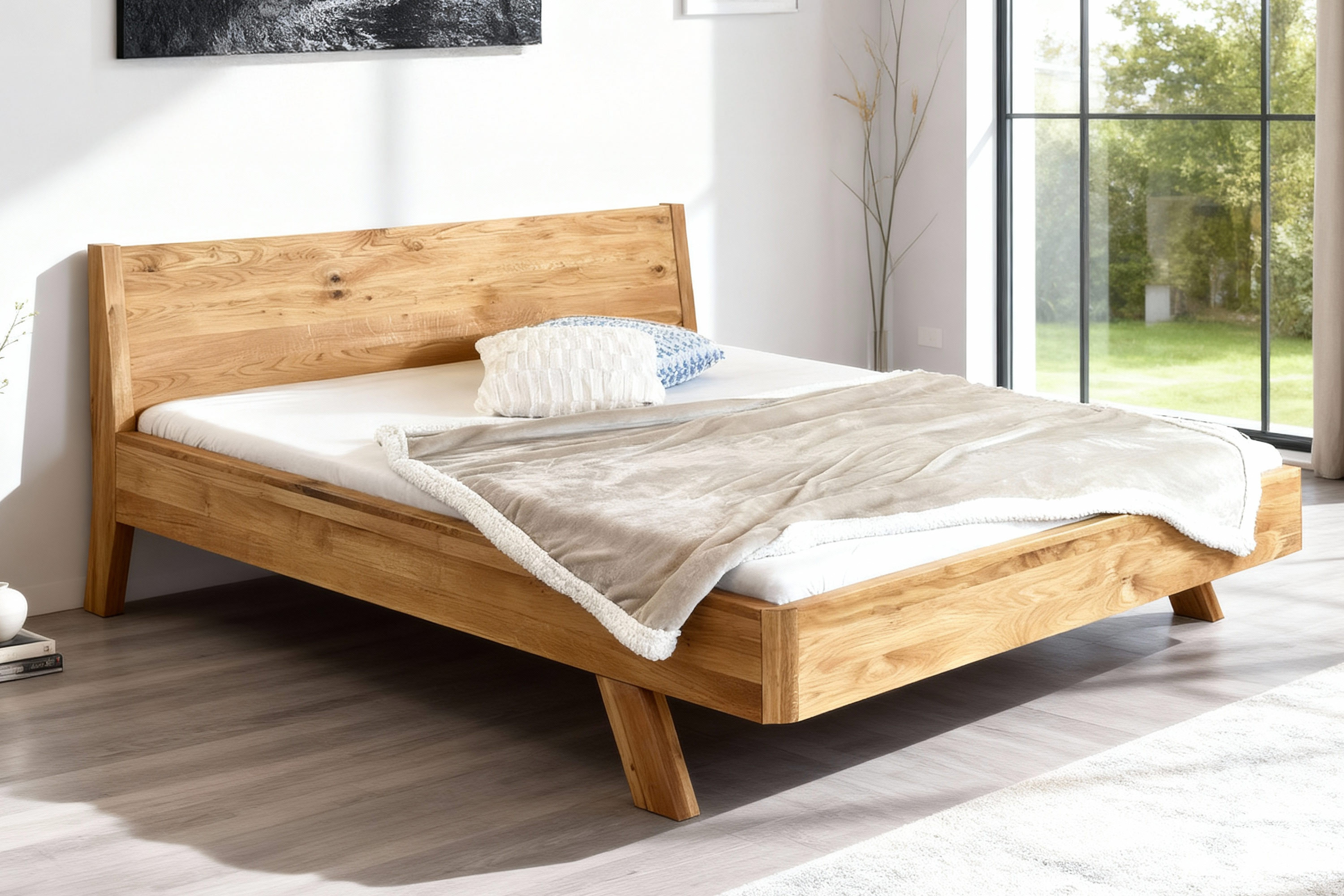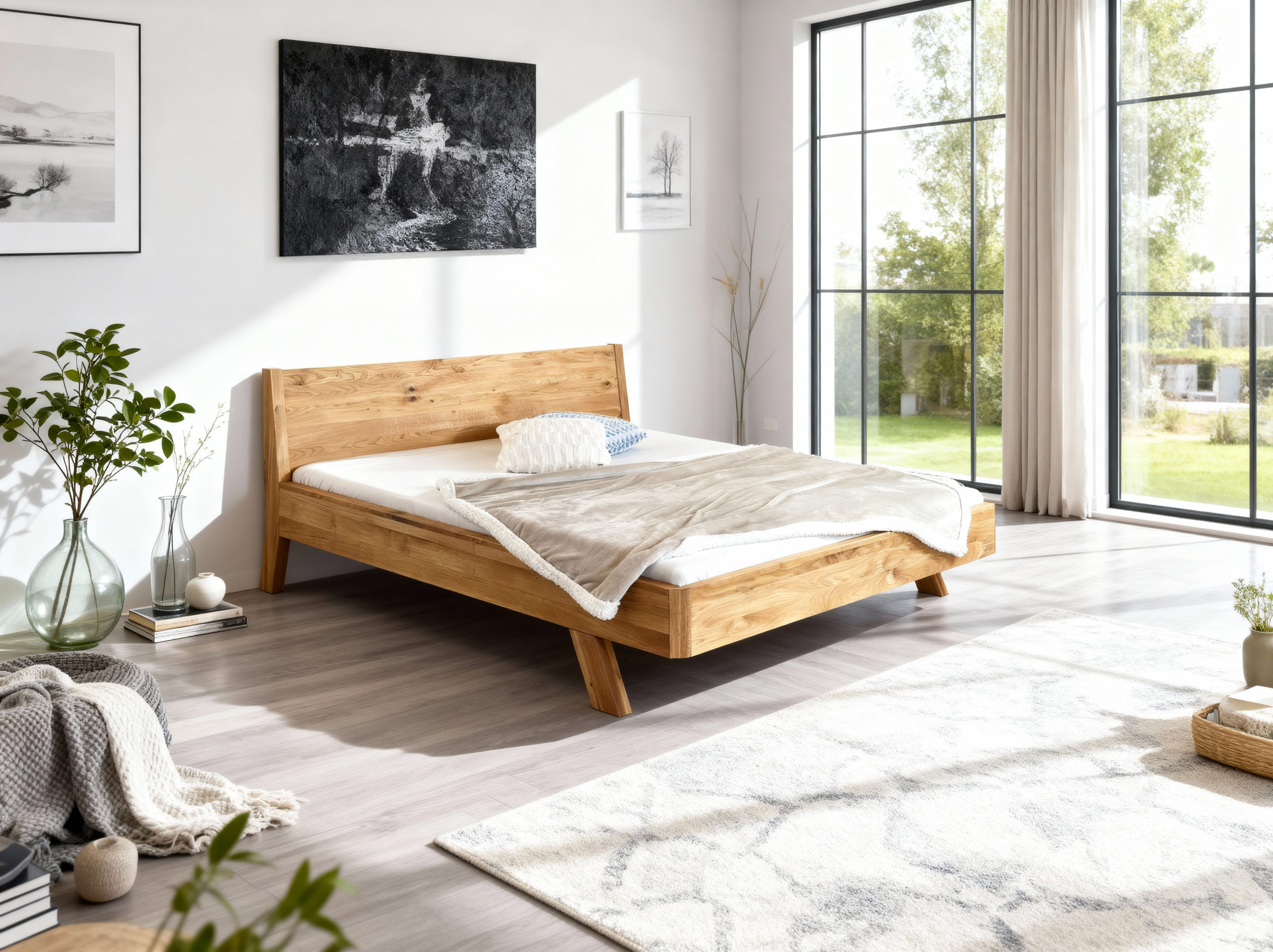 Das Bett Marina ist in den Innenmaßen 140 × 200 cm, 160 × 200 cm und 180 × 200 cm erhältlich. Seine stabile Konstruktion mit festen Verbindungen garantiert eine komfortable und sichere Nutzung über viele Jahre. Im Lieferumfang ist ein stabiler Holzlattenrost gratis enthalten, der für alle Matratzentypen geeignet ist. Das Bett lässt sich leicht mit weiteren Möbeln aus massivem Eichenholz kombinieren – von Nachttischen bis zu Kommoden – und schafft so ein harmonisches und zeitloses Interieur. Die FSC-Zertifizierung garantiert den ökologischen Ursprung des verwendeten Holzes und einen schonenden Umgang mit der Natur.