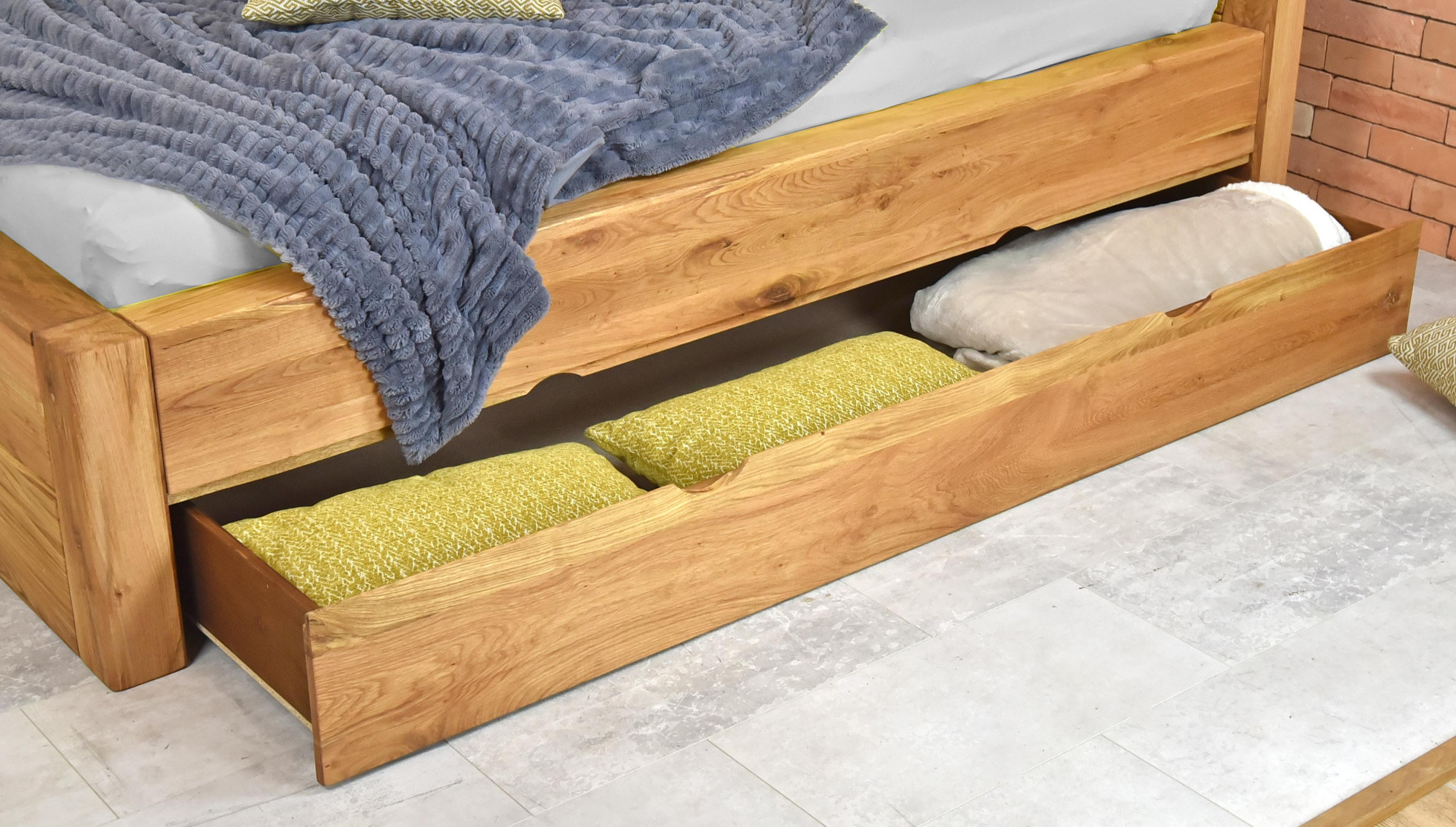 Massivholz-Bett Julia ist ein solides Möbelstück aus massiver Eiche, das Haltbarkeit, natürliche Schönheit und praktische Nutzung vereint. Dieses Massivholz-Bett mit Stauraum ist für Matratzenbreiten von 160 cm oder 180 cm erhältlich und eignet sich somit perfekt sowohl für kleinere als auch für geräumigere Schlafzimmer. Die Oberfläche des Bettes ist mit hochwertigem dänischen WOCA-Öl behandelt, das die Holzstruktur hervorhebt und vor alltäglicher Abnutzung schützt. Im Lieferumfang ist ein stabiler Holzlattenrost kostenlos enthalten, der für alle Matratzentypen geeignet ist, zudem kann auch ein Lattenrost mit Federleisten in den Rahmen eingelegt werden.
