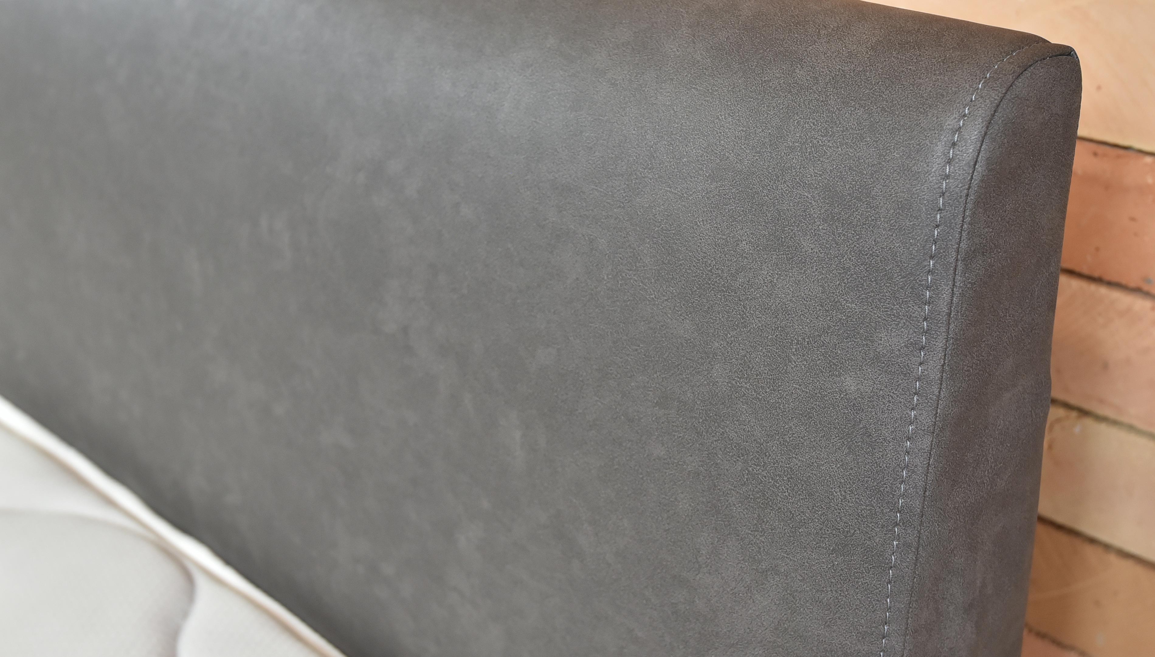 Das Bett hat ein elegantes Kopfteil aus hochwertigem Colorado-Stoff - Anthrazit, der geschliffenes Leder imitiert. Sehr angenehm im Griff, Reinigung nur mit einem leicht feuchten Tuch und PH0-Seife. Stoffzusammensetzung 62% PU-Leder, 38% PES. Abriebfestigkeit bis zu 100.000 Zyklen.