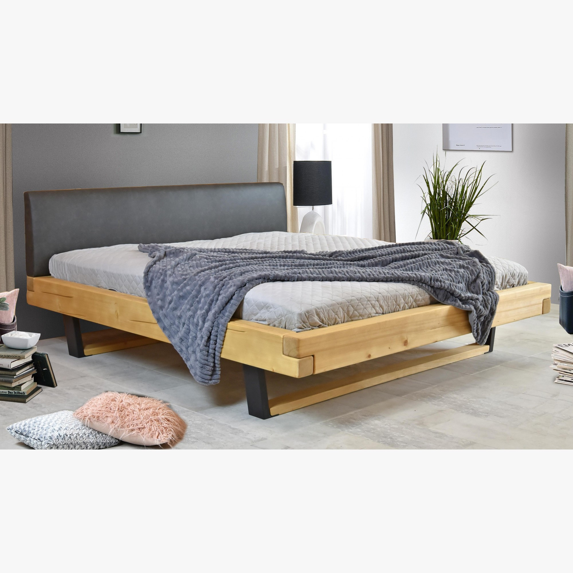 Massivholzbett Fichte 180x200 cm mit gepolstertem Kopfteil