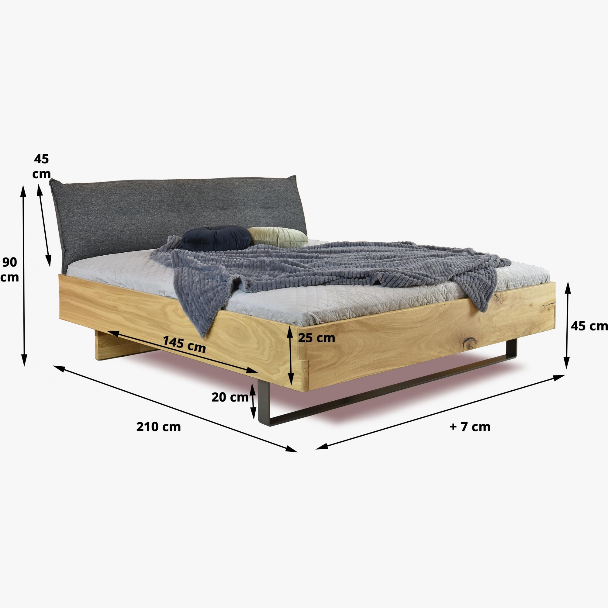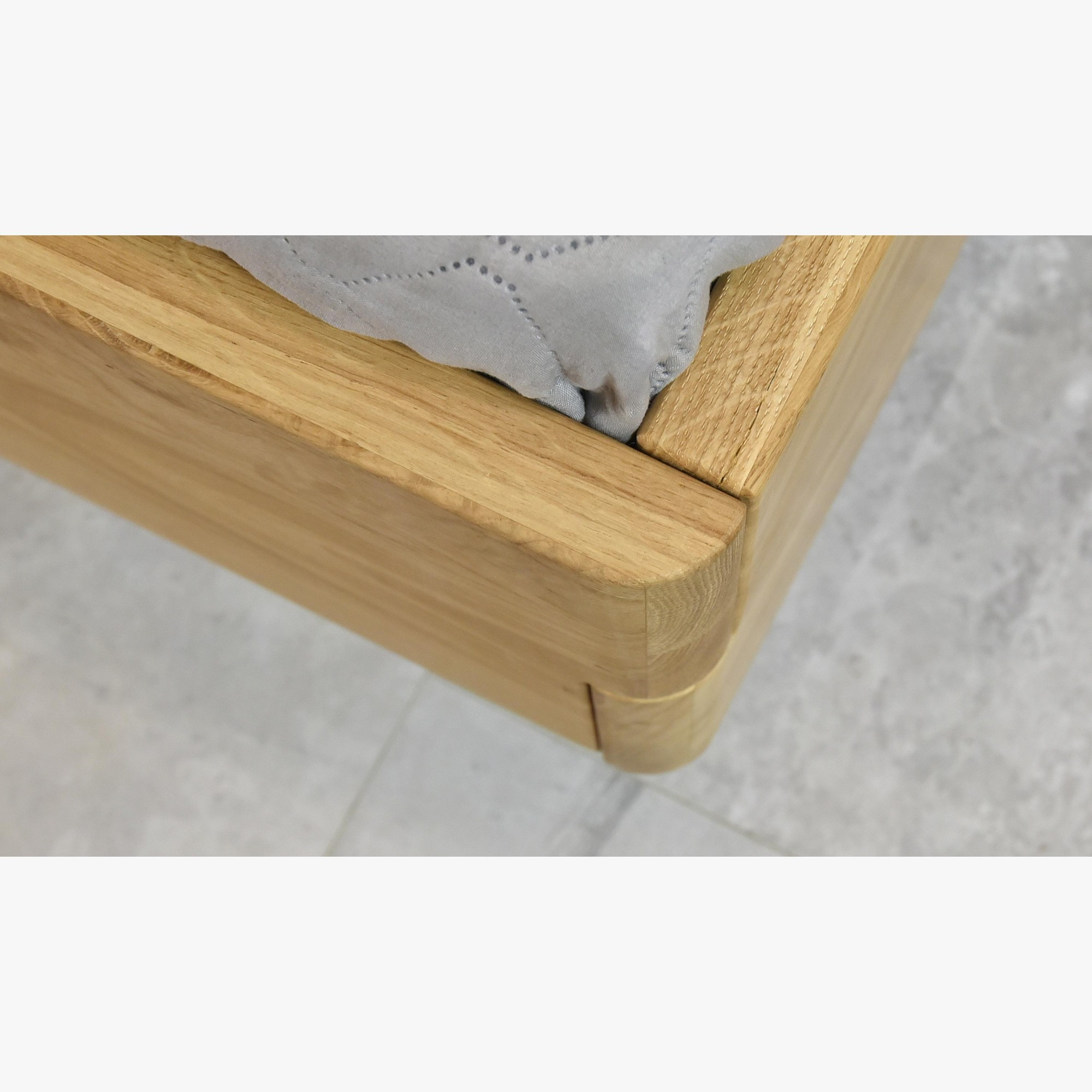 Wunderschönes, stabiles und zeitloses Ehebett Toledo aus Eiche. Neuheit für das Jahr 2020. Das Bettgestell besteht aus massivem Eichenholz, das auf der sichtbaren Seite mit ausgewähltem natürlichem Eichenfurnier versehen ist – das garantiert maximale Stabilität und eine perfekte einheitliche Optik. Das Bett ist für anspruchsvolle Kunden bestimmt. Das Bett steht auf Füßen, hinten mit massiven Eichenfüßen und vorne mit Stahlfüßen. Das Gesamtdesign des Bettes ist das Meisterwerk von Designern und Statikern, um eine perfekte Harmonie zu erzielen. Der Lattenrost kann in 3 Höhenstufen eingestellt werden. Der Lattenrost ist nicht im Lieferumfang enthalten, wir empfehlen, unseren hochwertigen Lattenrost dazu zu bestellen, der voll kompatibel mit dem Toledo-Bett ist. Das Kopfteil ist aus sehr hochwertigem Stoff mit angenehmer Polsterung in dunkelgrauer Farbe gefertigt. Das Bett wird zerlegt geliefert. Die Materialstärke beträgt 3 cm. Das sorgt für hohe Stabilität. Die empfohlene Belastung des Bettes beträgt bis zu 220 kg, Person max. 110 kg.