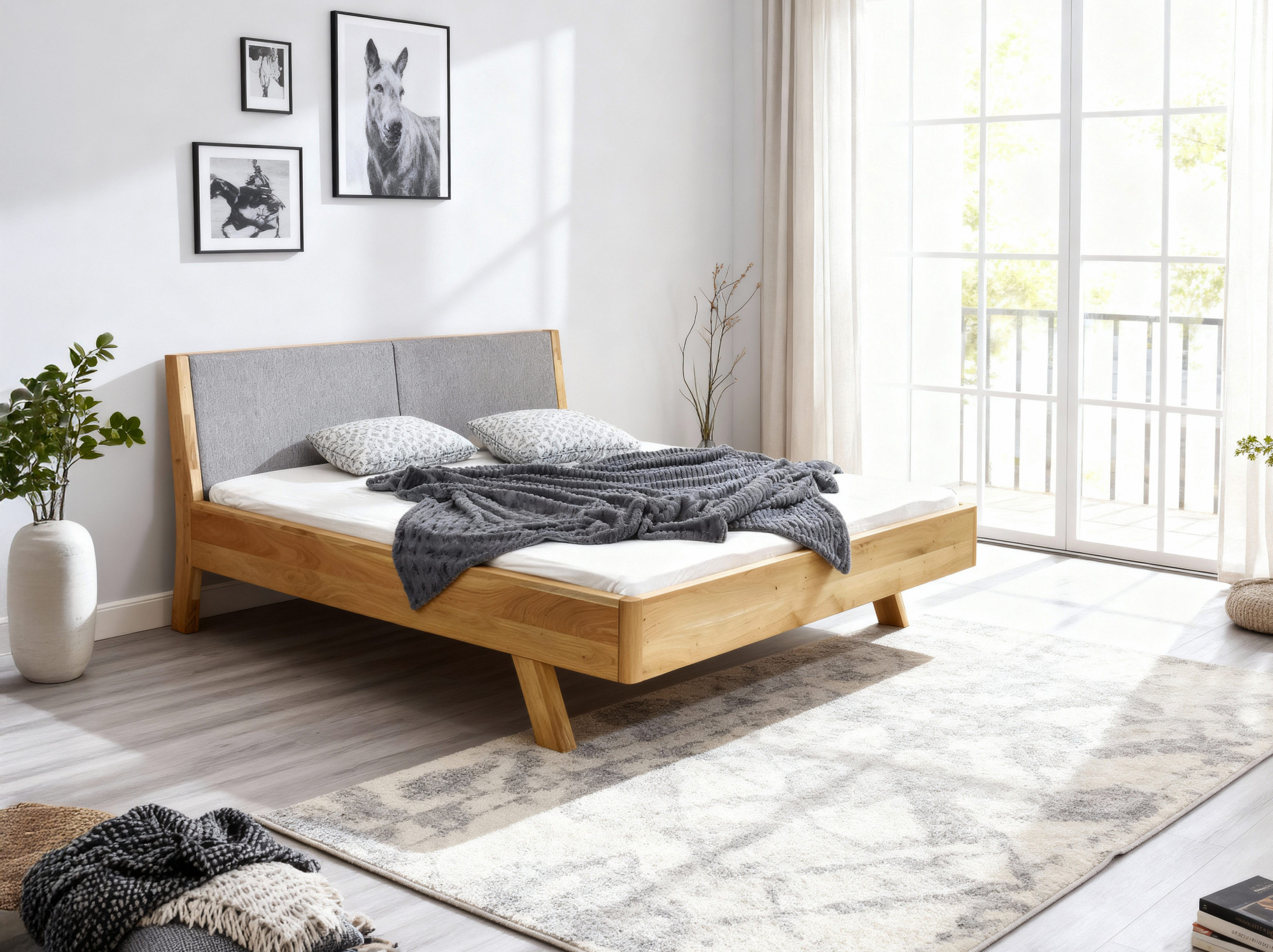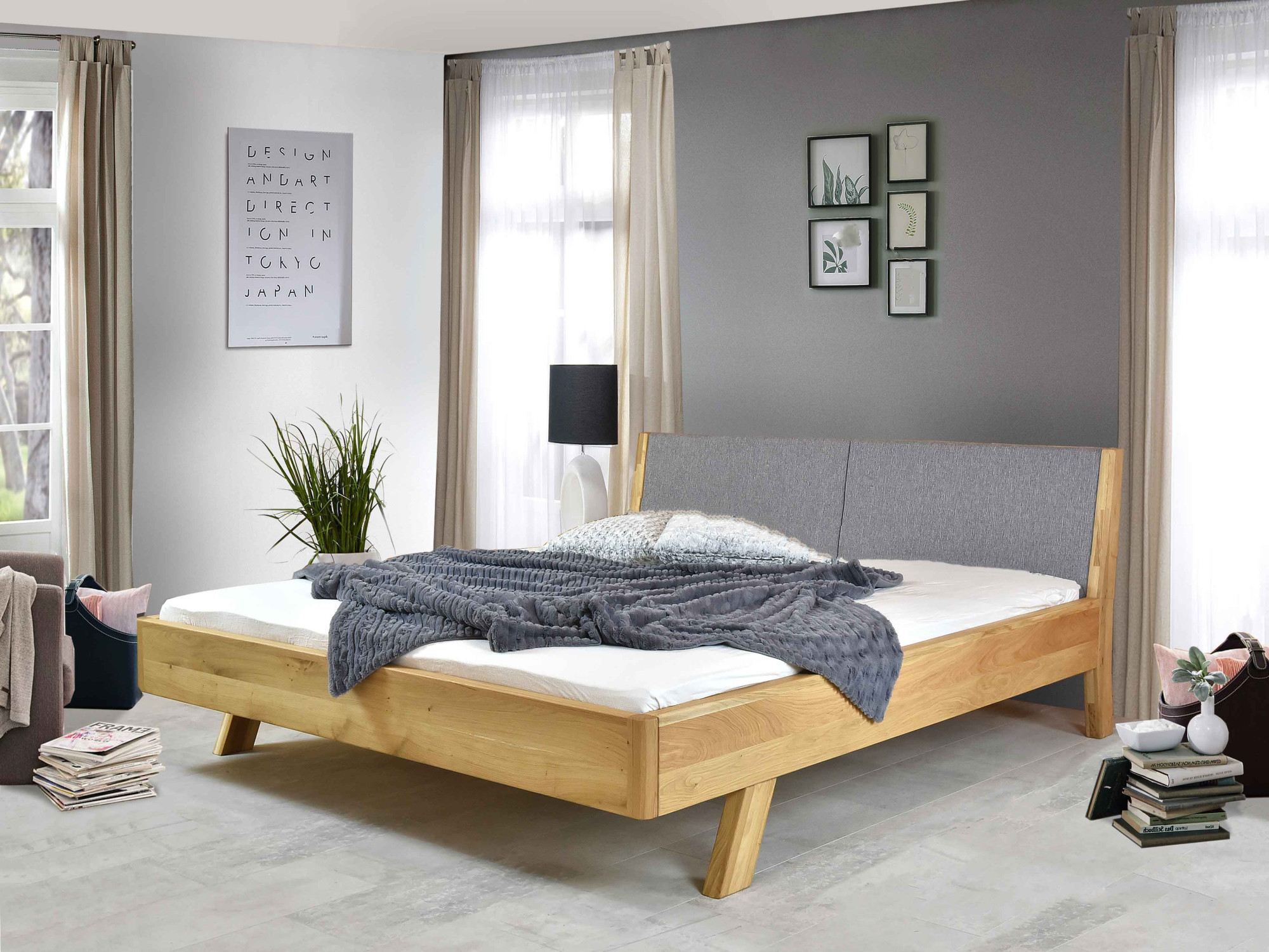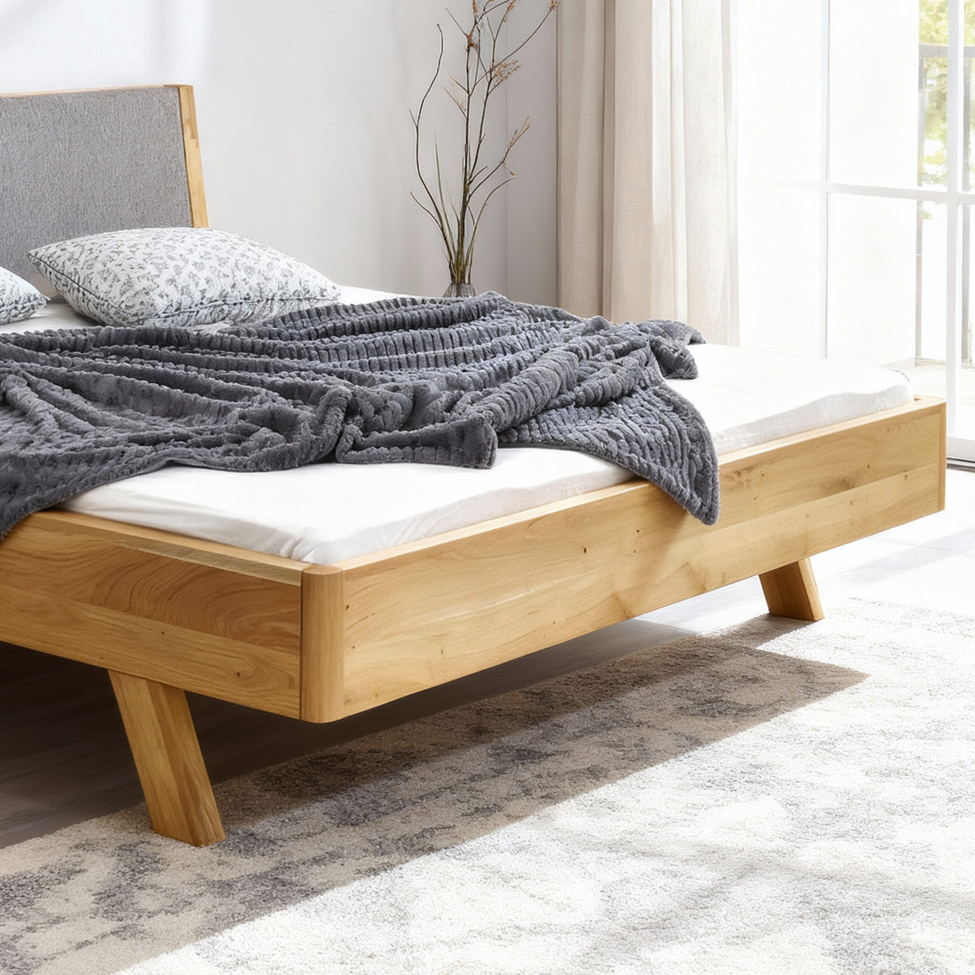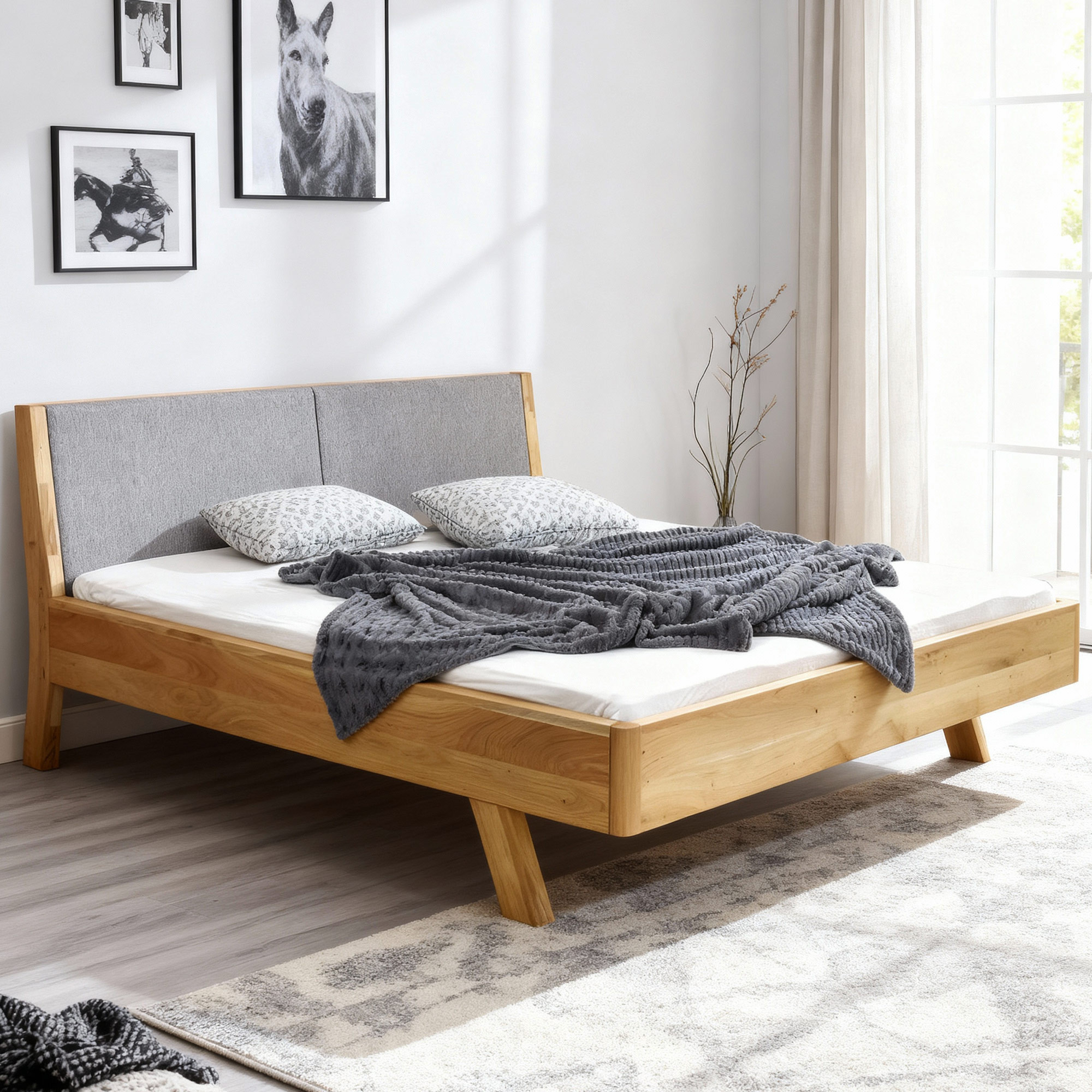 Massivholzbett Eiche 180x200 cm mit grauem Stoffkopfteil