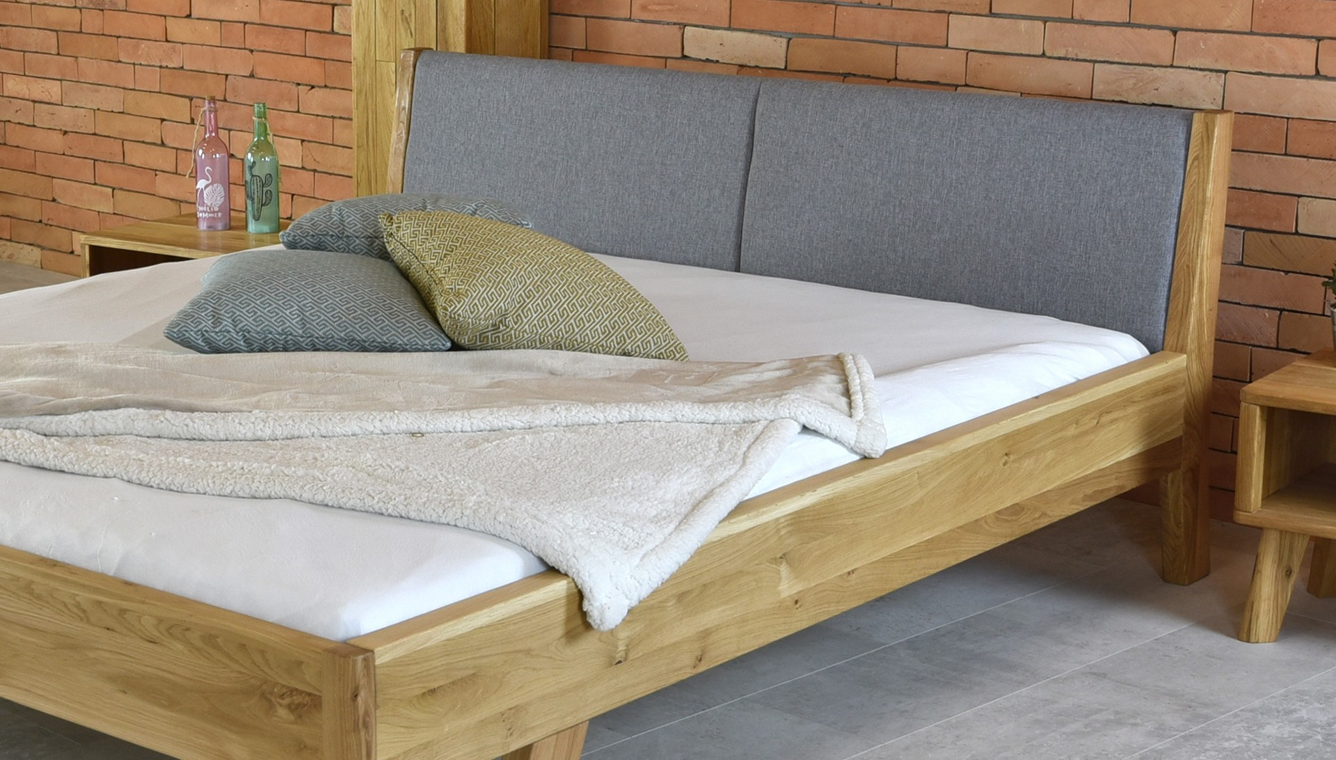 Massivholzbett Marina aus Eiche mit gepolstertem Kopfteil stellt die perfekte Verbindung von natürlichem Massivholz und modernem Design dar. Dieses Ehebett aus massivem Eichenholz wird aus 100% Eichenholz gefertigt und vom Designer Matúš Mirek mit Fokus nicht nur auf Ästhetik, sondern vor allem auf Funktionalität und gesunden Schlaf entworfen. Das elegante Stoffkopfteil in grauer Farbe verleiht dem Bett ein modernes Aussehen und schafft gleichzeitig eine gemütliche Atmosphäre in Ihrem Schlafzimmer. Stabile massive Verbindungen und sorgfältige Verarbeitung garantieren auch nach Jahren der Benutzung hohe Stabilität. Die Innenmaße des Bettes 180 x 200 cm oder 160 x 200 cm sind ideal für Ehepaare. Zum Bett liefern wir ein stabiles Lattenrost aus Holz völlig kostenlos.