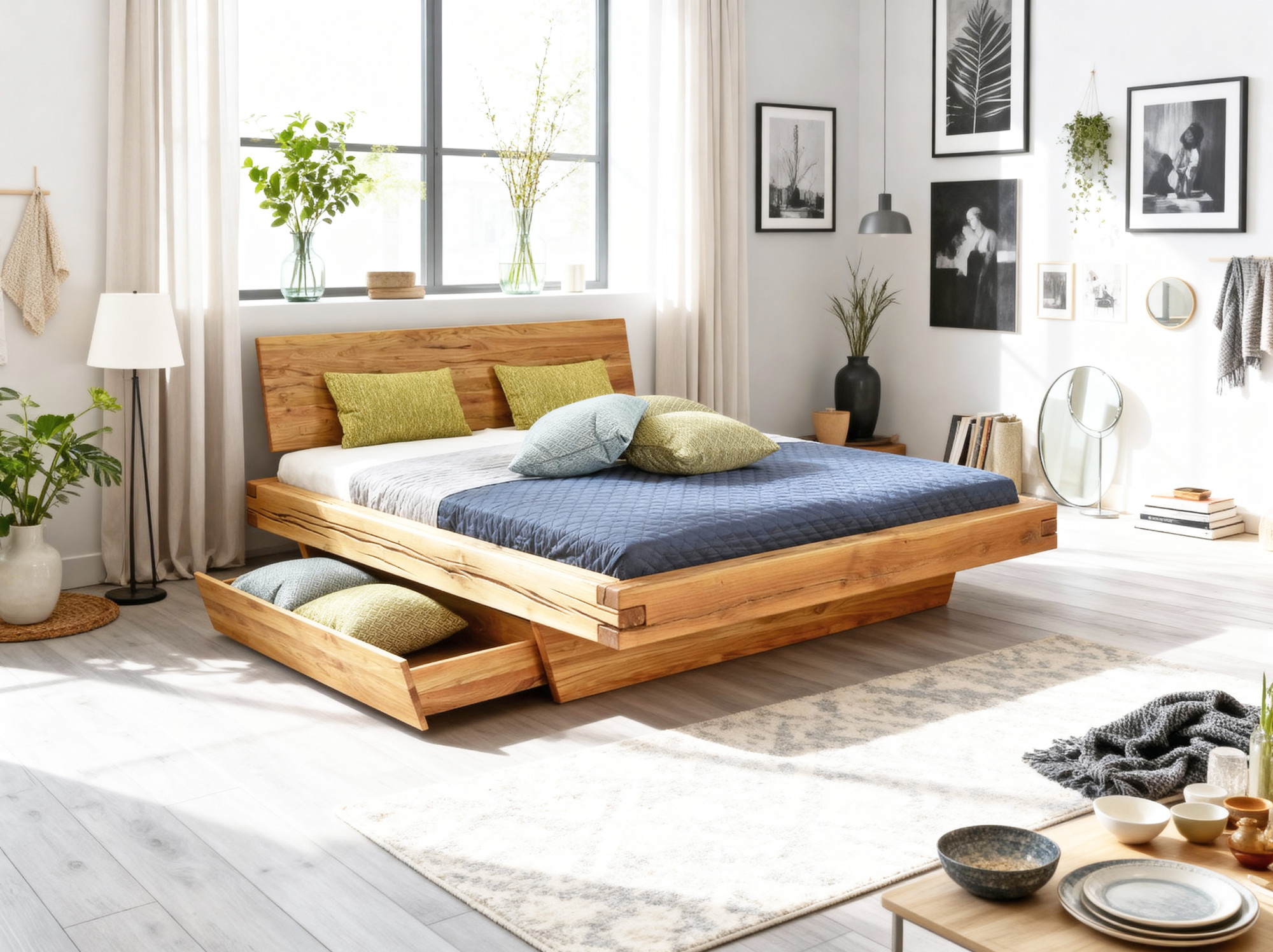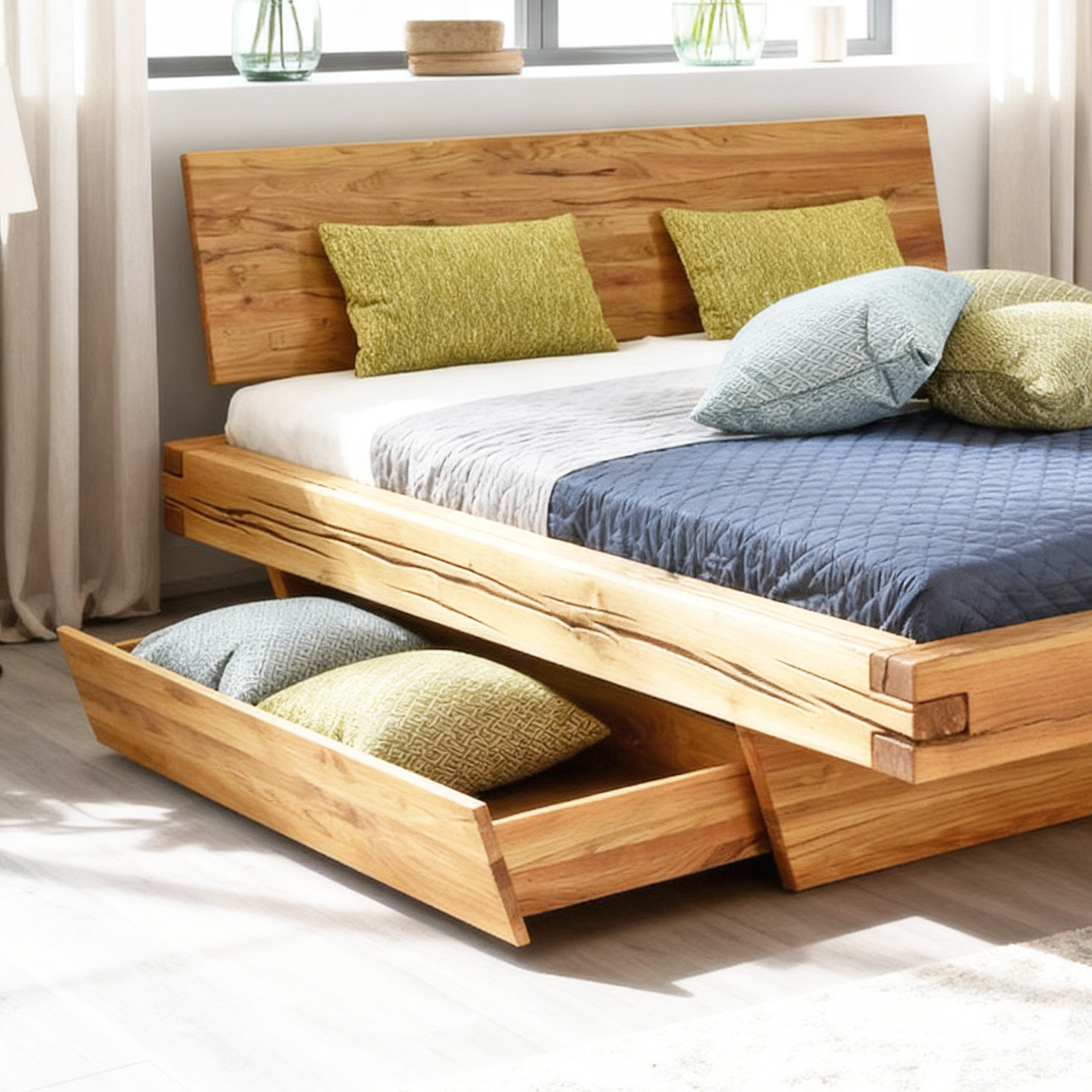 Das Bett ist äußerst stabil und langlebig, gefertigt aus massivem Eichenholz mit robusten Balken.