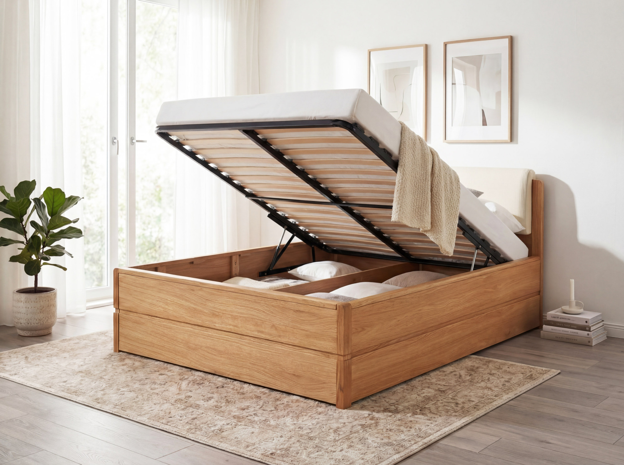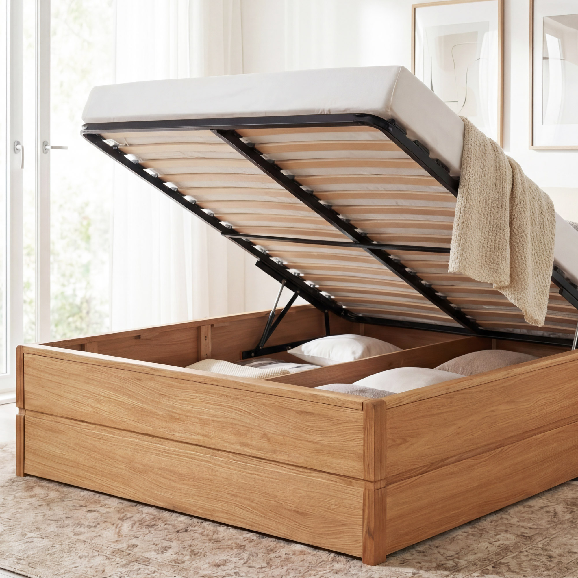 Im Lieferumfang ist ein hochwertiger Lattenrost mit 34 Latten enthalten. Die Matratze können Sie separat nach Ihren Vorlieben und Bedürfnissen dazukaufen. - Wie funktioniert der Stauraum?