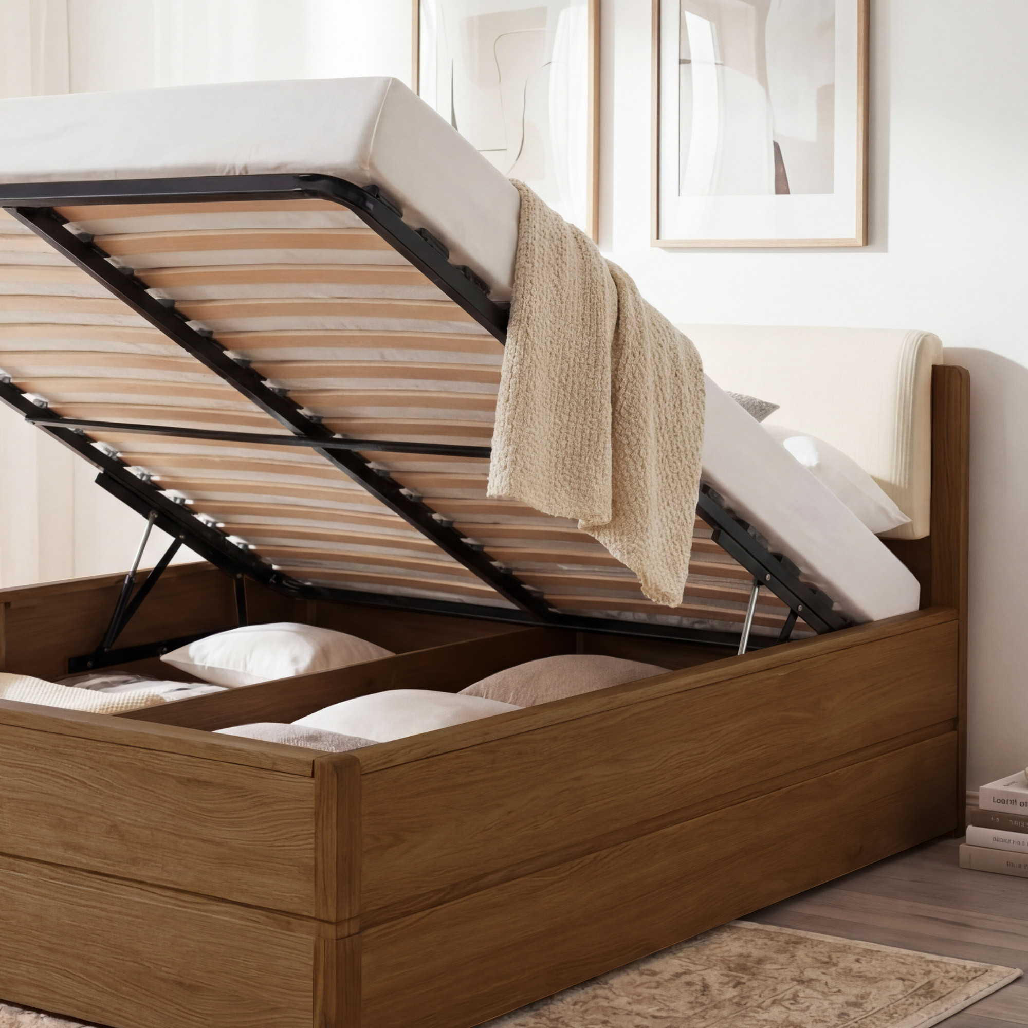 Im Lieferumfang ist ein hochwertiger Lattenrost mit 34 Latten enthalten. Die Matratze können Sie je nach Ihren Vorlieben und Bedürfnissen separat dazu kaufen. - Wie funktioniert der Stauraum?