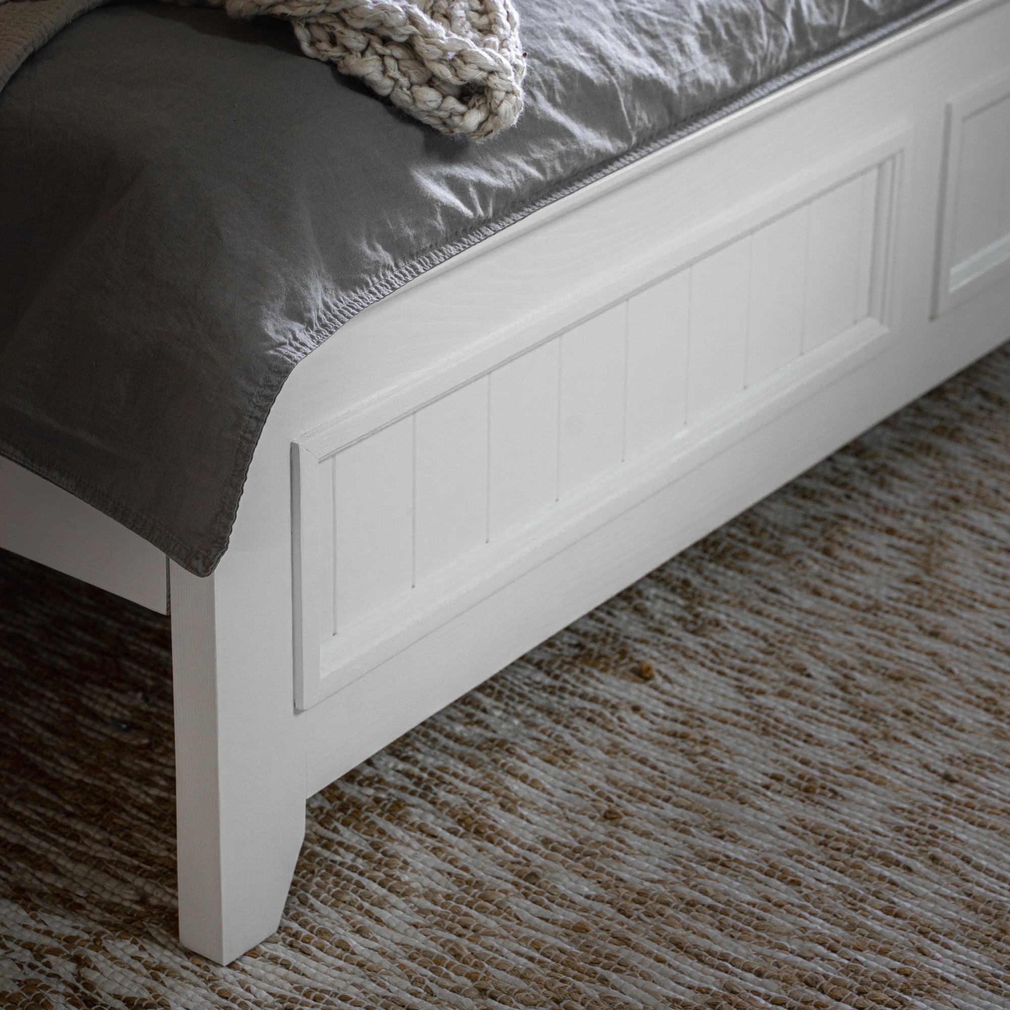 Die Konstruktion des Bettes ist stabil und langlebig, gefertigt aus massivem Kiefernholz mit einer weißen, wasserbasierten Lackierung, die die Holzstruktur sichtbar lässt. Das Bett lässt sich hervorragend mit weiteren Möbeln der Lille Kollektion kombinieren. Der Lattenrost ist nicht im Preis enthalten, jedoch kann jeder passende Lattenrost problemlos in den Bettrahmen eingesetzt werden. Die Oberfläche ist pflegeleicht und durch natürliche Bienenwachs- und Lackbehandlung geschützt.