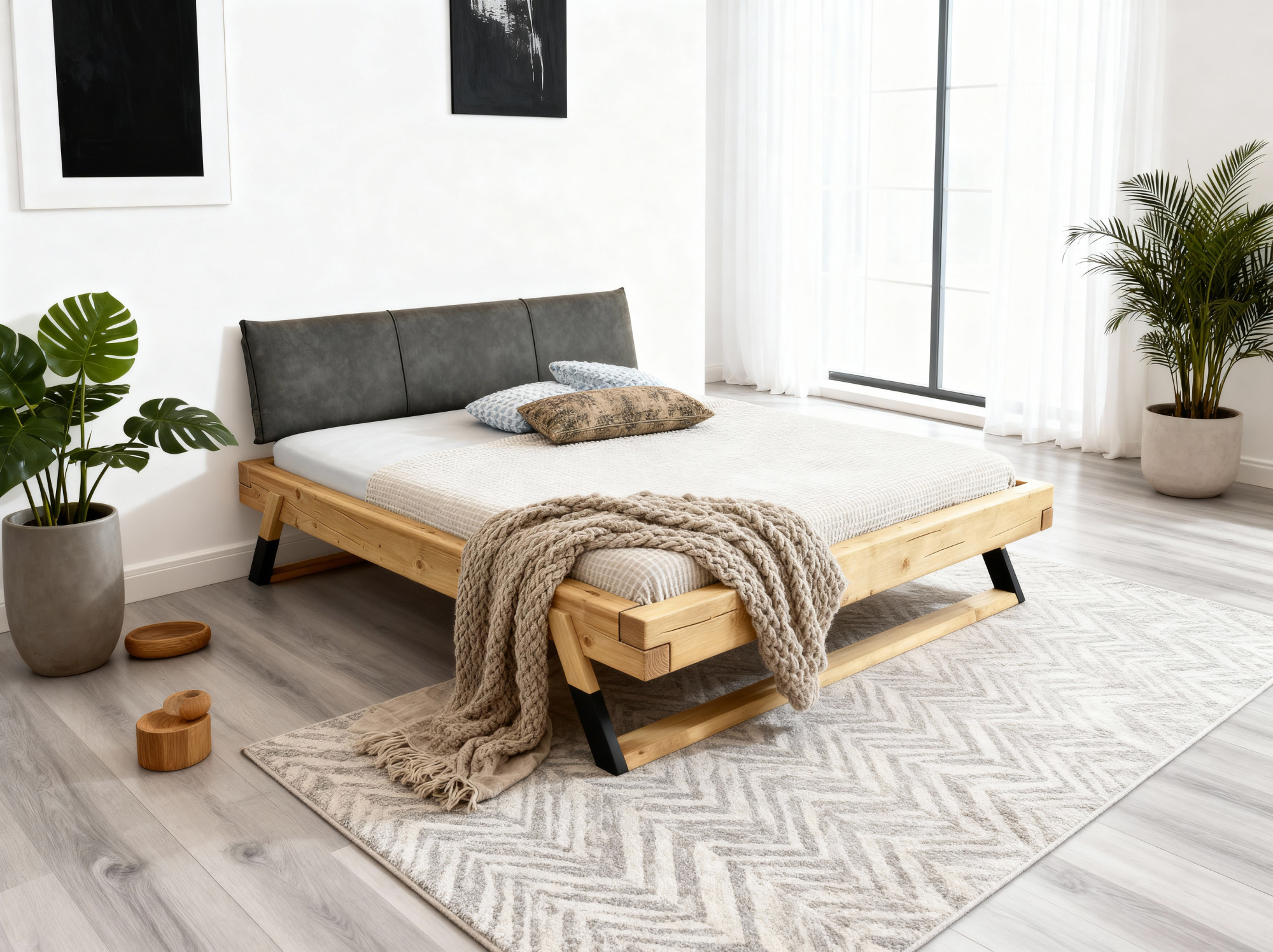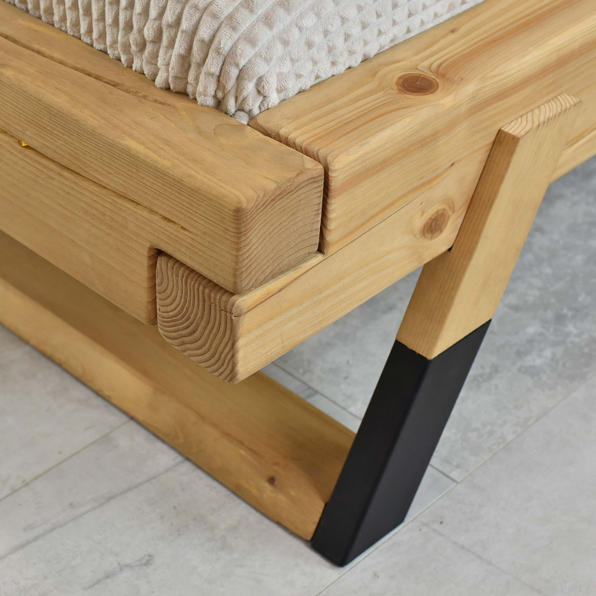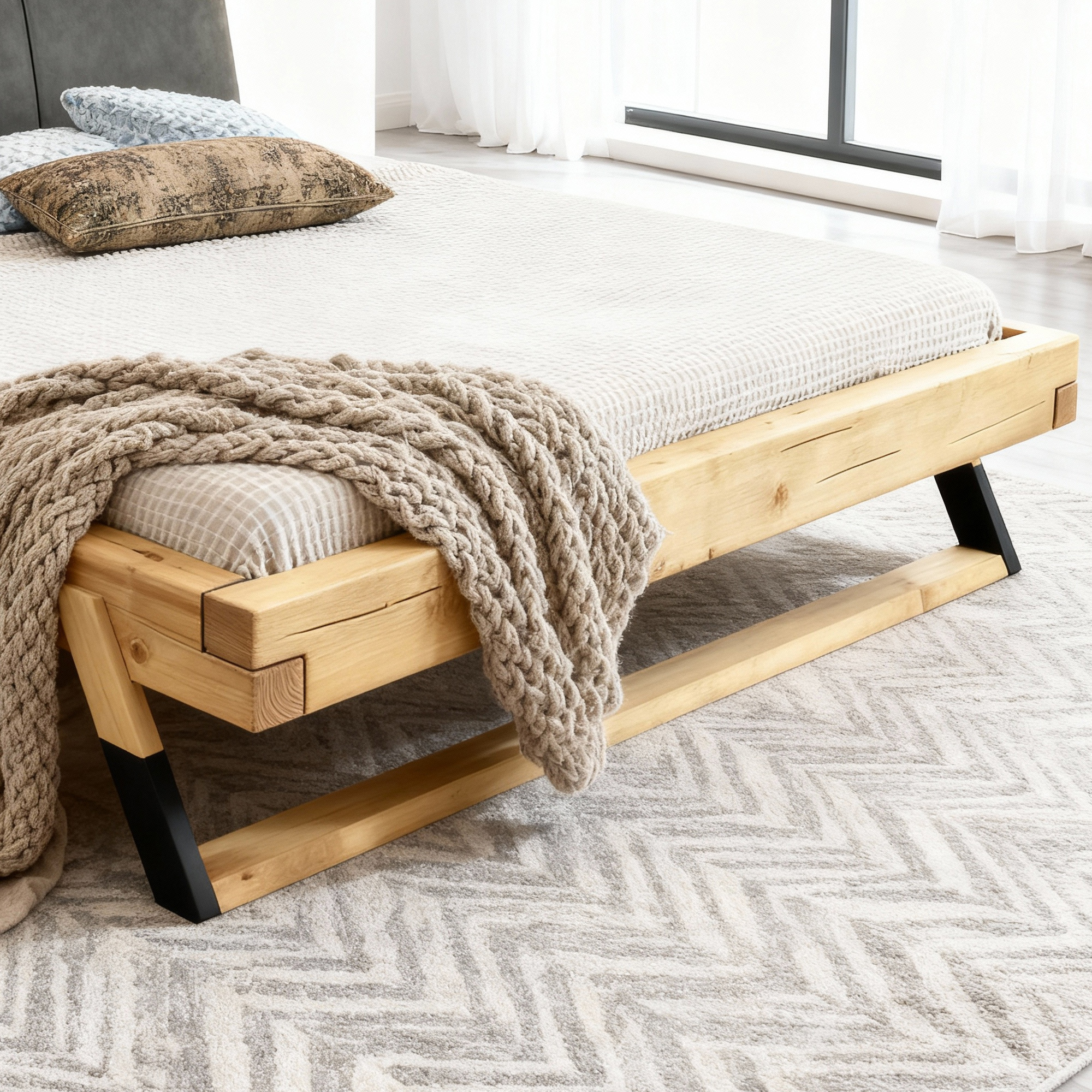 Die Konstruktion besteht aus robusten Balken mit den Maßen 16 × 9 cm, die mit natürlichem Öl behandelt sind, um die Holzmaserung hervorzuheben und das Material zu schützen. Die stabilen, mattschwarzen Metallbeine sorgen für eine zeitlose, industrielle Optik. Das Bett ist kompatibel mit jedem Lattenrost (nicht im Lieferumfang enthalten), der einfach in den Rahmen eingelegt werden kann. Die einfache Montage ermöglicht einen schnellen Aufbau.