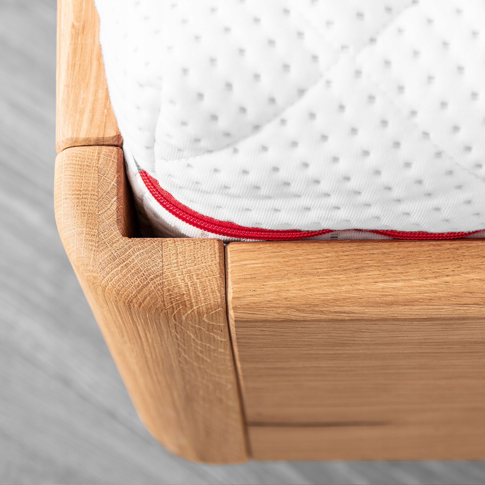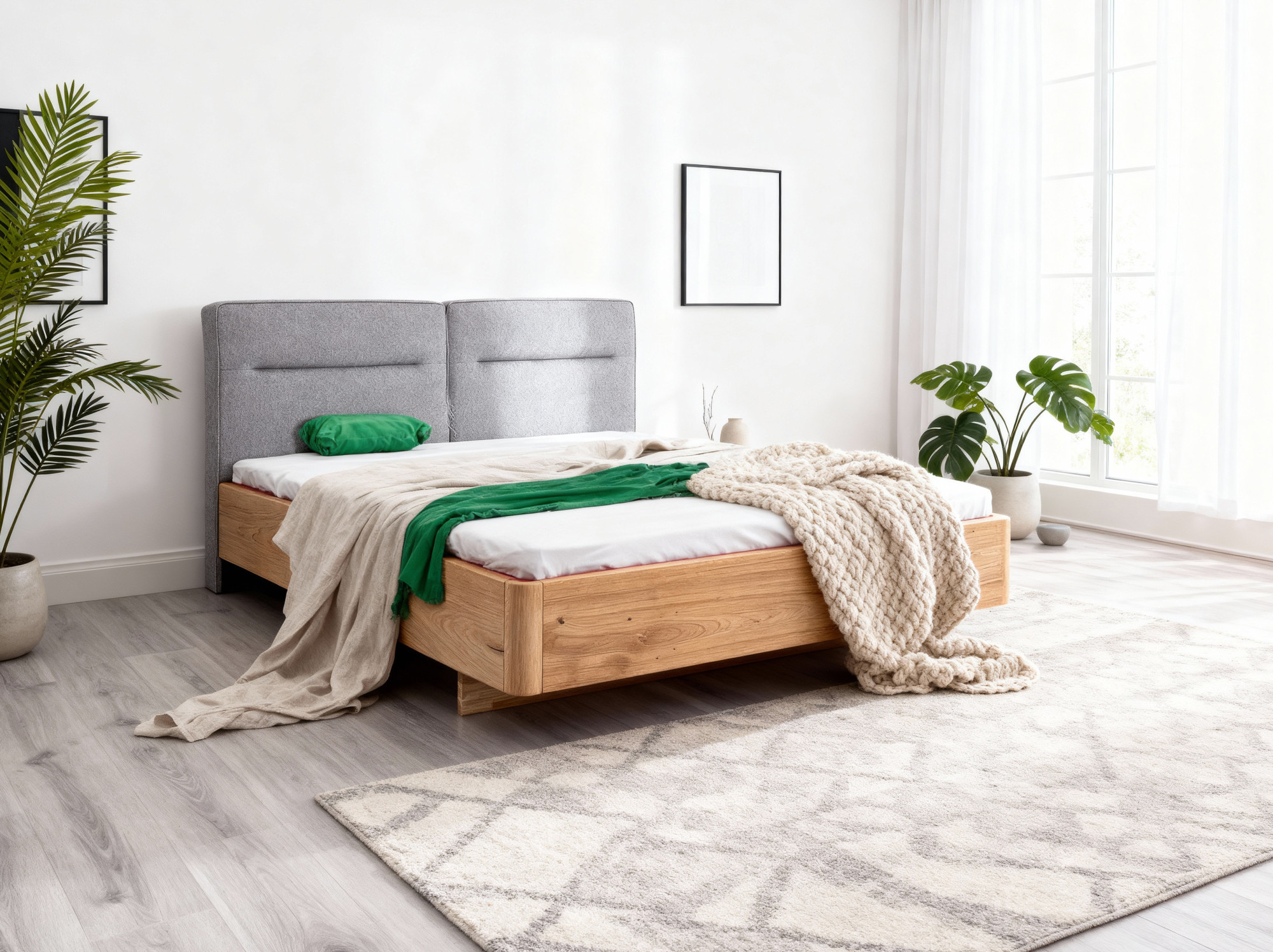Das Doppelbett im modernen Design mit den Maßen für eine Matratze 180 x 200 cm verbindet Tradition mit Moderne durch die Verwendung von hochwertigem Eichenholz. Der Bettrahmen aus Eiche mit einer imposanten Stärke von 3 cm sorgt für Robustheit und Langlebigkeit. Das Kopfteil des Bettes, gefertigt aus erstklassigem Polsterschaum PU, sorgt für Komfort und Stil, was durch die moderne Polsterung in elegantem Grauton verstärkt wird. Abgerundete Ecken verleihen dem Bett eine einzigartige Note und gewährleisten Sicherheit. Um die Schönheit und Qualität des Holzes zu bewahren, ist es mit dem Markenöl Livos aus Deutschland im Farbton Natur Eiche behandelt, das dem Bett ein perfektes Finish verleiht.