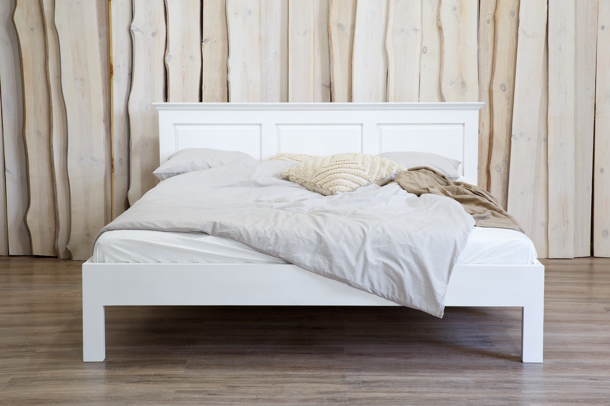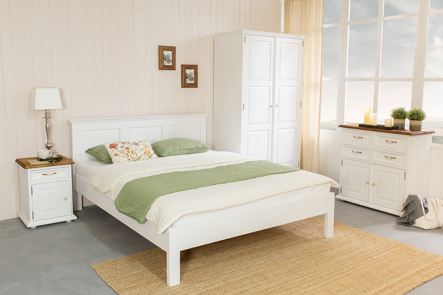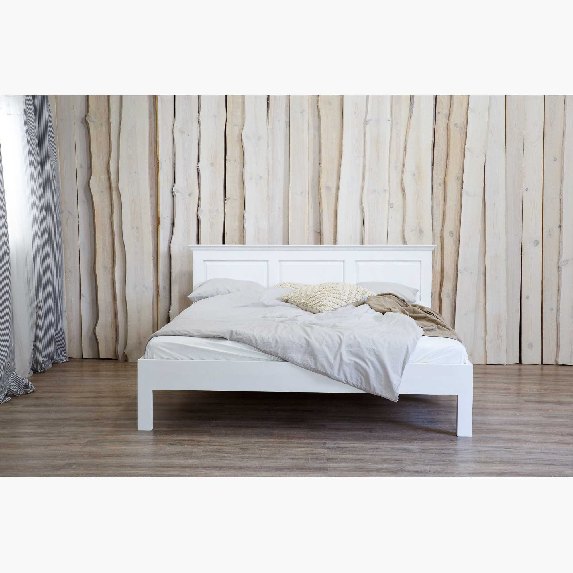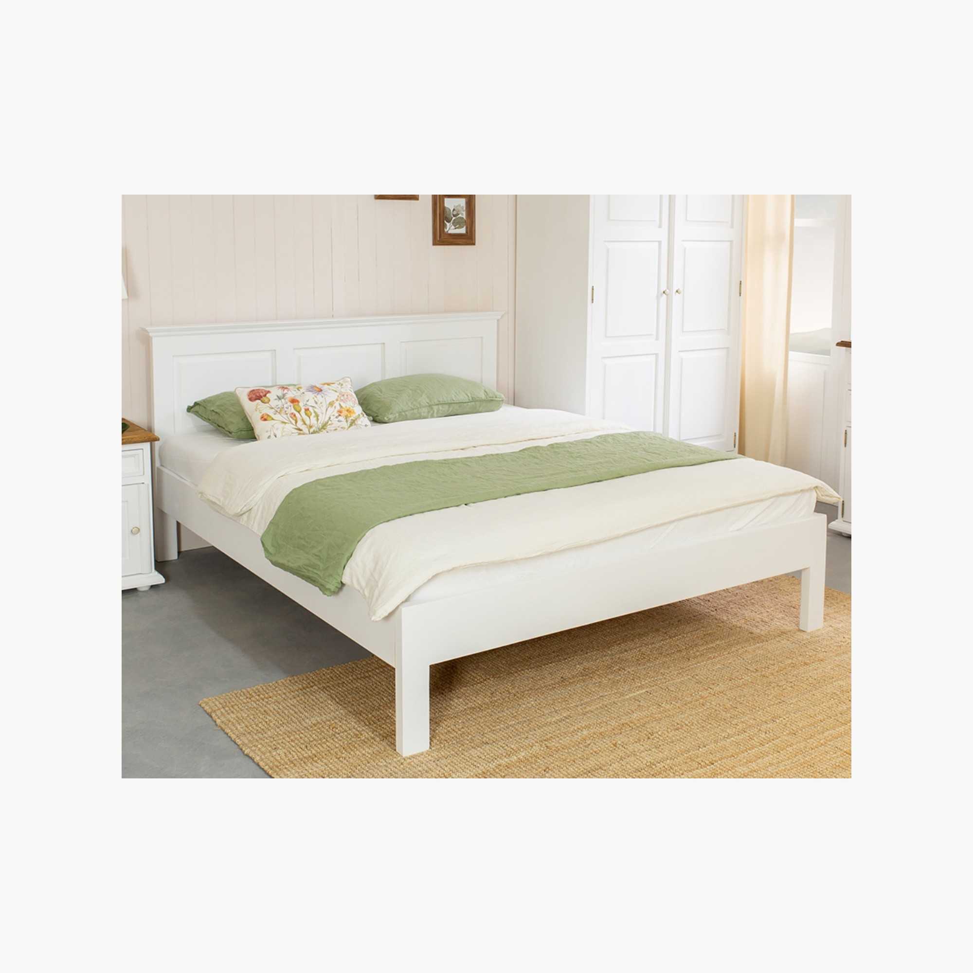 Die Konstruktion ist stabil und langlebig, mit einem zusätzlichen fünften Bein in der Mitte für erhöhte Belastbarkeit. Die Oberfläche ist in zwei Varianten erhältlich: klassische weiße Ökofarbe oder die Patina-Variante mit charakteristischem verwittertem Look. Das Bett lässt sich hervorragend mit weiteren Möbeln der Provence-Kollektion kombinieren, wie Nachttisch, Kleiderschrank und Kommode.