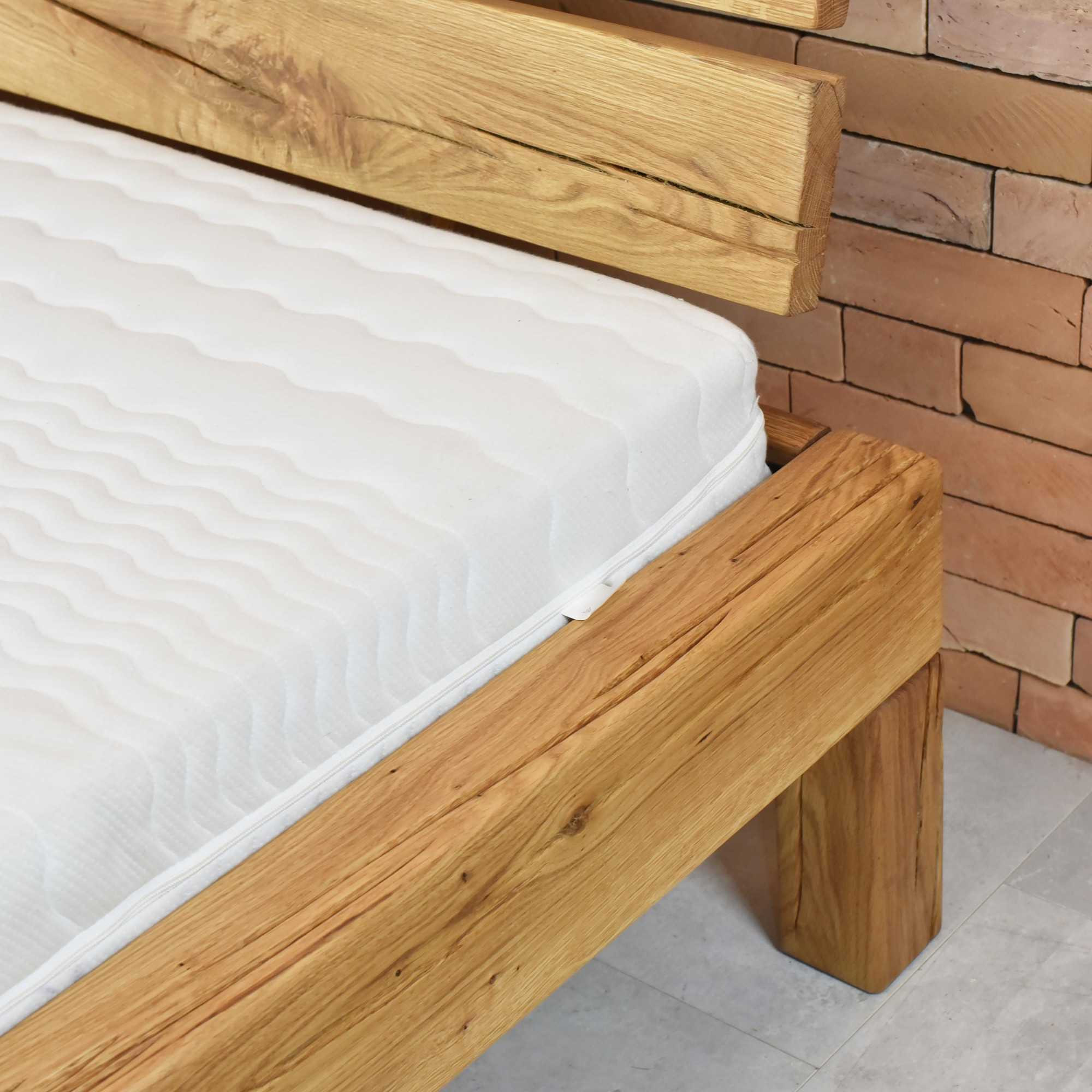 Der Bettrahmen ist auf außergewöhnliche Festigkeit und Robustheit ausgelegt, unter Verwendung von Eichenbalken mit den Maßen 15 x 9 cm. Die Investition in das Bett Ernad ist eine Investition in Ihre Gesundheit und Lebensqualität. Dank der Verwendung von Eichenholz, bekannt für seine Massivität und Härte, bieten wir ein Bett an, das die Zeit überdauert und Ihnen über viele Jahre hinweg treu bleibt. Natürliche Risse und Spalten im Holz sind ein Zeichen seiner Authentizität und natürlichen Schönheit.