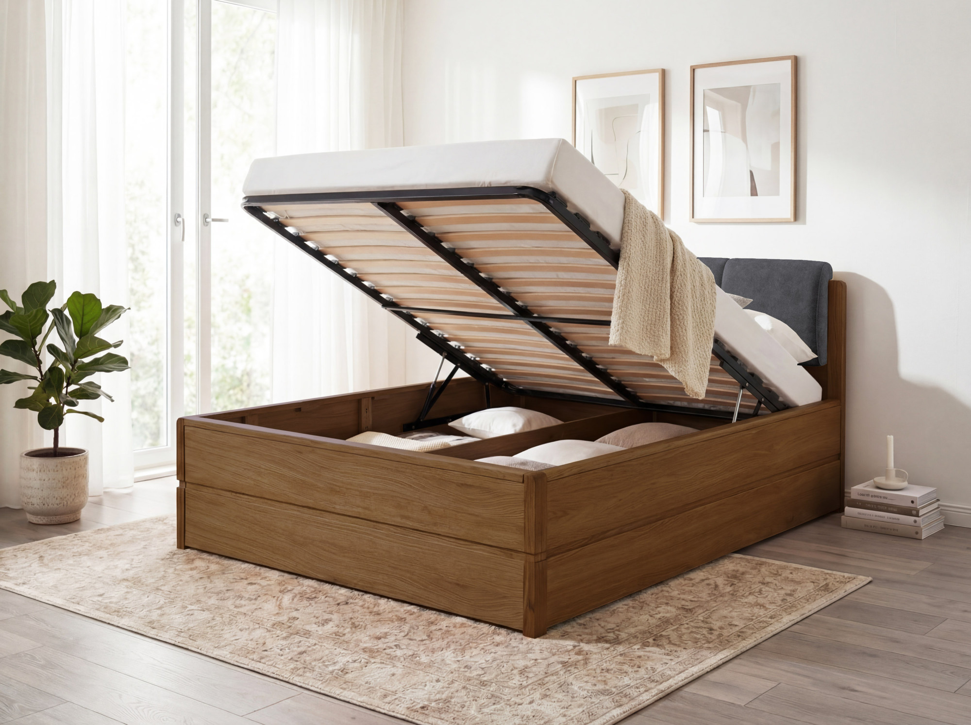 Im Lieferumfang ist ein hochwertiger Lattenrost mit 34 Latten enthalten. Die Matratze können Sie separat nach Ihren Vorlieben und Bedürfnissen dazukaufen. - Wie funktioniert der Stauraum?