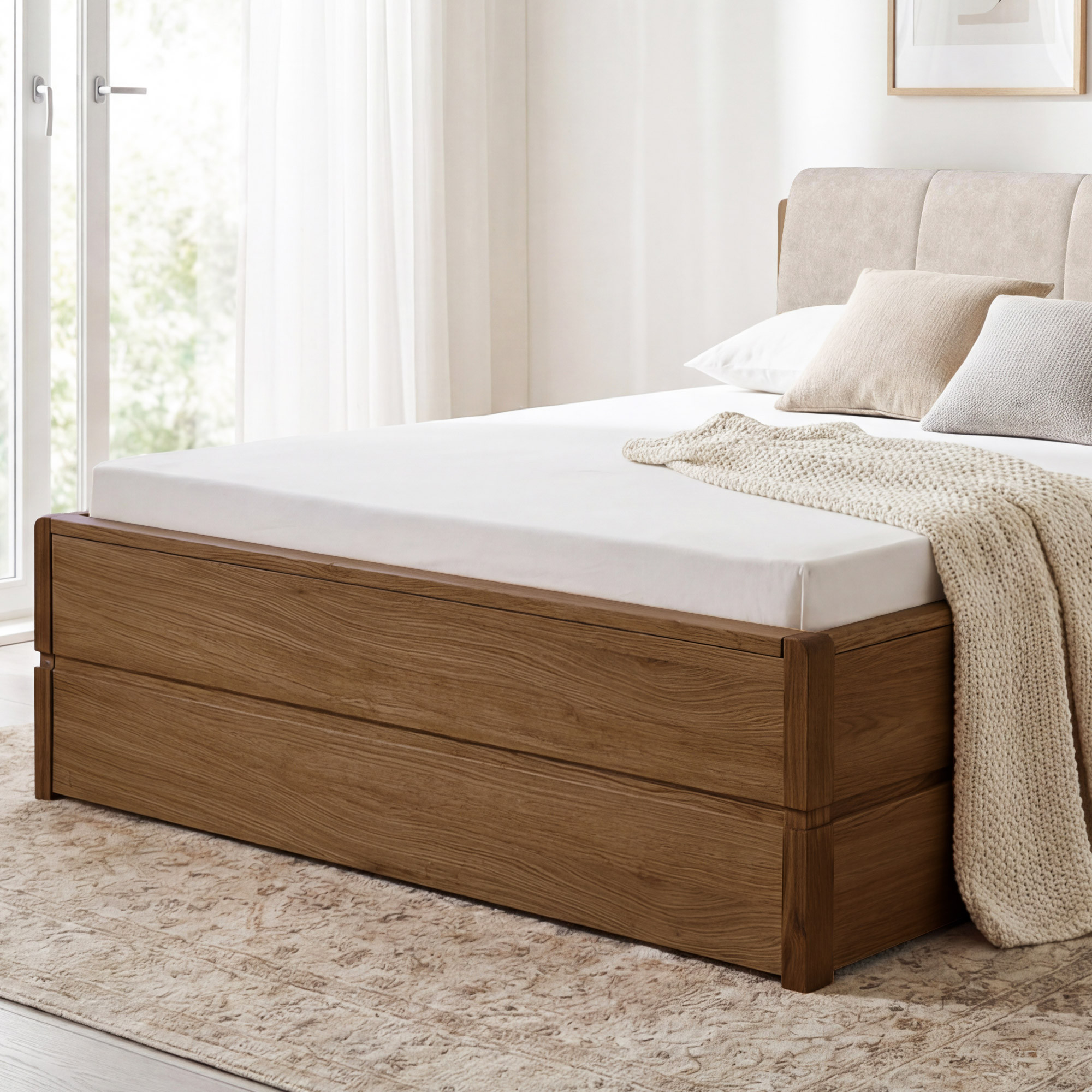 Gönnen Sie sich höchsten Komfort auf dem Eichenbett Helsinki in der Übergröße 200 x 200 cm, das einen eleganten dunklen Ton gebrannte Eiche mit einem weichen Stoffkopfteil D'oro 5114 kombiniert. Diese großzügige Größe bietet ausreichend Platz auch für die anspruchsvollsten Schläfer. Das Bett ist aus gebürstetem massivem Wildeichenholz gefertigt – durch eine spezielle Oberflächenbehandlung wird der weichere Holzanteil entfernt, wodurch die ausgeprägte natürliche Struktur und die charakteristische Jahresringzeichnung besonders zur Geltung kommen. Der dunkle Ton gebrannte Eiche verleiht dem Bett einen anspruchsvollen und luxuriösen Charakter, während die schöne Holzstruktur vollständig erhalten bleibt. Unter der Liegefläche befindet sich zudem ein geräumiger Stauraum, in dem Sie Bettwäsche, Decken oder saisonale Kleidung mühelos verstauen können.