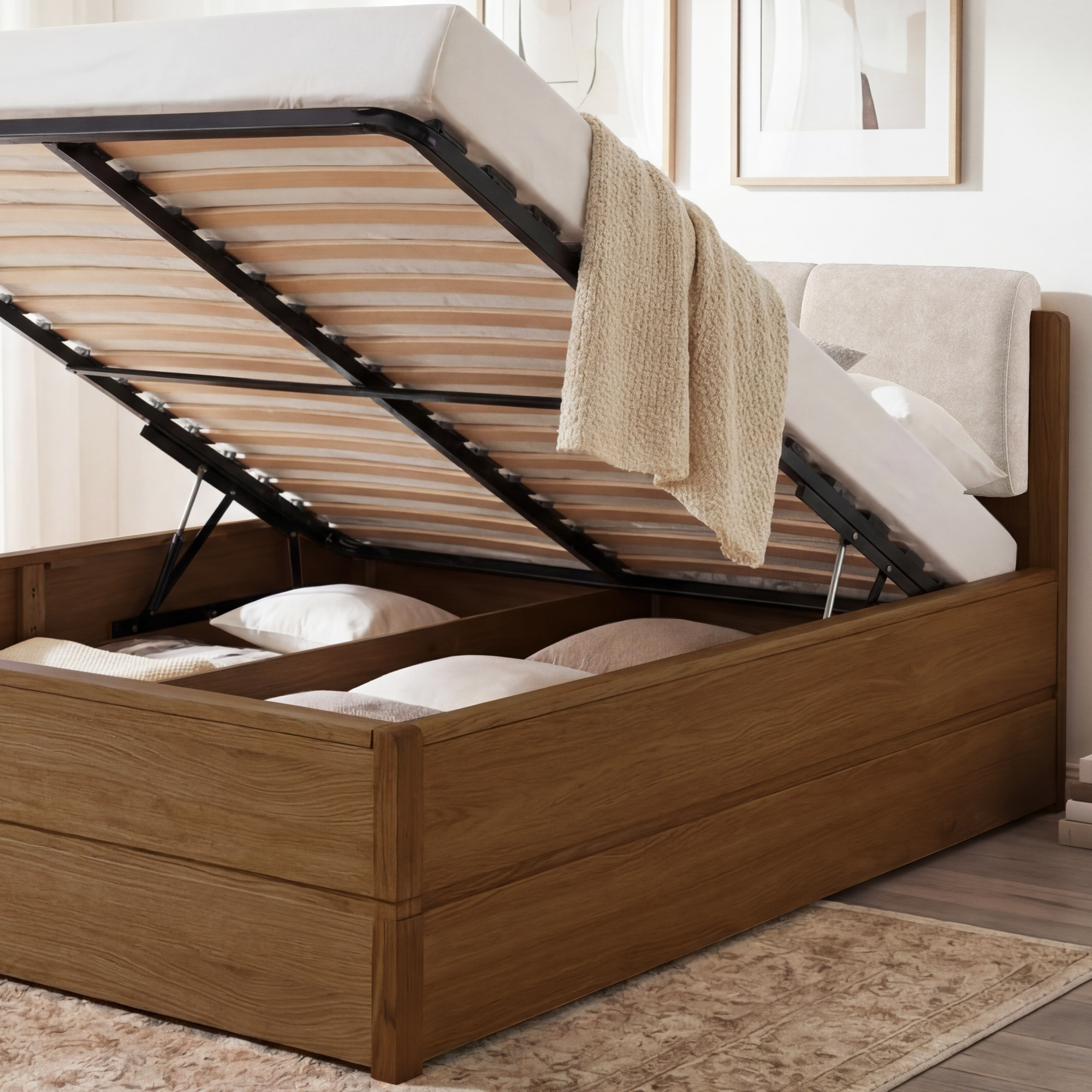 Im Lieferumfang ist ein hochwertiges Lattenrost enthalten. Die Matratze können Sie nach Ihren individuellen Vorlieben und Bedürfnissen separat dazukaufen. - Wie funktioniert der Stauraum?