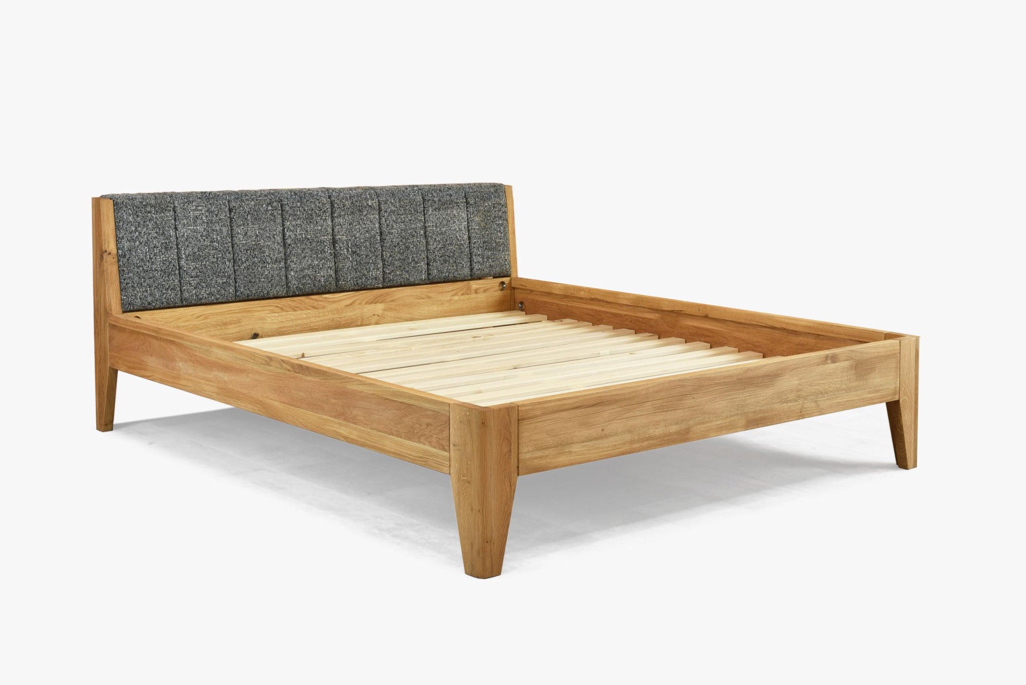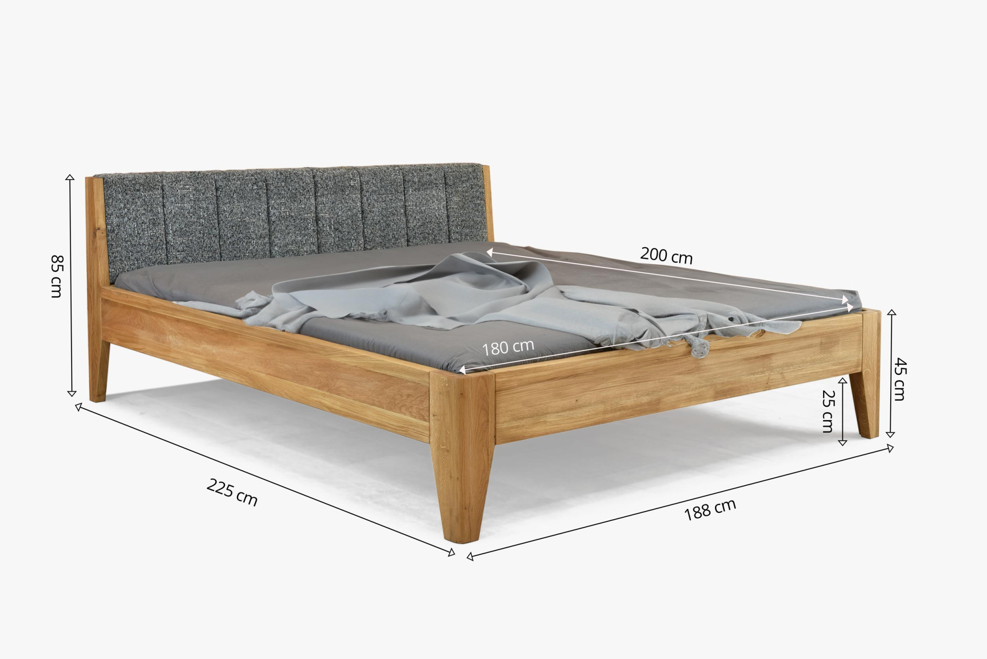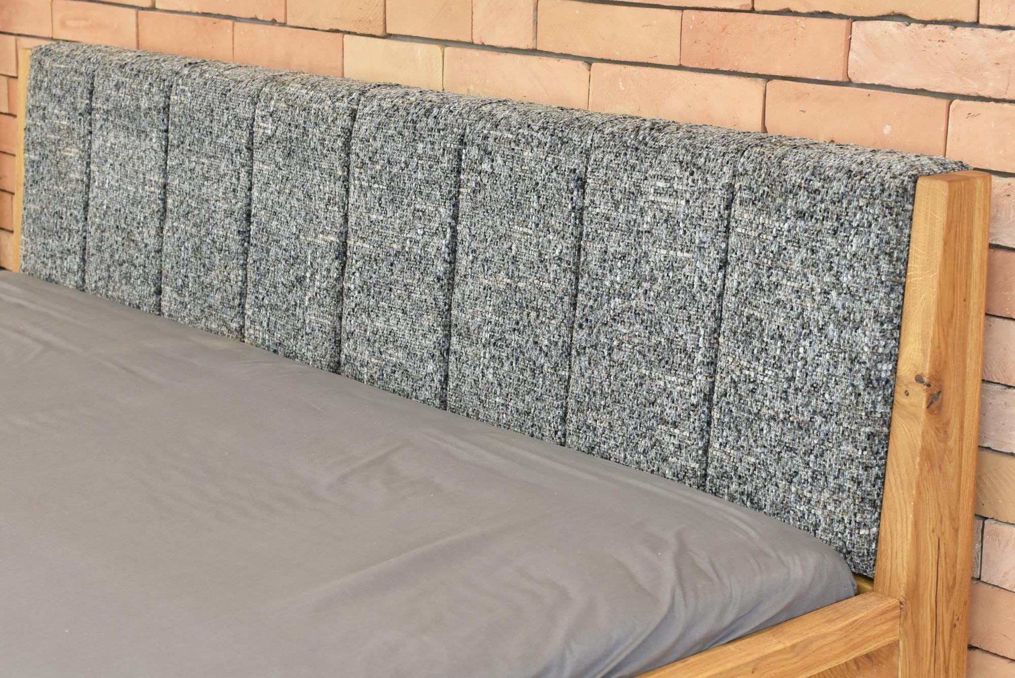 Das Stoffkopfteil des Bettes erhöht den Komfort und Luxus, es bietet eine weiche Unterstützung für Ihren Rücken beim Lesen oder Fernsehen. Dank des neutralen Designs und des natürlichen Farbtons des Eichenholzes lässt sich das Bett leicht mit weiterem Eichenmöbel aus unserem Angebot kombinieren, was Ihnen ermöglicht, ein harmonisches und stilvolles Interieur zu schaffen.