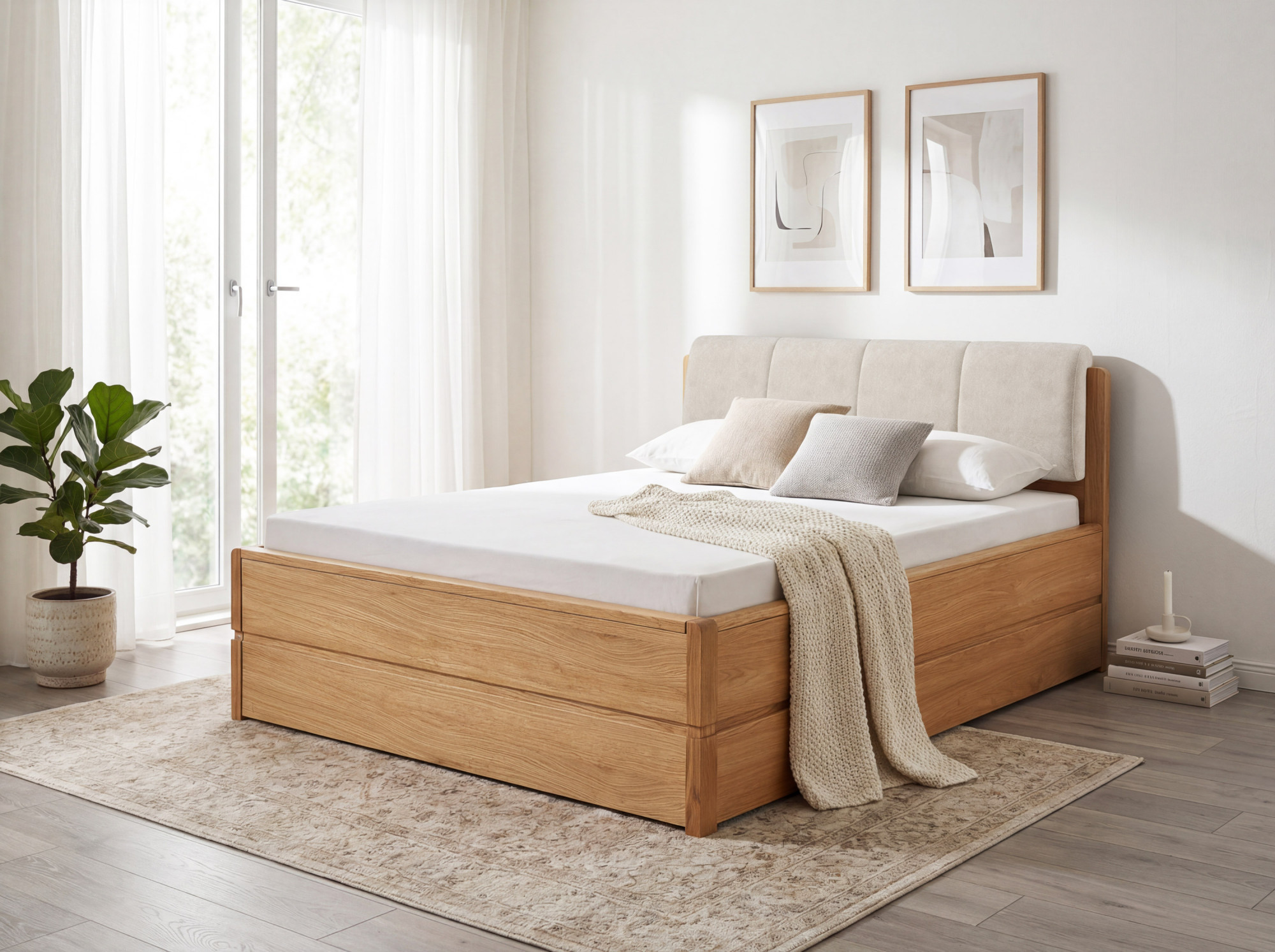 Massives Eichenholz+Furnierbett Helsinki 160 x 200 cm mit Stauraum – Stoffkopfteil D'oro