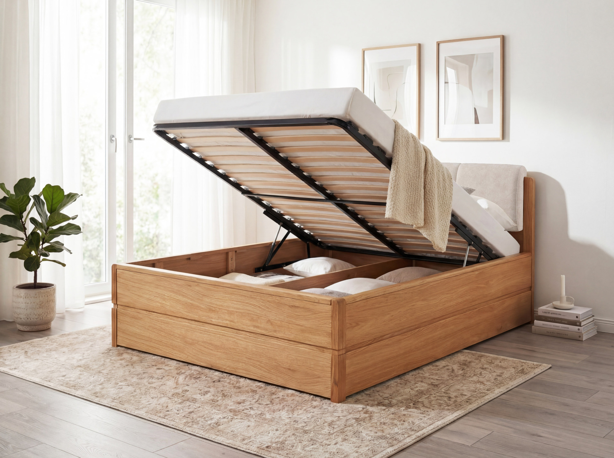 Im Lieferumfang ist ein hochwertiger Lattenrost enthalten. Die Matratze können Sie je nach Ihren Vorlieben und Bedürfnissen separat erwerben. - Wie funktioniert der Stauraum?