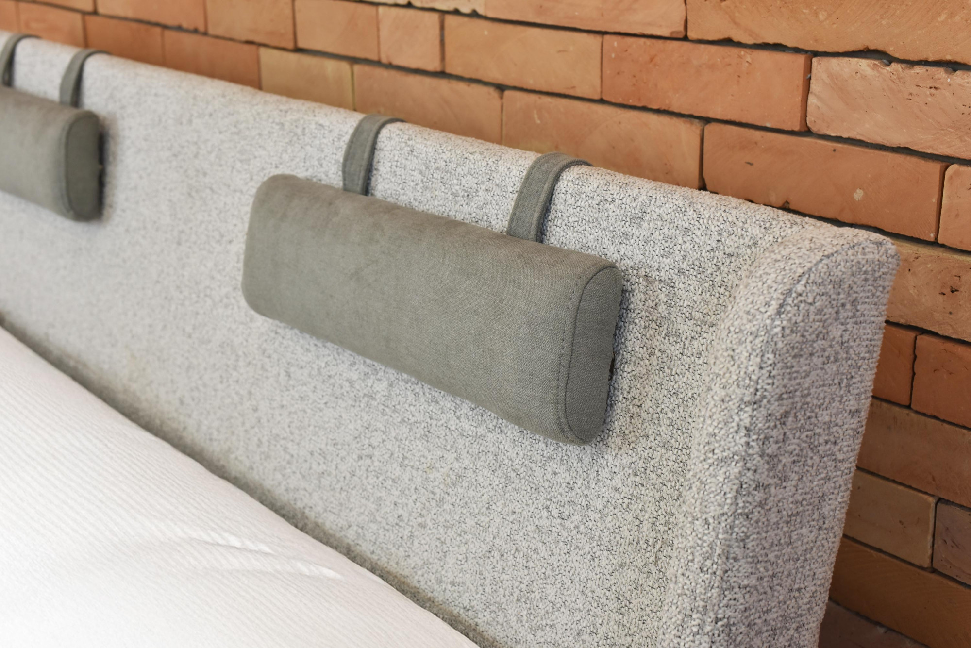 - Bezogener Betthaupt: Moderner grauer Stoff.