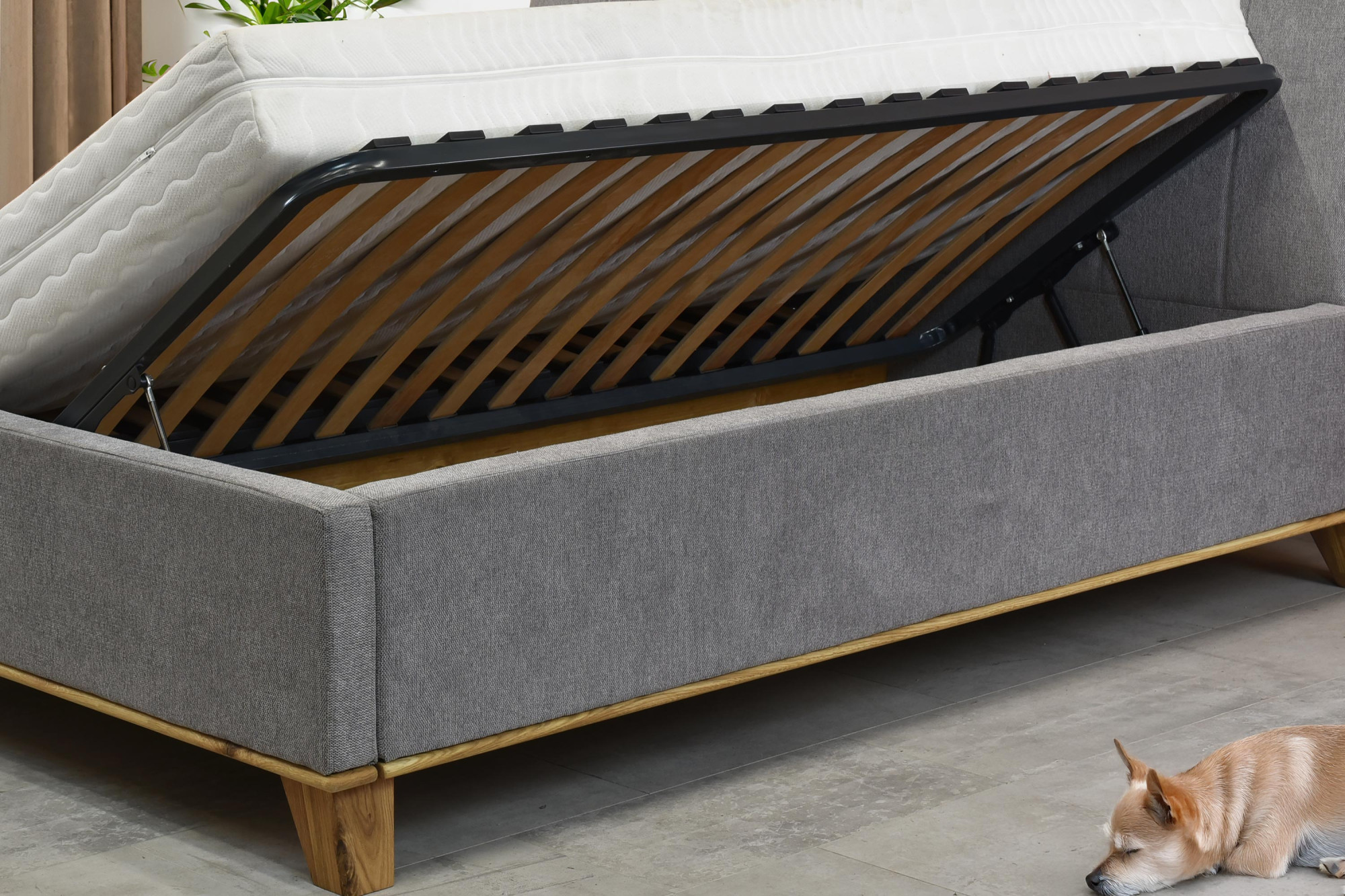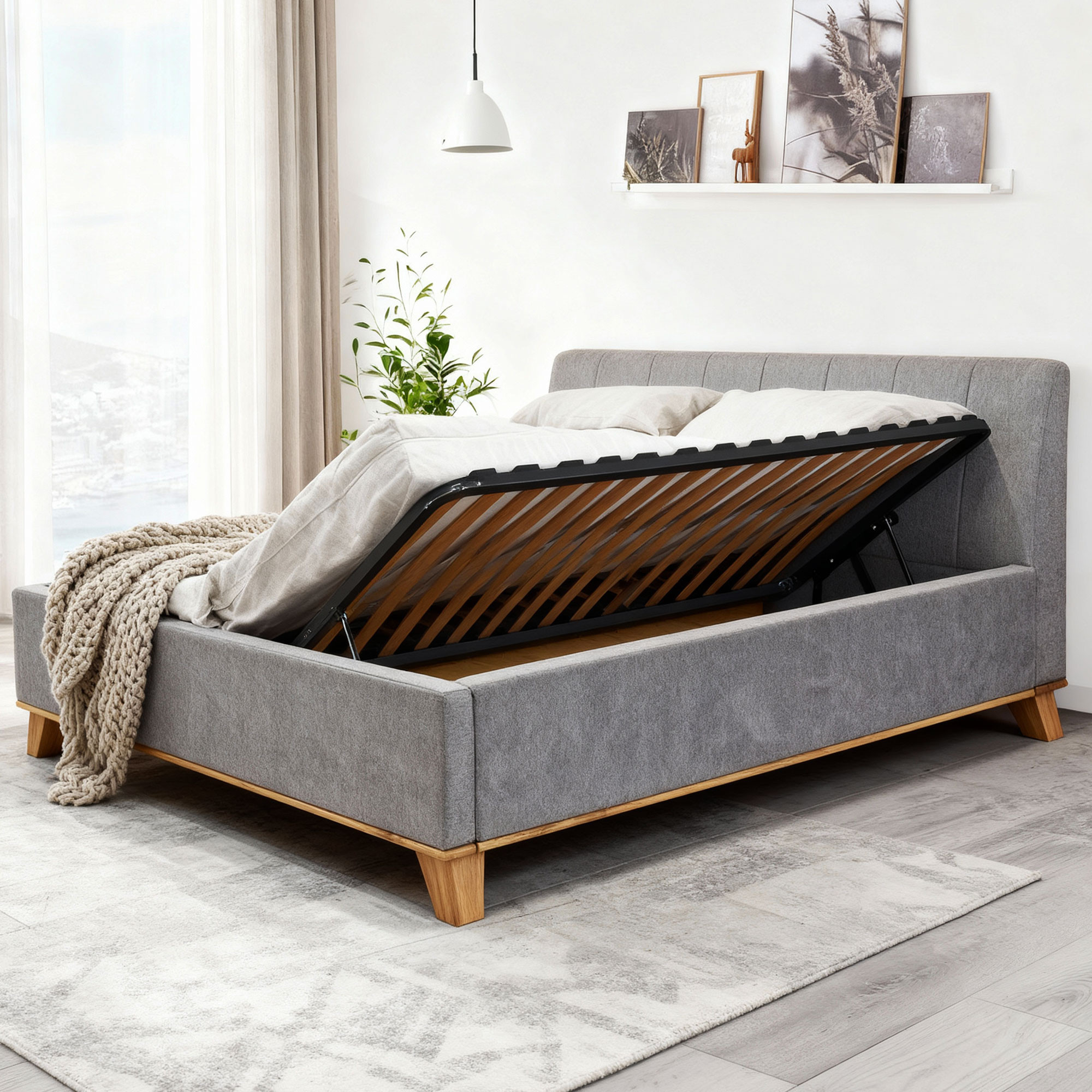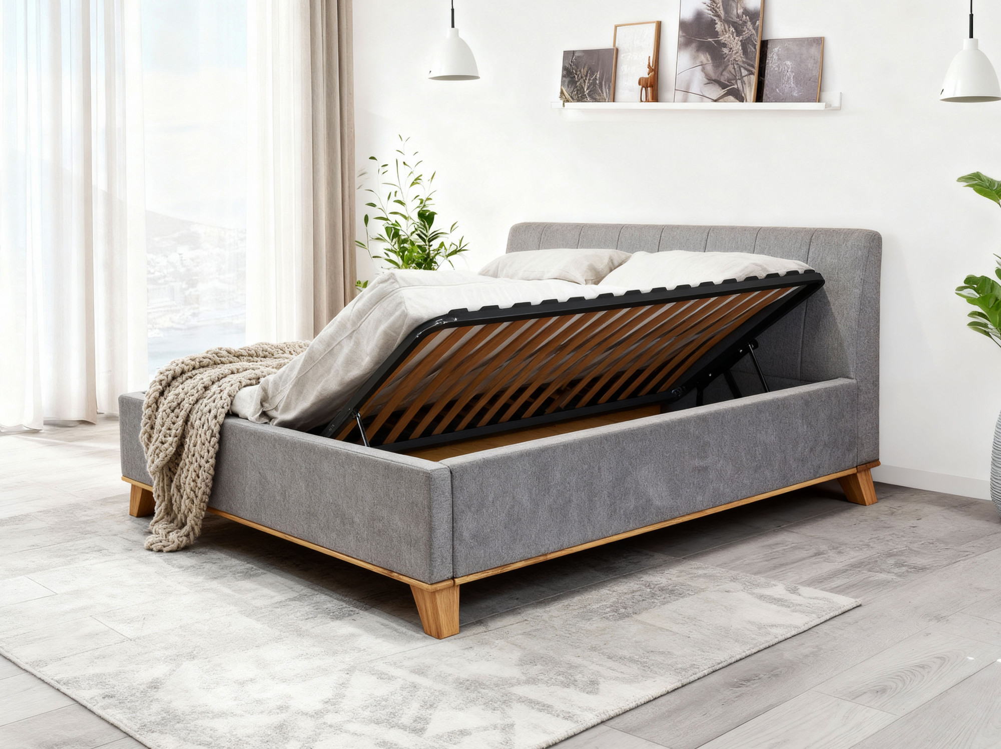 Doppelbett auf Füßen mit Stauraum 180 x 200 cm ist die ideale Kombination aus elegantem Design, Funktionalität und erschwinglichem Preis. Dank luftigem Design mit Holzfüßen wirkt es modern und ermöglicht gleichzeitig eine problemlose Reinigung des Bodens, da sogar ein Saugroboter problemlos darunter passt. Die dezente grau-braune Farbe des Bezugsstoffs ergänzt den Eichenrahmen und die Füße, was eine harmonische Kombination natürlicher Töne und zeitlosen Stils schafft. Im Lieferumfang sind Lattenroste enthalten, die eine richtige Belüftung der Matratze und gesunden Schlaf fördern. In das Bett kann eine Matratze mit den Maßen 180 x 200 cm oder zwei separate Matratzen 90 x 200 cm eingelegt werden; bei Federkernmatratzen wird die Variante mit zwei Matratzen für maximalen Komfort empfohlen. Der Stauraum öffnet sich seitlich und bietet somit einfachen Zugang zu Bettwäsche oder saisonalen Gegenständen. Da das Produkt zerlegt geliefert wird, ist der Transport und die anschließende Montage sehr einfach; alles wird durch eine übersichtliche Anleitung unterstützt.