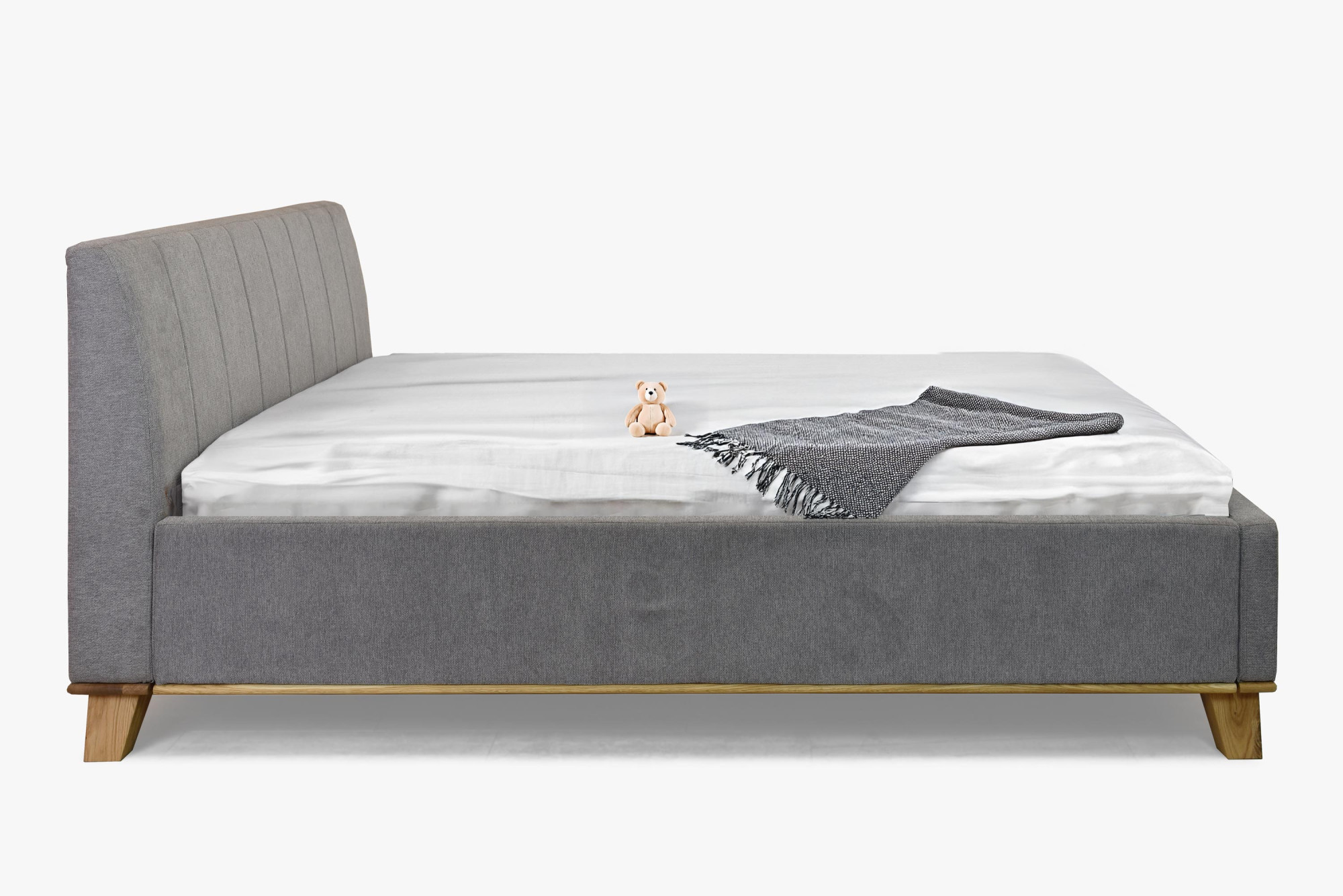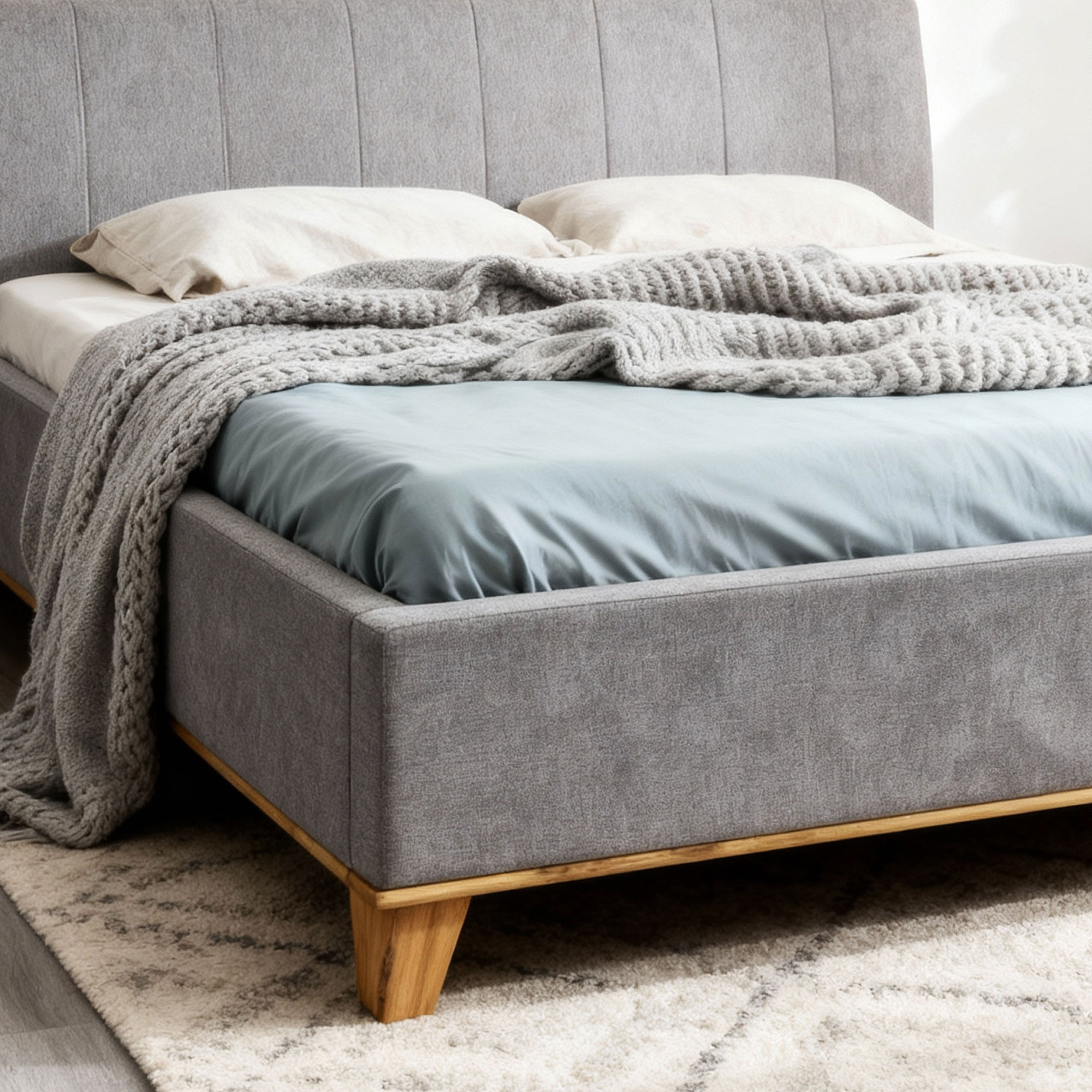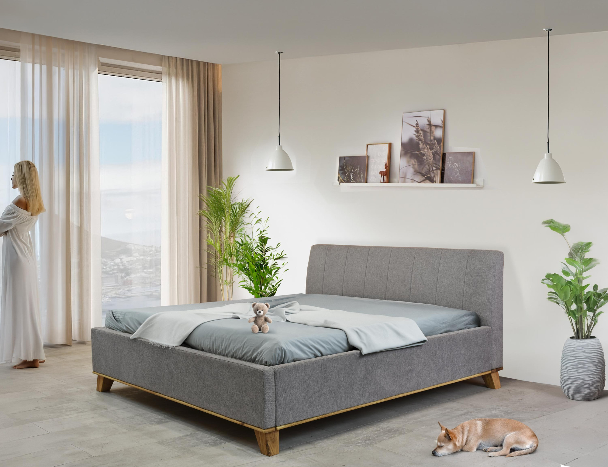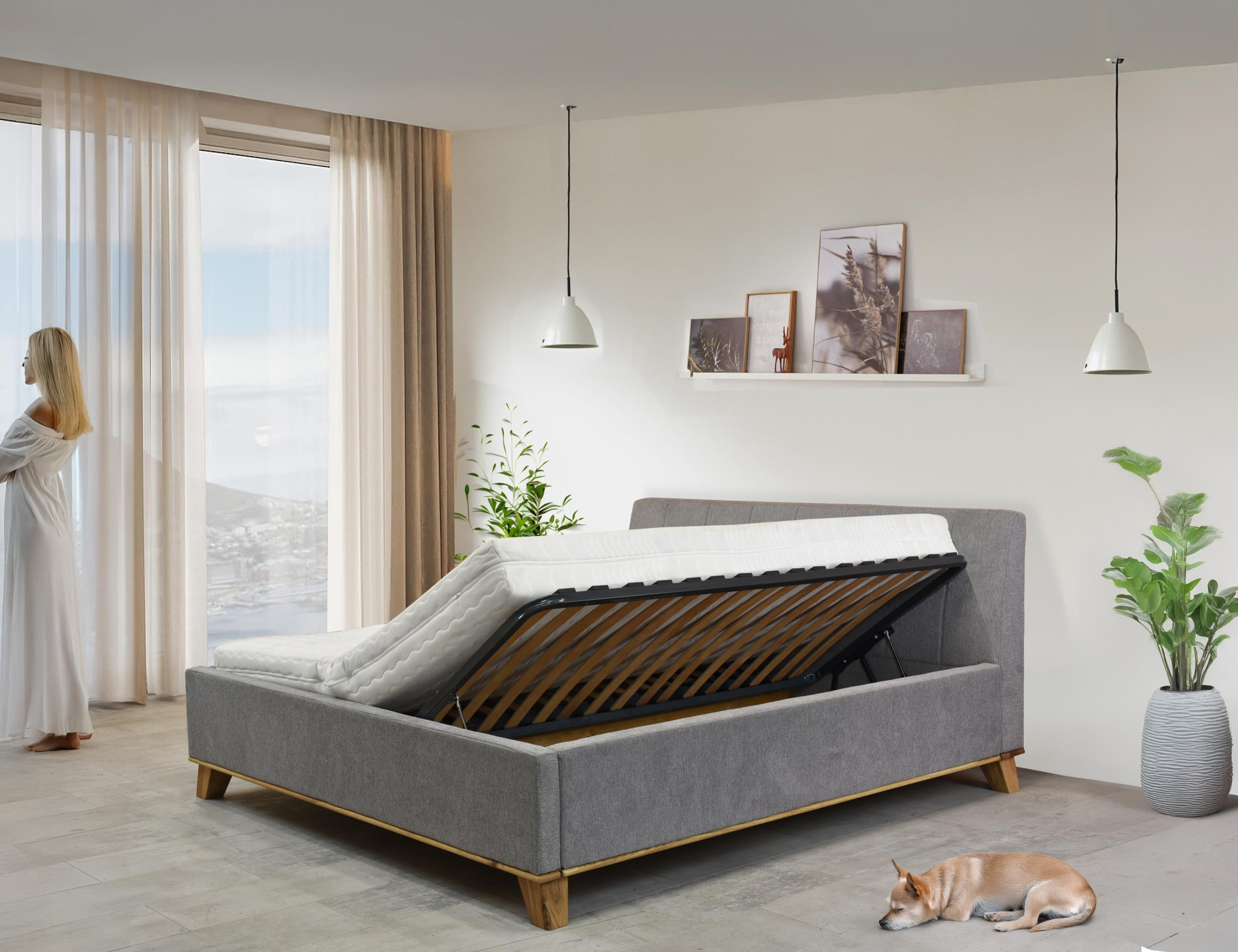 Doppelbett auf Füßen mit Stauraum 180 x 200 cm ist die ideale Kombination aus elegantem Design, Funktionalität und erschwinglichem Preis. Dank luftigem Design mit Holzfüßen wirkt es modern und ermöglicht gleichzeitig eine problemlose Reinigung des Bodens, da sogar ein Saugroboter problemlos darunter passt. Die dezente grau-braune Farbe des Bezugsstoffs ergänzt den Eichenrahmen und die Füße, was eine harmonische Kombination natürlicher Töne und zeitlosen Stils schafft. Im Lieferumfang sind Lattenroste enthalten, die eine richtige Belüftung der Matratze und gesunden Schlaf fördern. In das Bett kann eine Matratze mit den Maßen 180 x 200 cm oder zwei separate Matratzen 90 x 200 cm eingelegt werden; bei Federkernmatratzen wird die Variante mit zwei Matratzen für maximalen Komfort empfohlen. Der Stauraum öffnet sich seitlich und bietet somit einfachen Zugang zu Bettwäsche oder saisonalen Gegenständen. Da das Produkt zerlegt geliefert wird, ist der Transport und die anschließende Montage sehr einfach; alles wird durch eine übersichtliche Anleitung unterstützt.