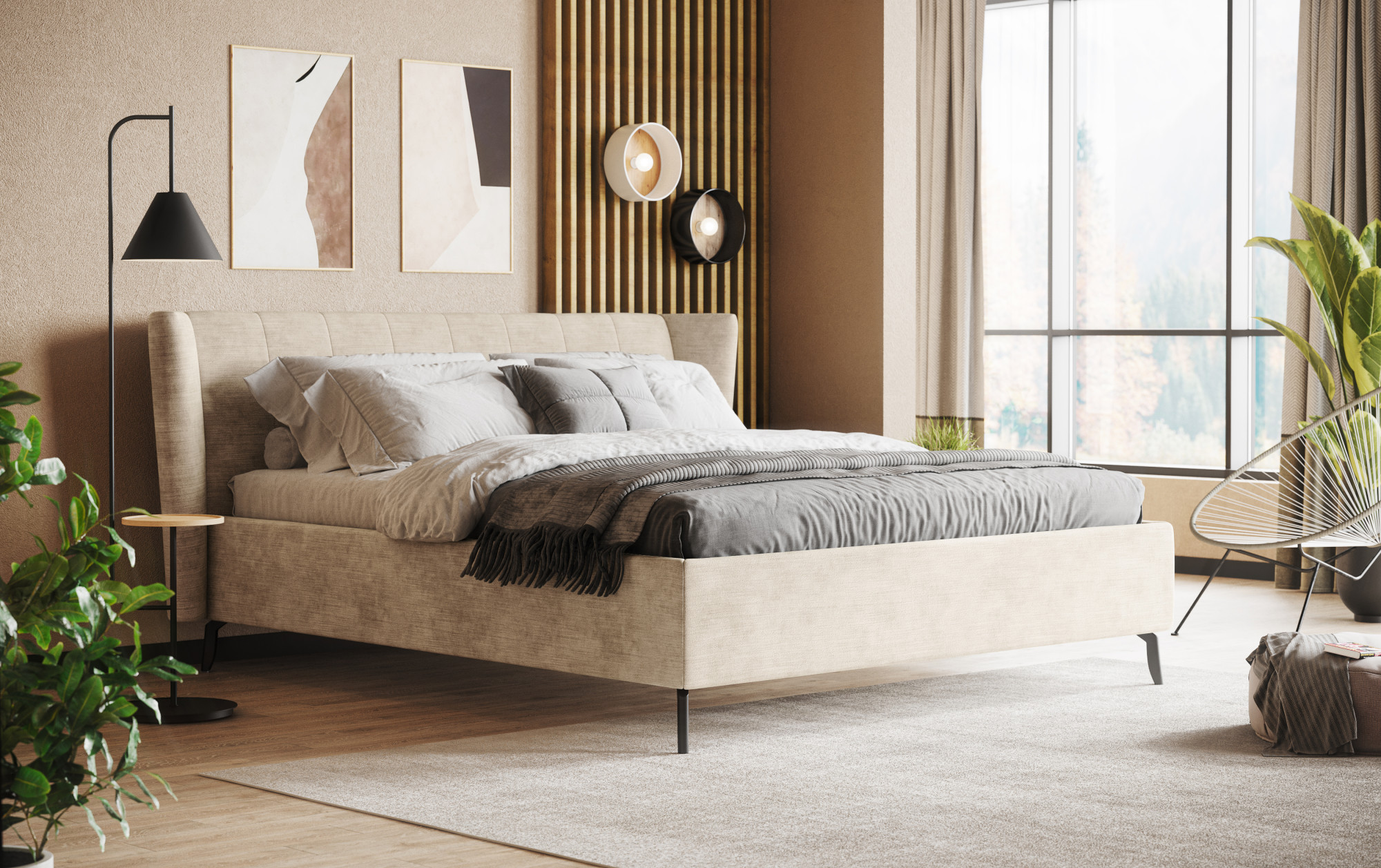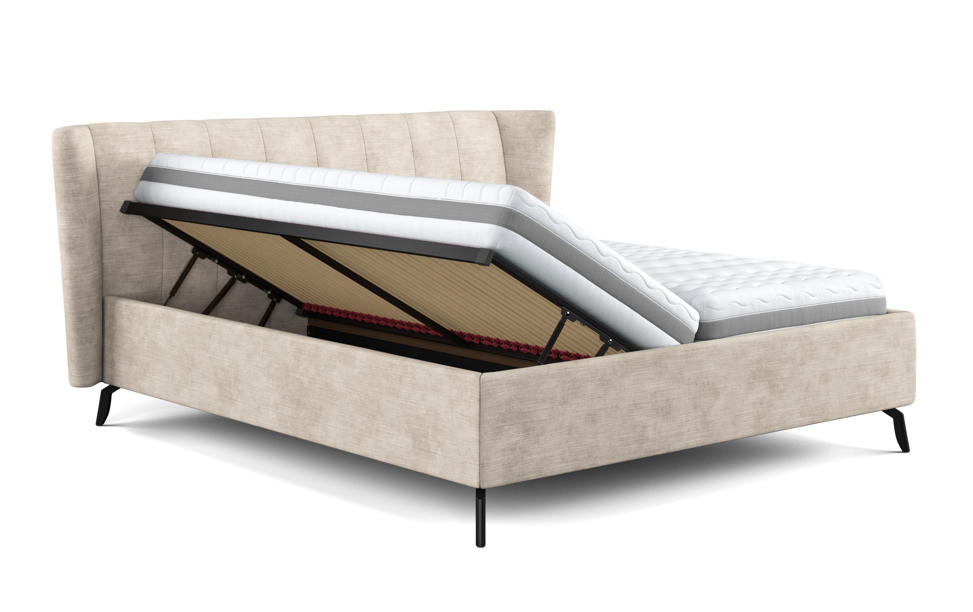 Das Bett besteht aus stabilem Massivholzrahmen, einem 28-lamelligen Lattenrost aus Hartholz mit Mittelstrebe und praktischem belüftetem Stauraum. Gegen Aufpreis besteht die Möglichkeit der Wahl von Beinarten (Metall oder massives Eichenholz).