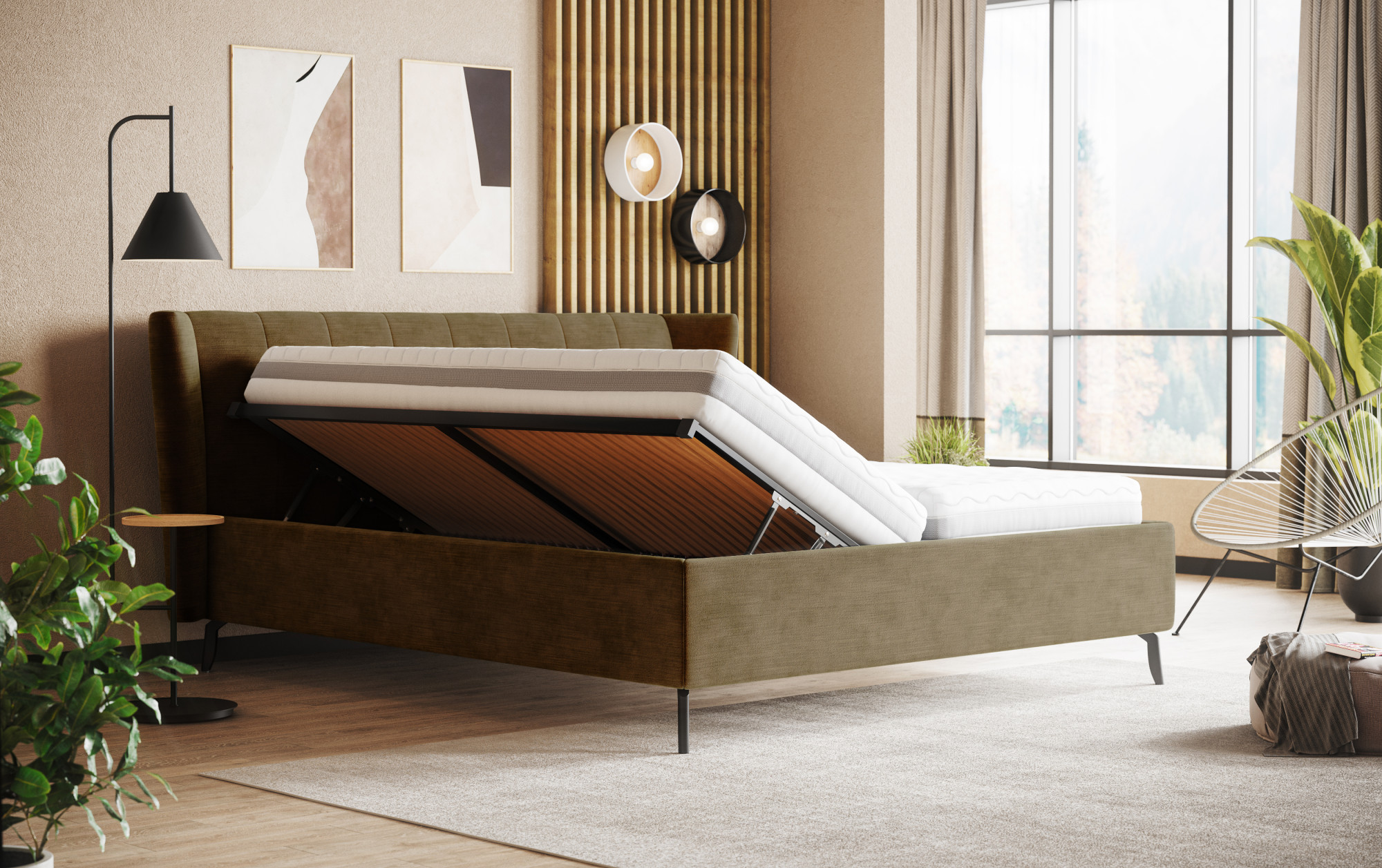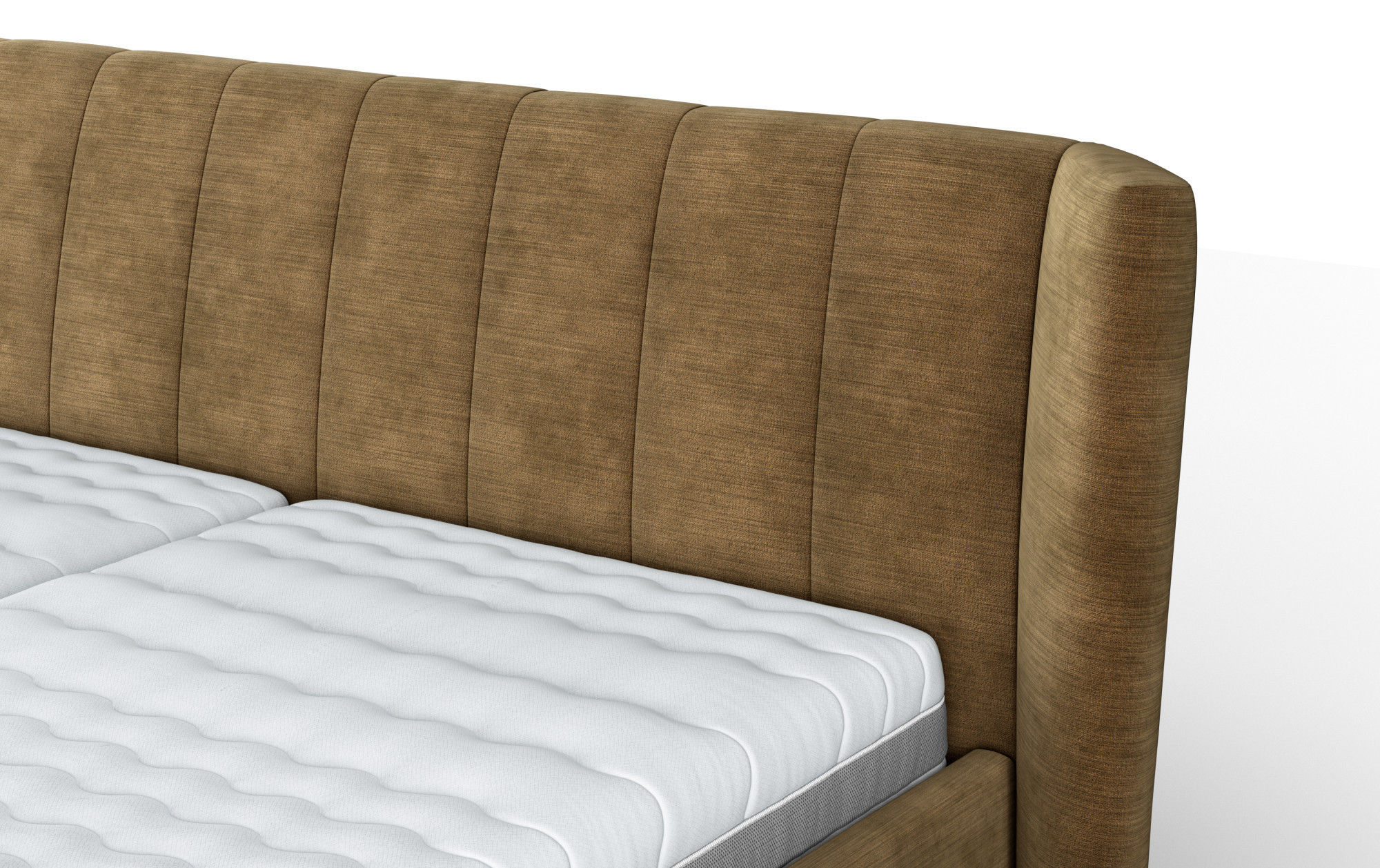 Zum Bett gehört eine stabile Konstruktion aus Massivholz, ein 28-lamelliges Lattenrost aus Hartholz mit Mittelstreifen und ein praktischer belüfteter Stauraum. Gegen Aufpreis besteht die Möglichkeit der Wahl der Fußarten (Metall oder massiv Eiche). Der Farbton des Bettes ist in elegantem Bronzeton, der sanft in braun-grüne Töne übergeht. Dieser raffinierte Farbton wirkt warm, modern und zugleich zeitlos, wodurch sich das Bett leicht mit verschiedenen Einrichtungsstilen kombinieren lässt – von natürlich bis modern-minimalistisch.