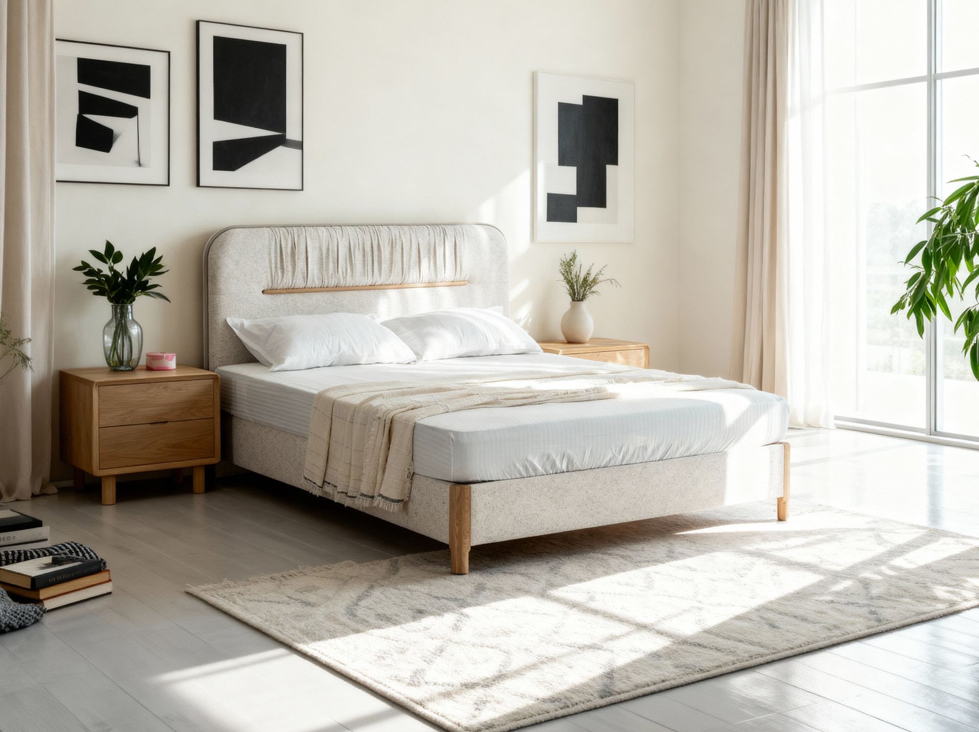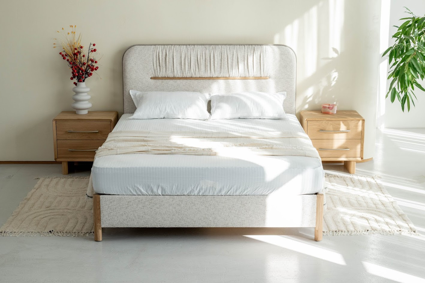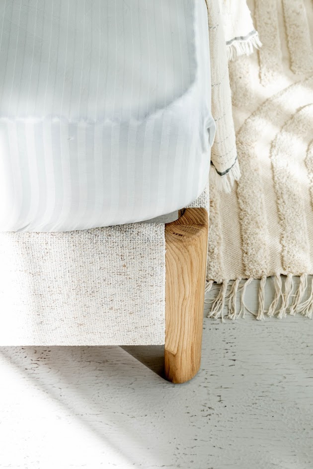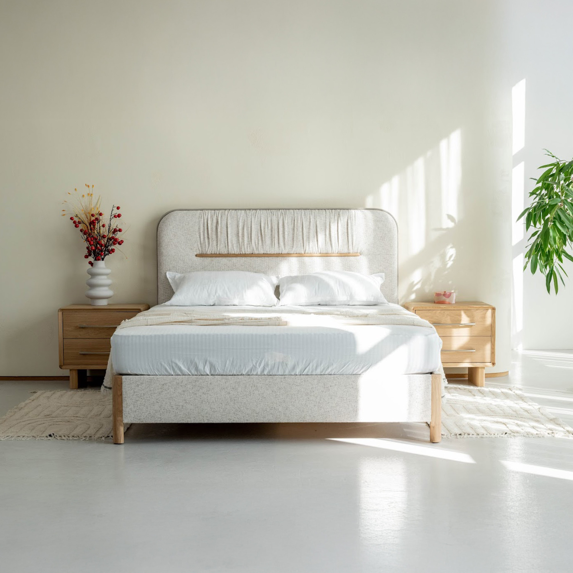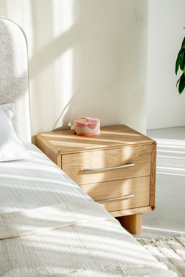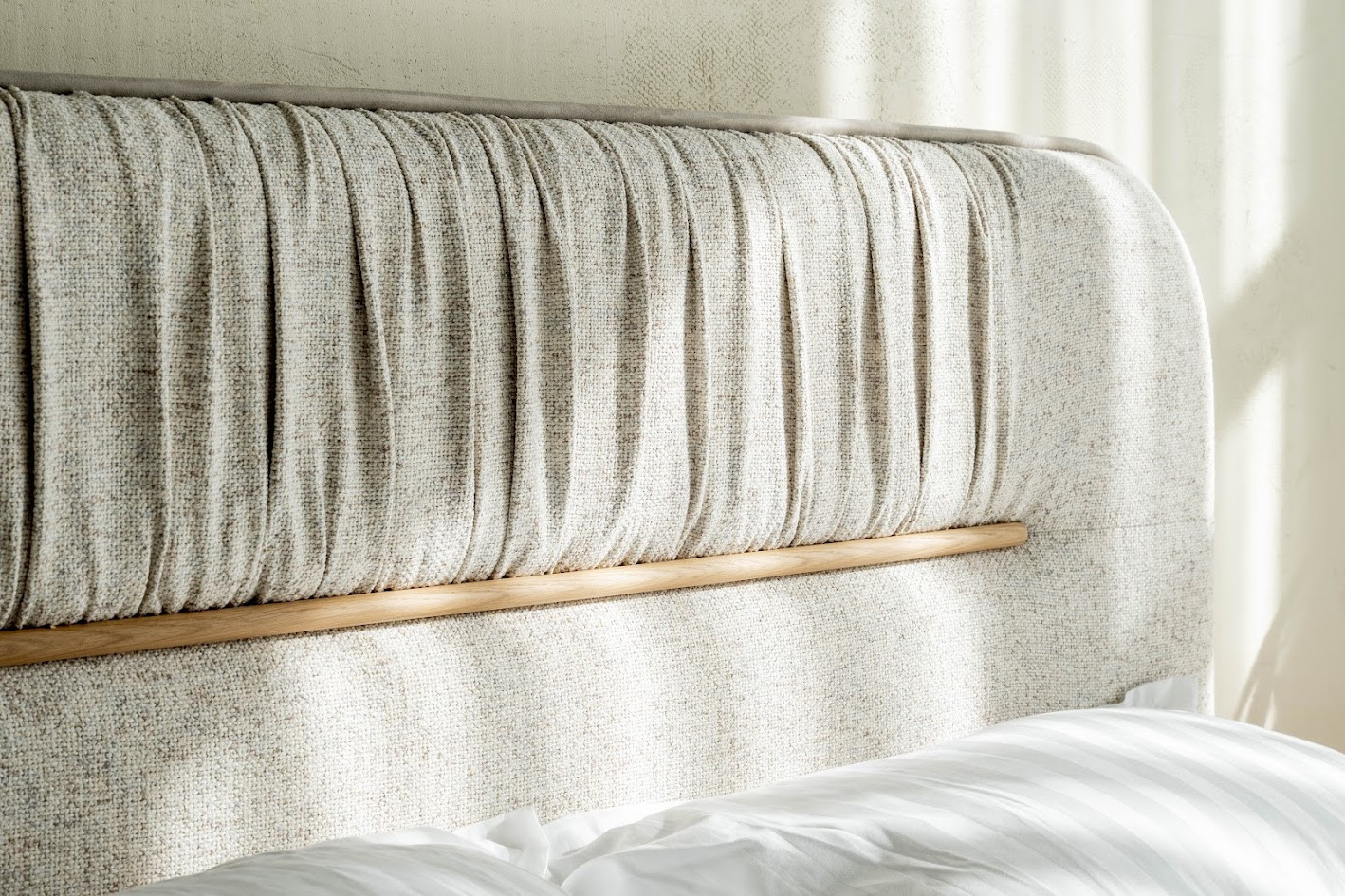 - Design: abgerundete Formen, natürliche Eichendetails und elegantes Kopfteil